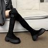 Krazing Pot Hejno podzimní zimní boty tlusté střední podpatky elastické kozačky plisovaná ozdoba ženy zahřejí kozačky na stehna