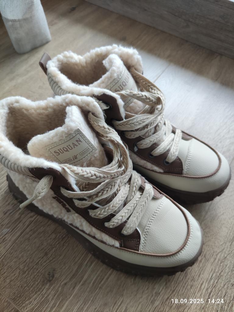 Dámské teplé vysoké tenisky s podšívkou z umělé kožešiny - hnědé a béžové kulaté špičky silná podrážka ležérní pohodlné boty