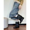 Cowhide Western Jeans Tube Boots Women's Pleated Pile Black Wipe Round Head Vintage Thick Heel Knight Martin Boots
