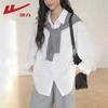 Women's Mid-Length White Polo Collar Casual Long-Sleeved Shirt