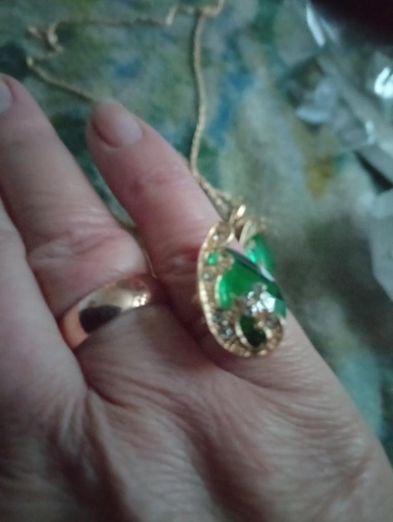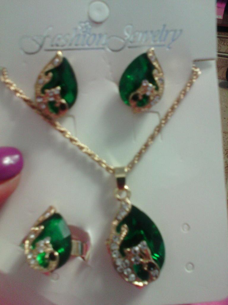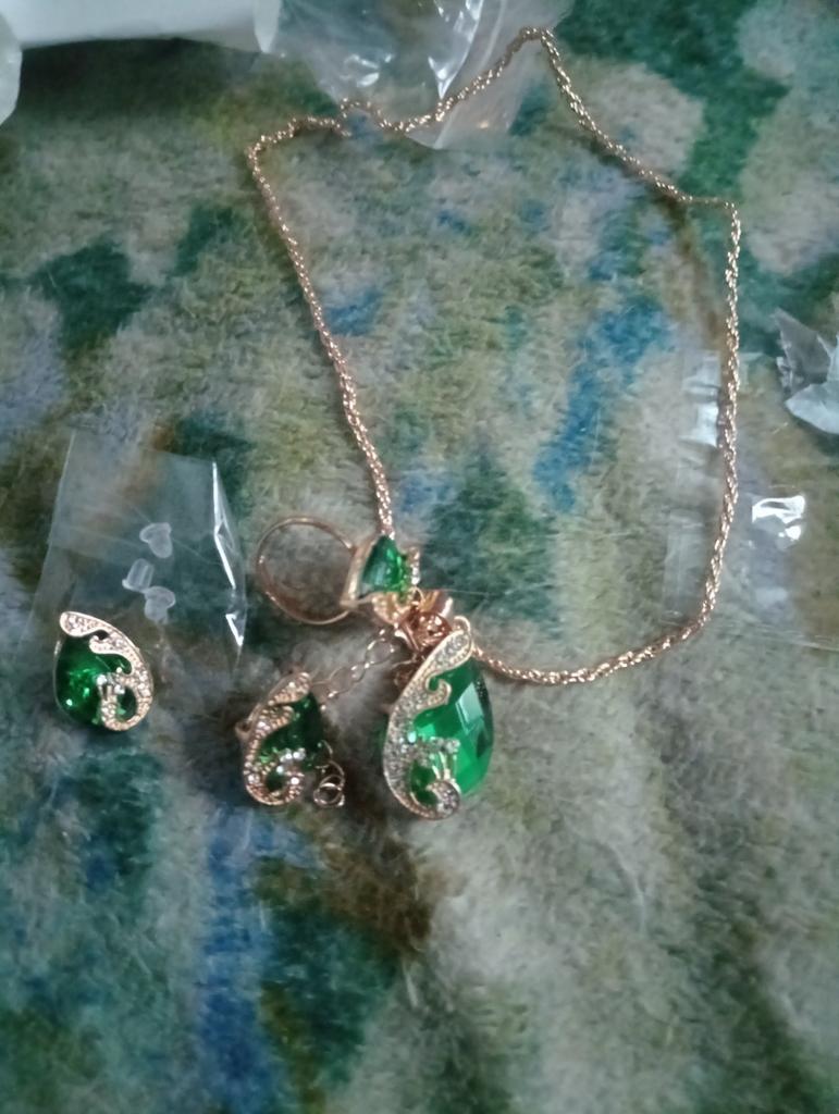A very nice set, the color green is great! The parcel went to Ukraine for 2.5 weeks. Everyone is satisfied, only one earring has a bent clasp, probably during shipping.