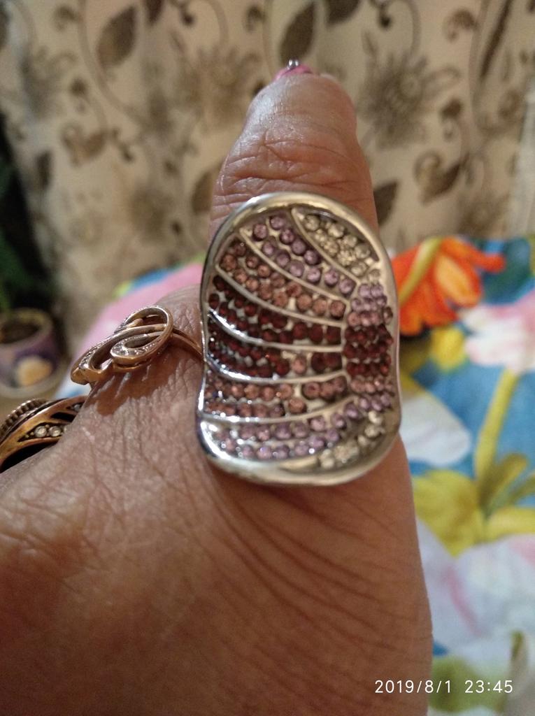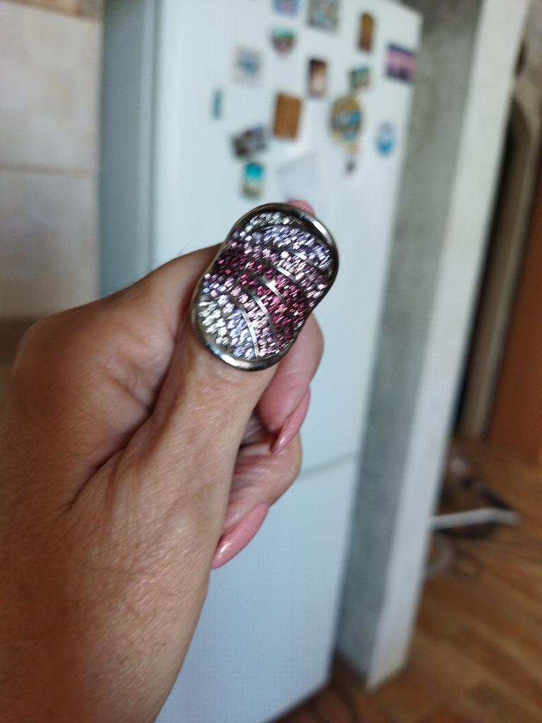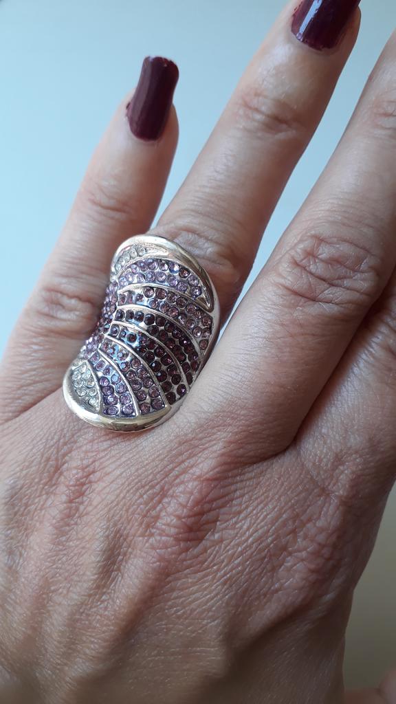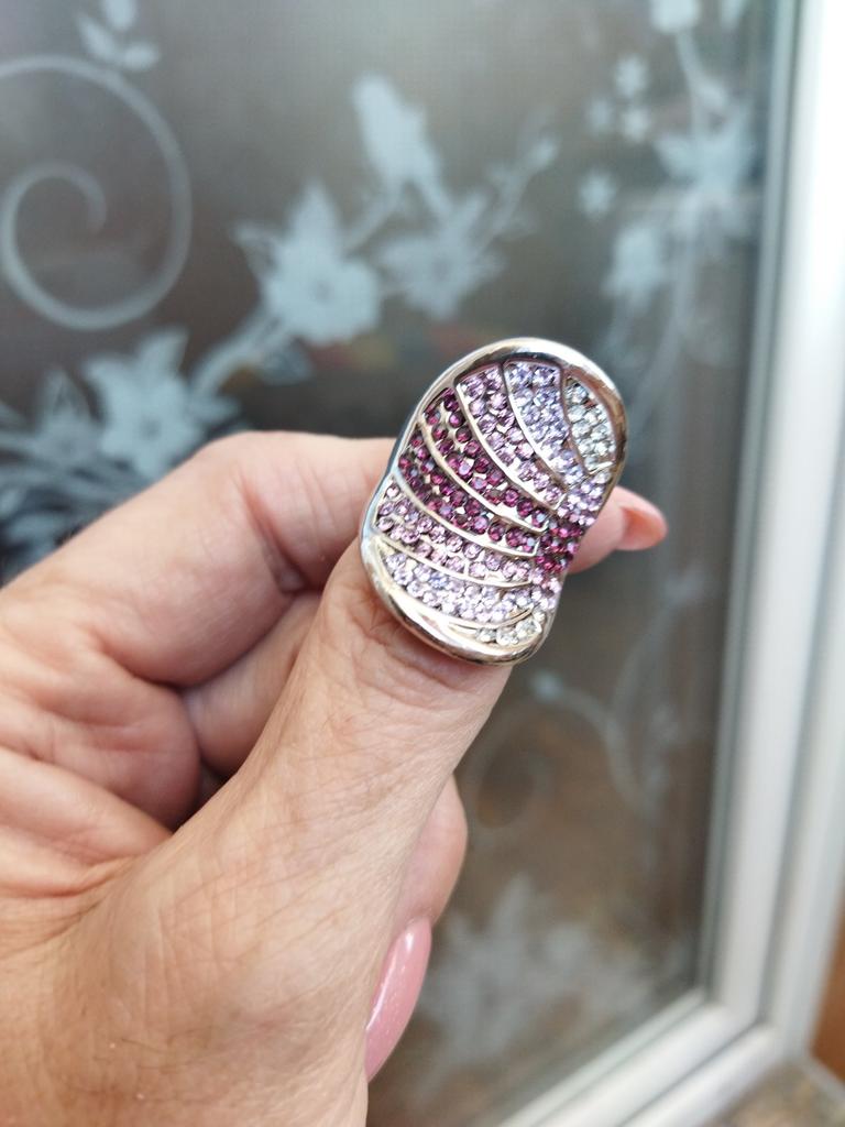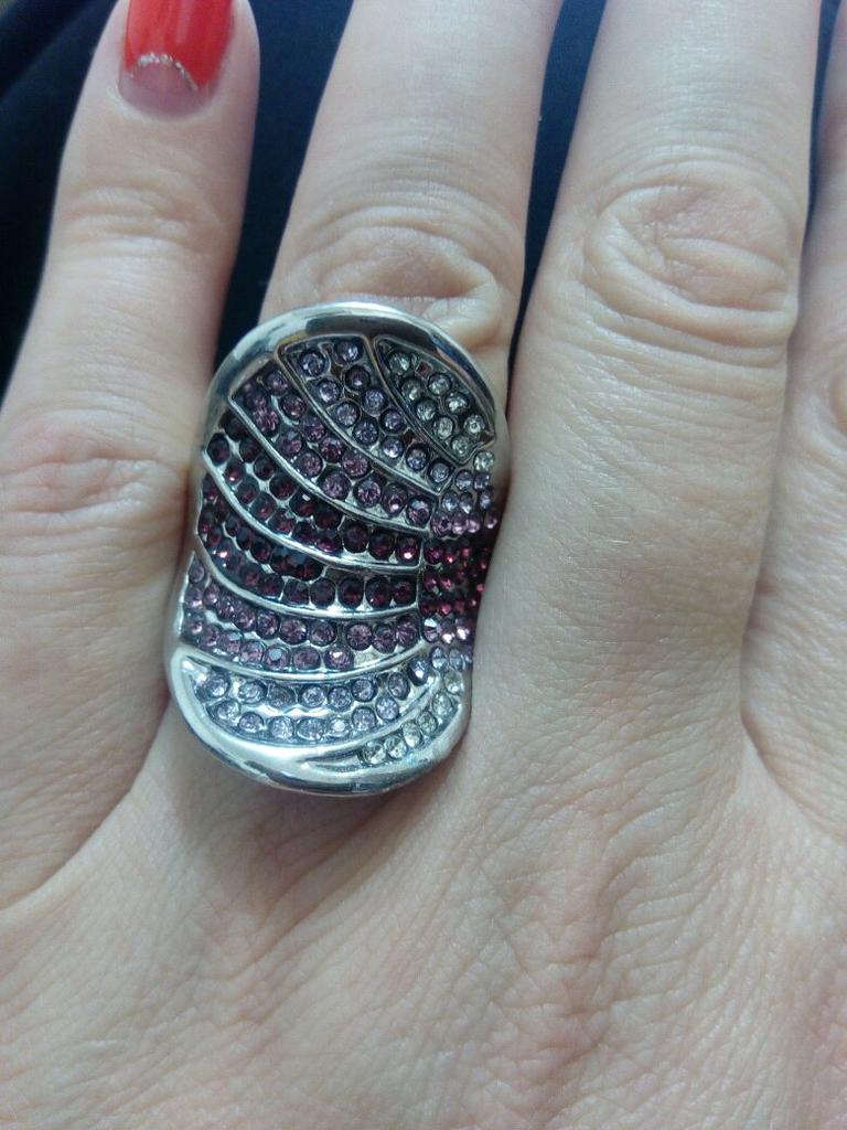 Beautiful large ring with many glitter stones in pink to purple colors.
