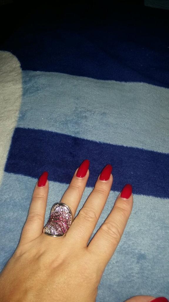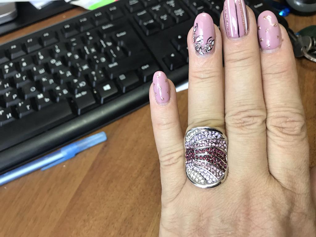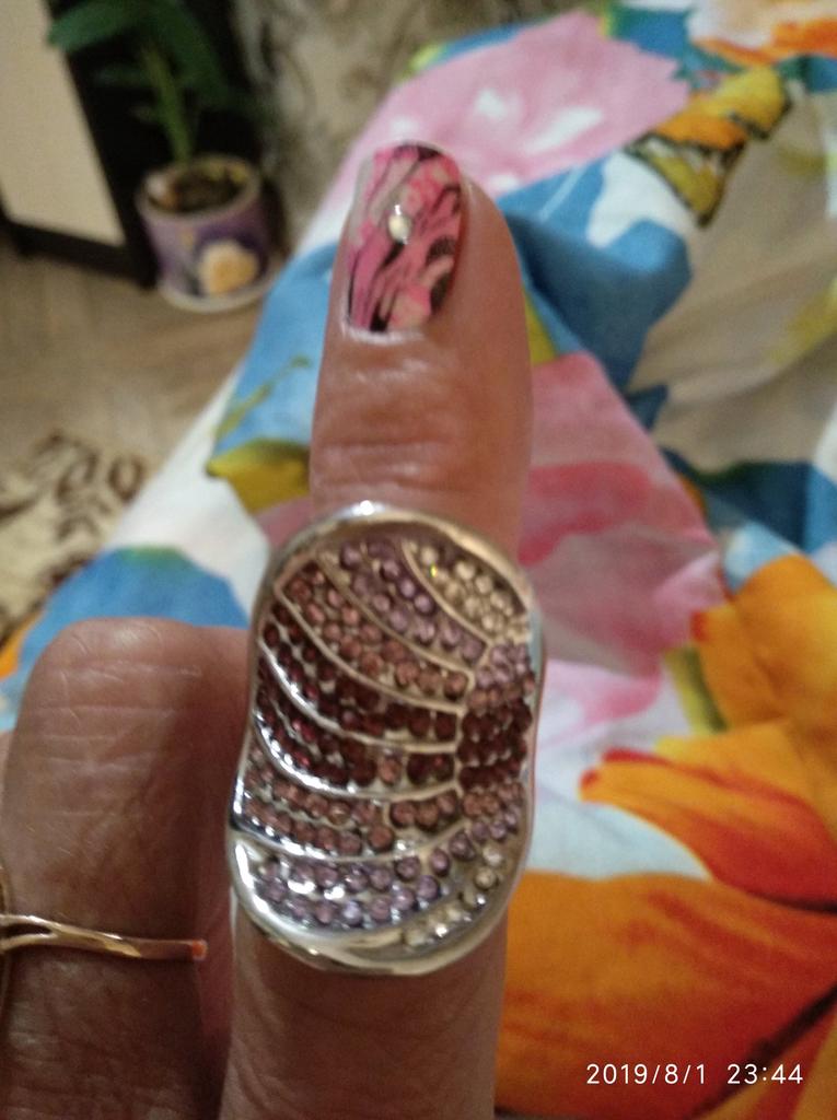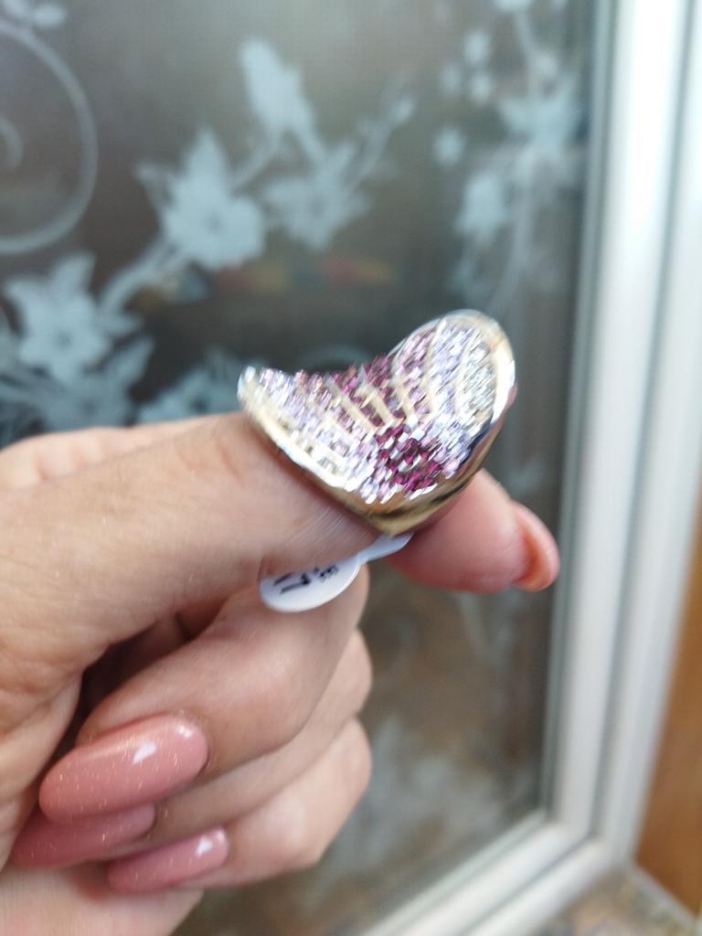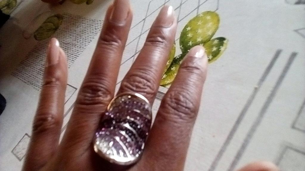 Beautiful large ring with many glitter stones in pink to purple colors.
