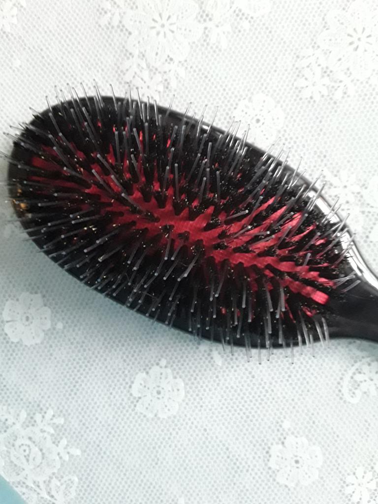 It's a real strong brush but very hard on the scalp. It actually feels feels like steel bristles but I looked closely and they're some kind of plastic but they have no protective ends.