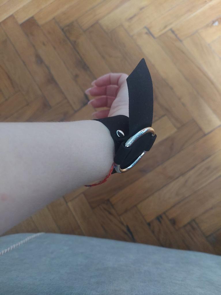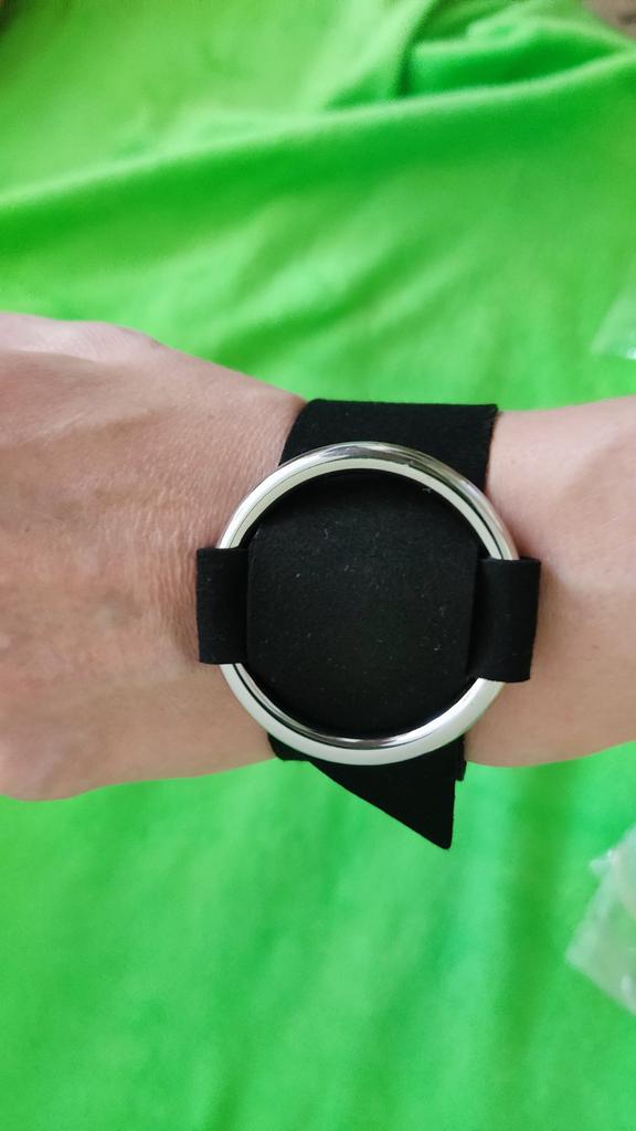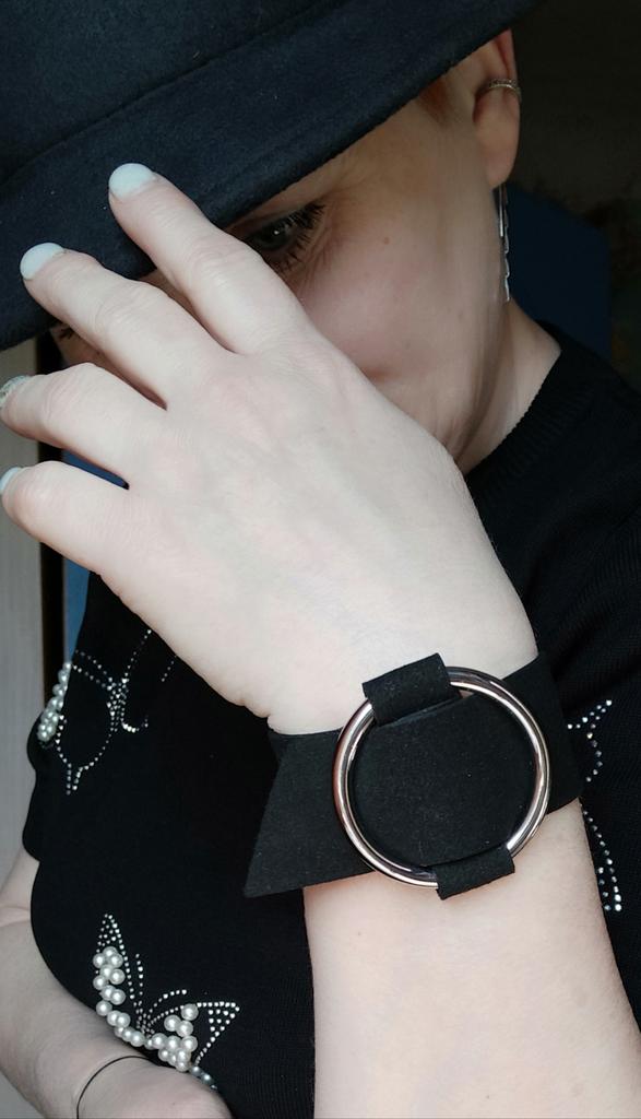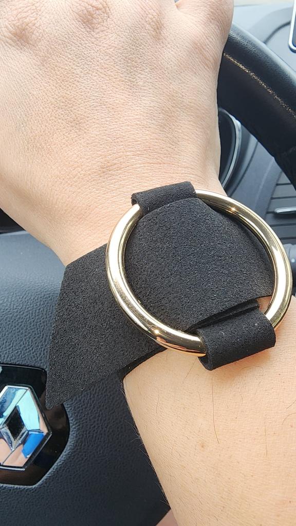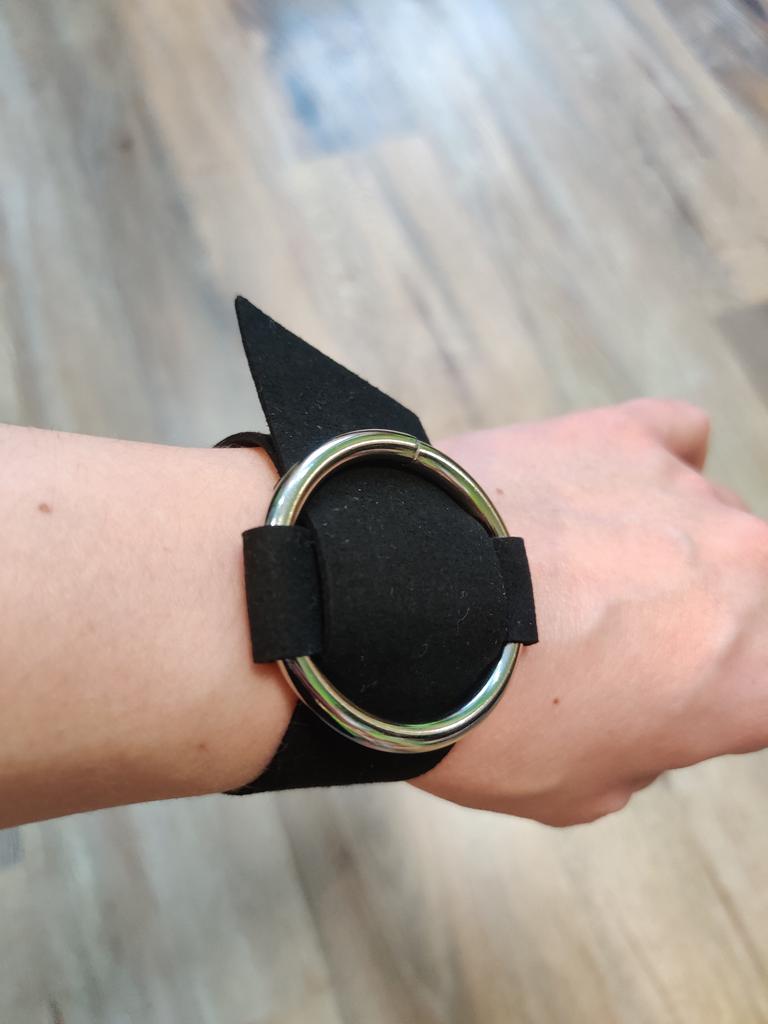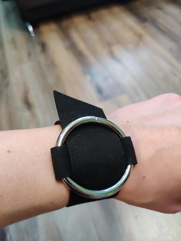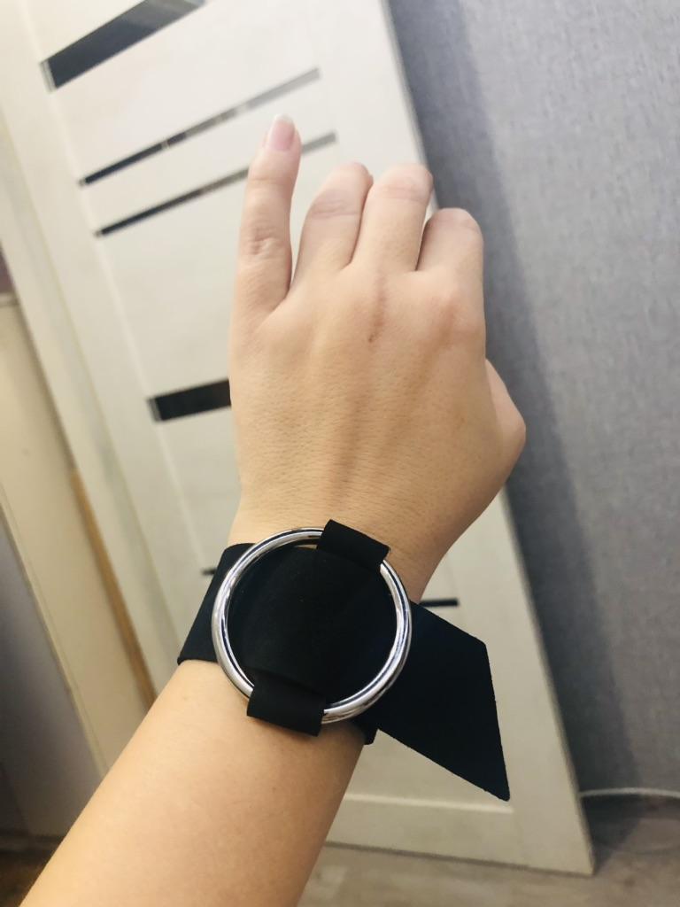 An interesting and very stylish bracelet, looks beautiful and unusual on the hand. The leather is black suede, which gives this product an even more sophisticated look. Will suit the Casual clothing style. I want to add that these bracelets are about the length of a small hand)