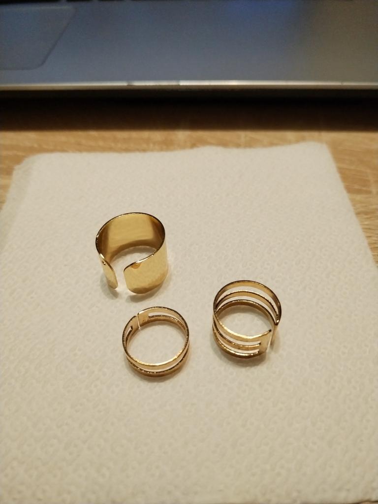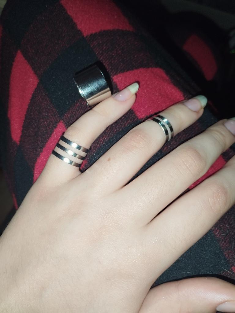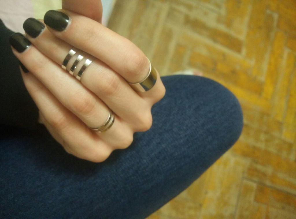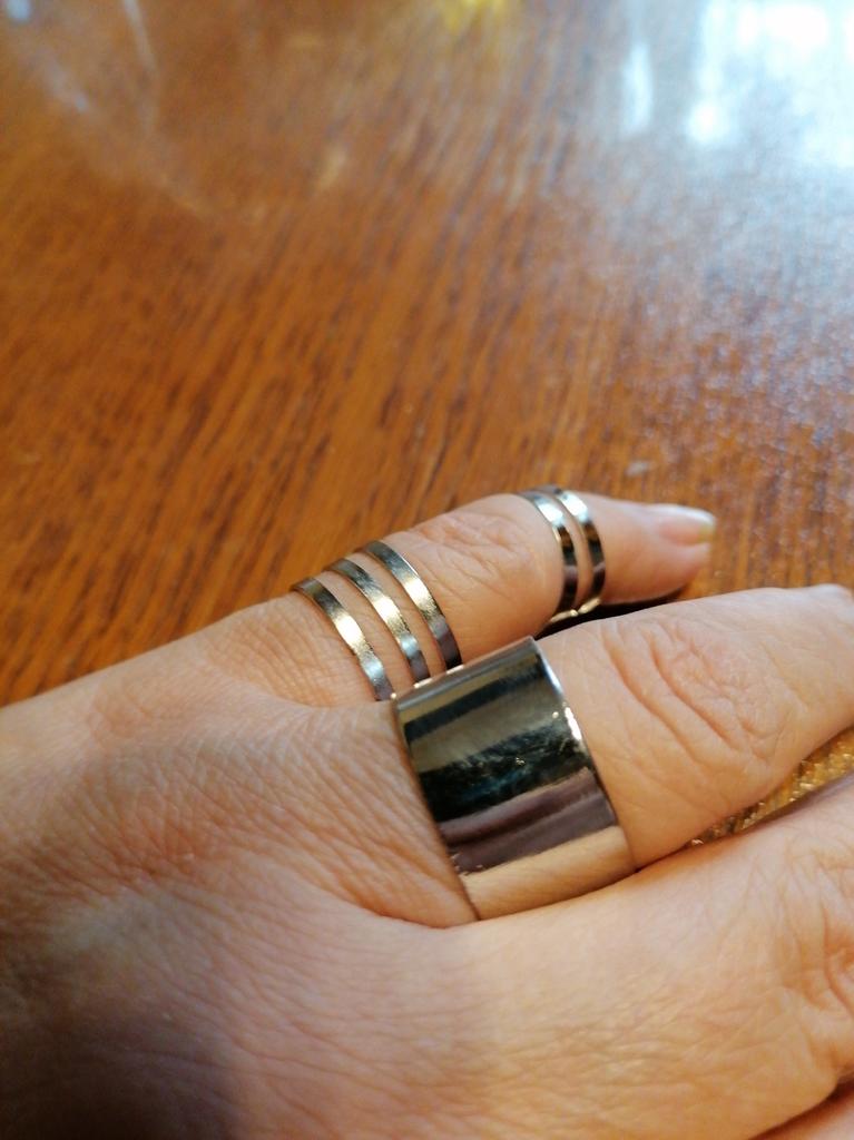 Ordinary rings made of thin metal. It is easy to bend if necessary (however, I was too lazy to adjust the size of the third ring). The edges are a little sharp, so there is a chance of getting cut. It will most likely leave marks on the fingers and the metal will change color quite quickly, but for the price it is still a great option for minimalist rings