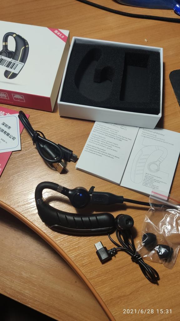 The order arrived on the 28th day. The packaging is intact, neat with protection from damage. The device connected to the mi note 9 normally without problems. The earphone was charged at 90%. The sound is adjustable and clear. The caller can be heard very well. I couldn't hear myself, but they say that I can hear normally. Listening to music is also at a good level, but I bought the device for conversations. Therefore, I recommend the seller. Thank you Joom. I used it for 8 hours every day for a week, after which 20% of the charge remained and a charging reminder in Chinese started. I am satisfied with the device.