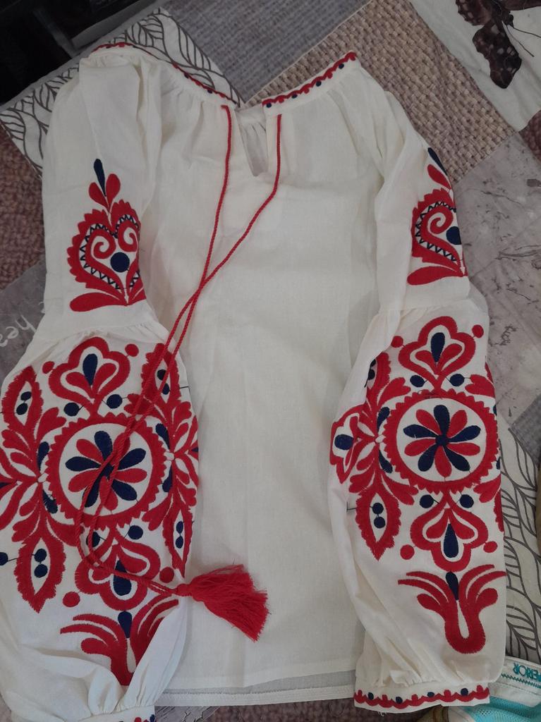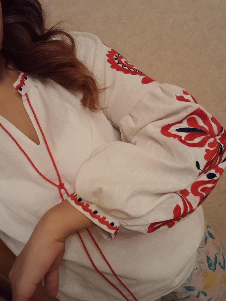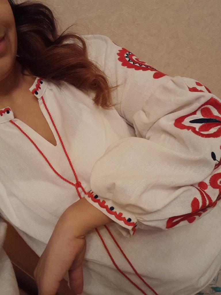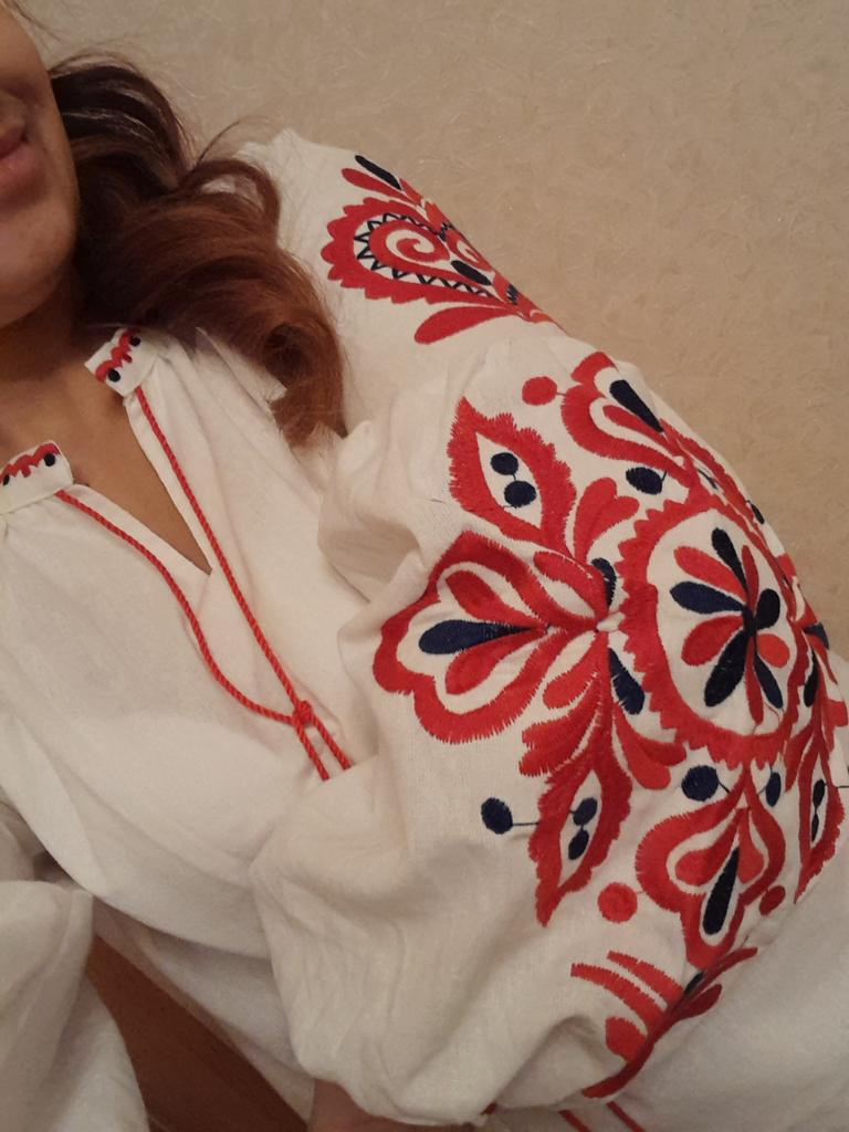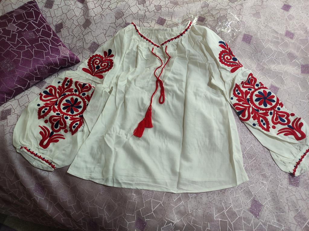 Blouse is cool. Ukrainian stylish embroidered shirt))) The material looks like satin, but it is unclear. The sleeves are very voluminous. It will be chic to look at jeans.