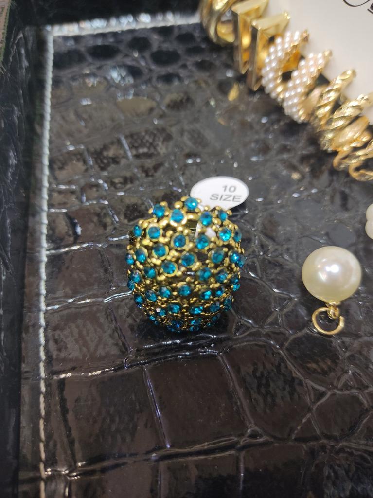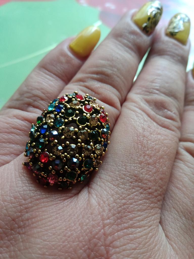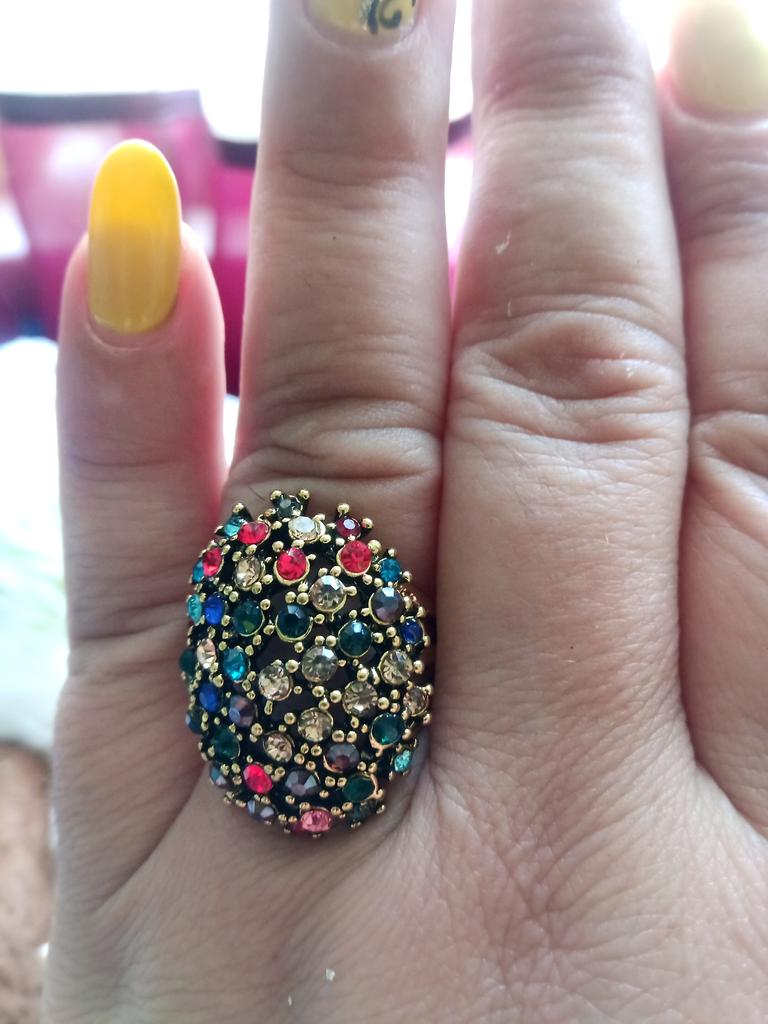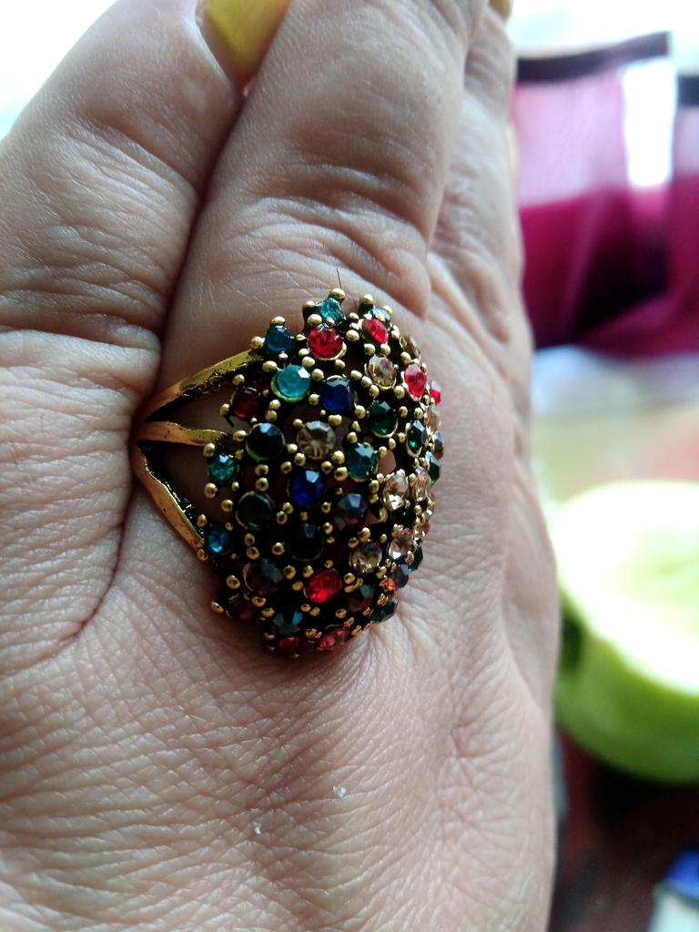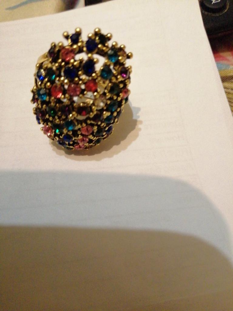 The ring is super, all the stones are in place, though chaotically arranged, on one side all the yellow stones on the other more colored