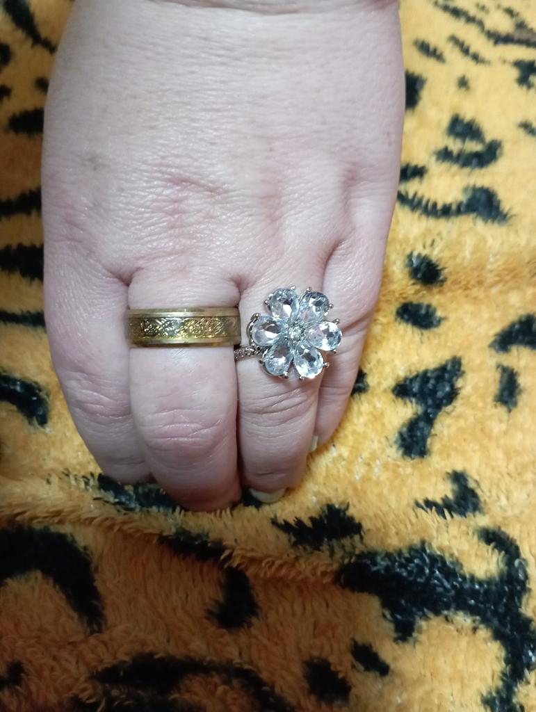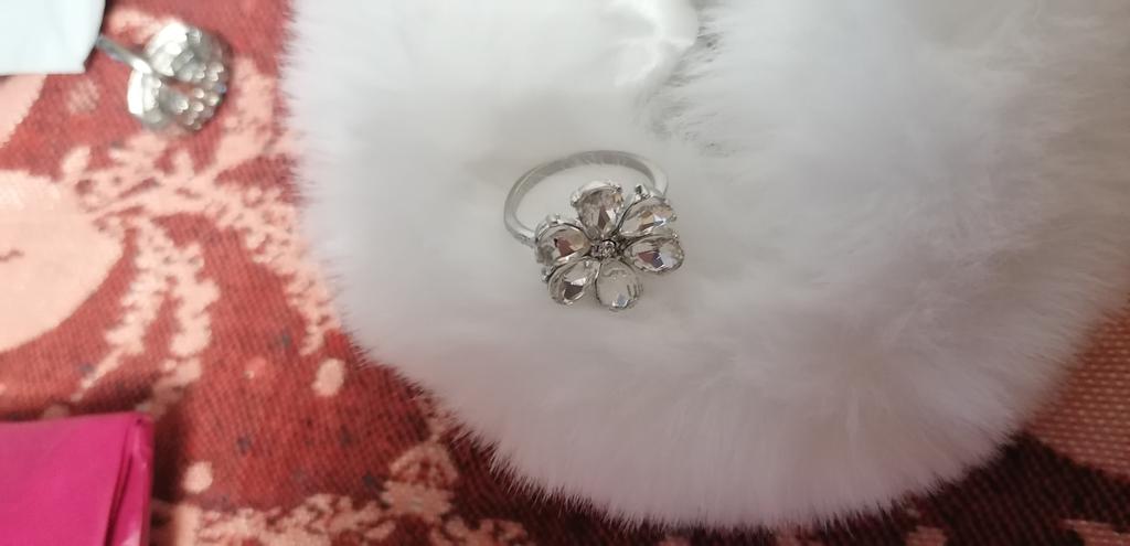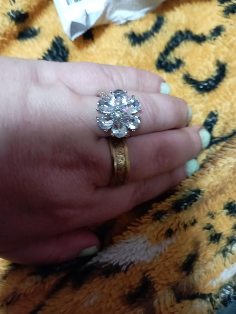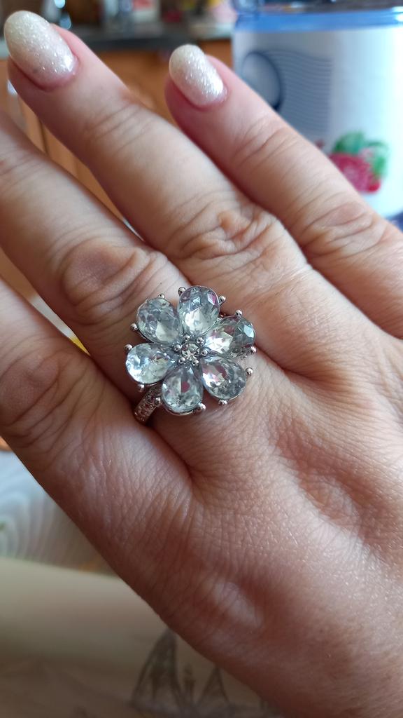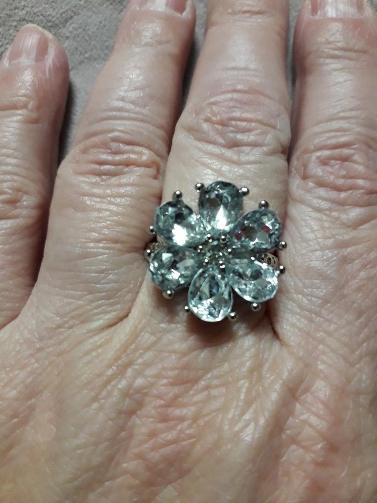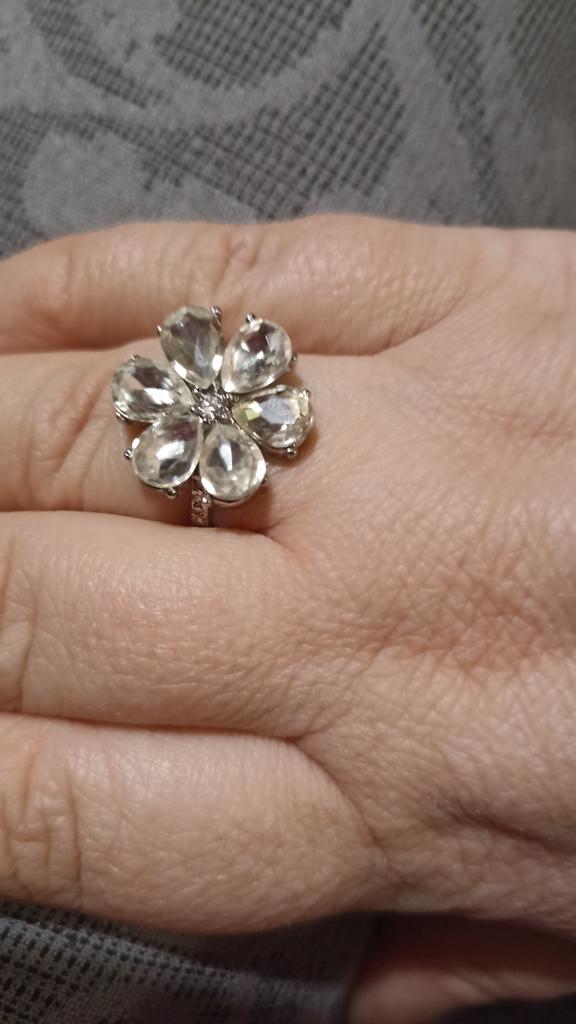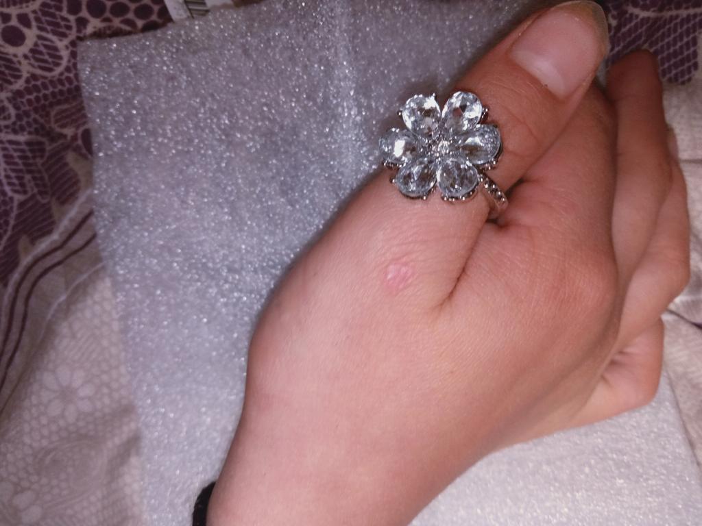 The ring is beautiful like a lotus flower with six petals. Transparent. Size 8 fit. I recommend.