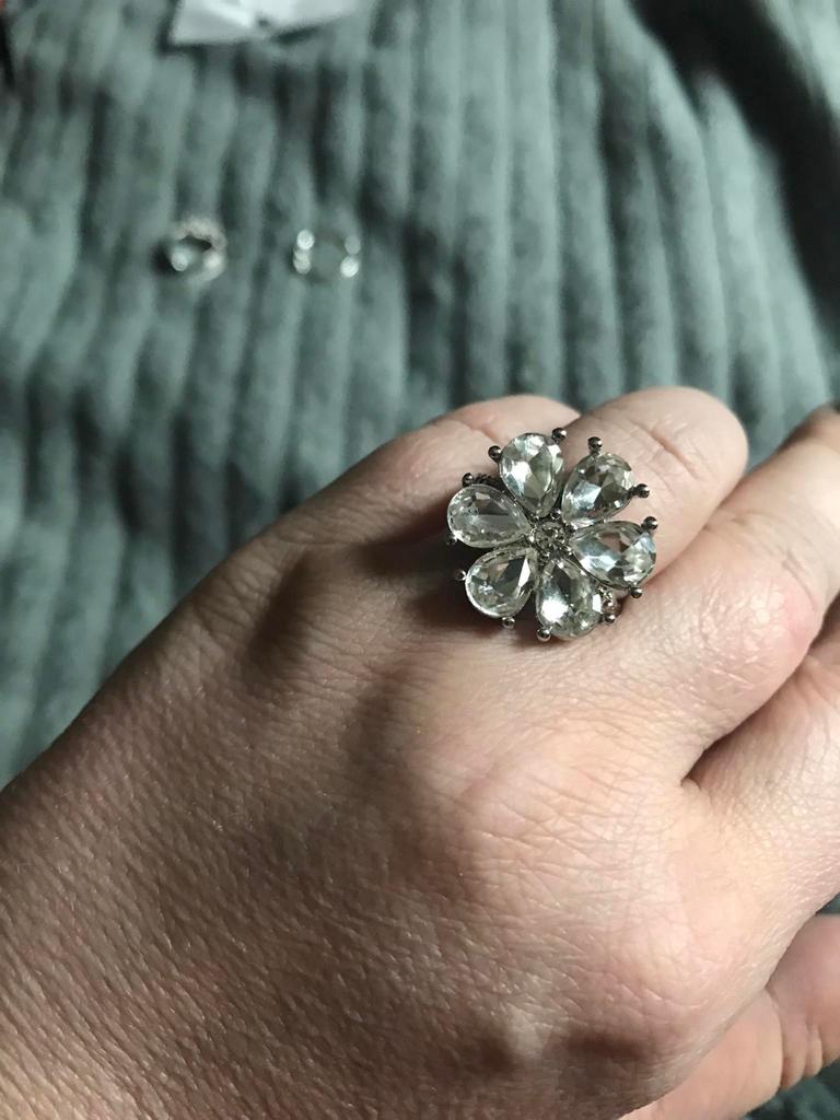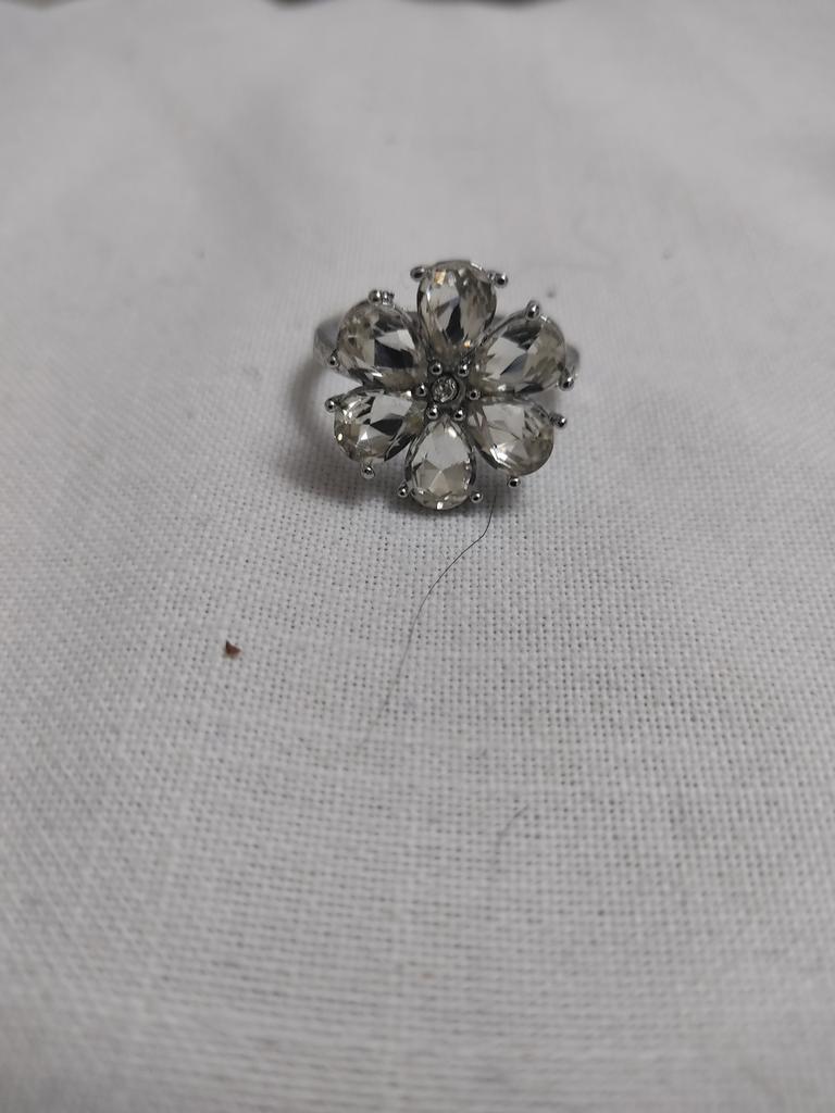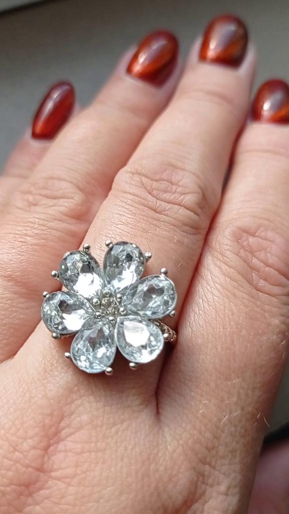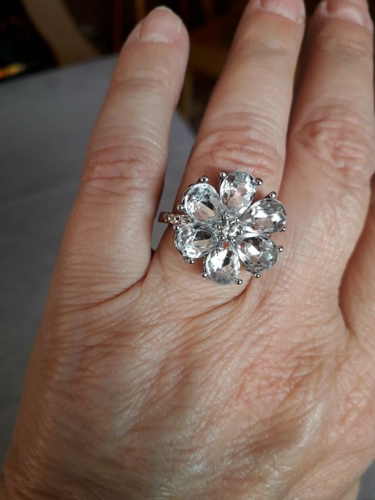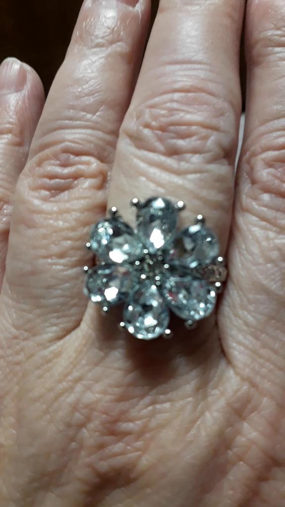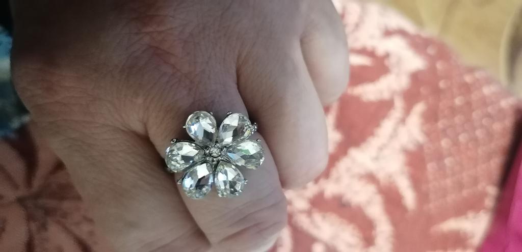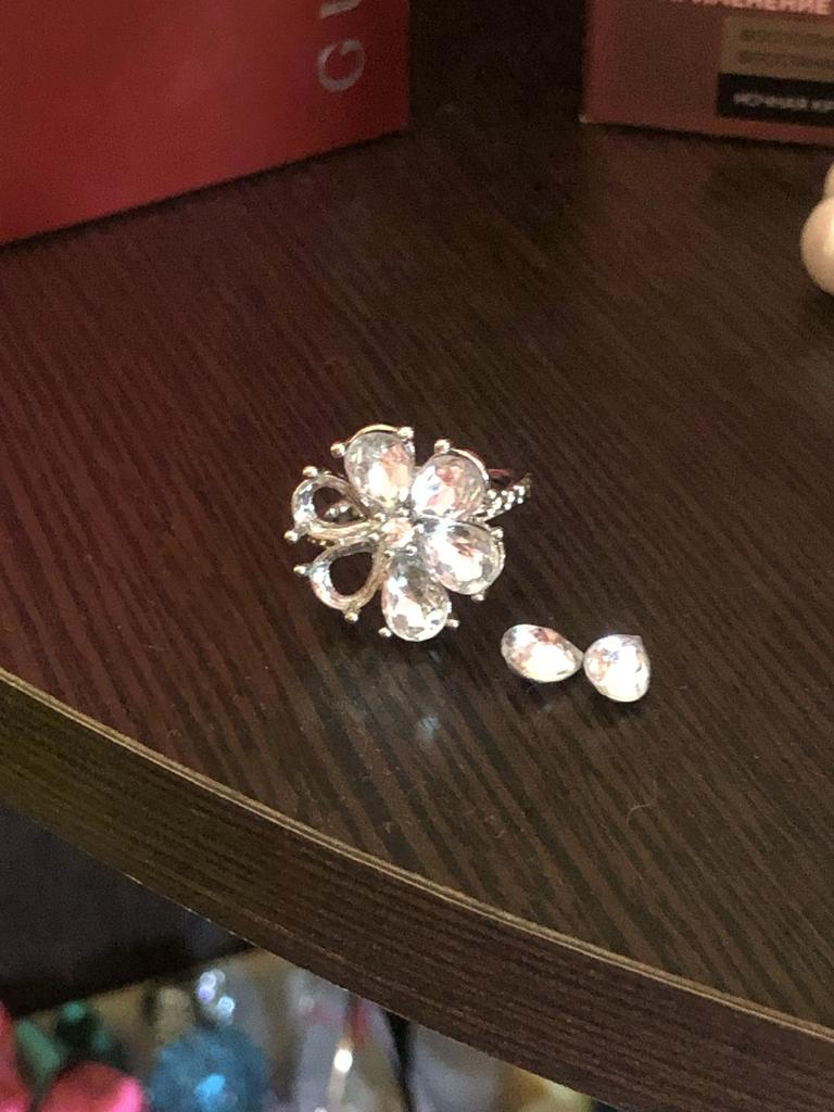The ring is beautiful like a lotus flower with six petals. Transparent. Size 8 fit. I recommend.