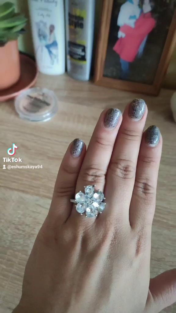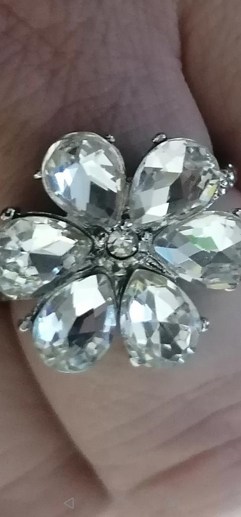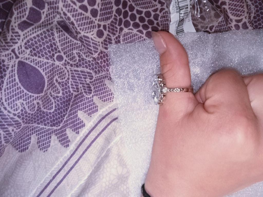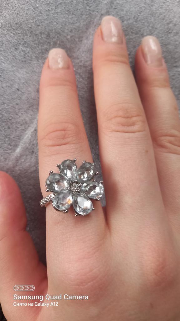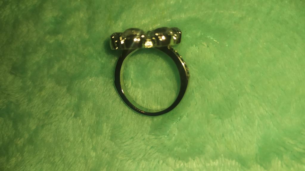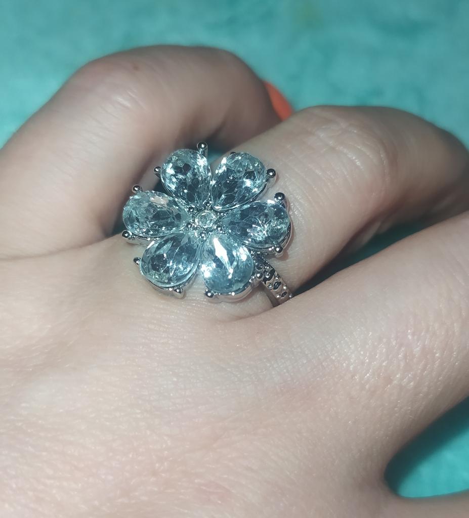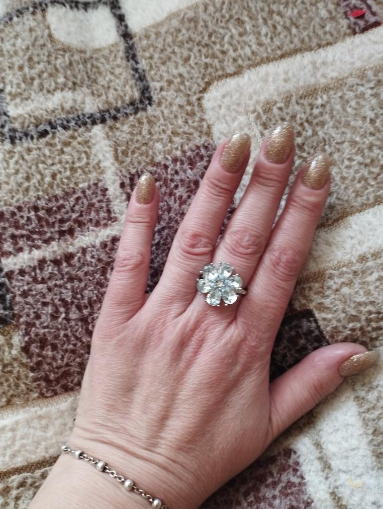 The ring is beautiful like a lotus flower with six petals. Transparent. Size 8 fit. I recommend.