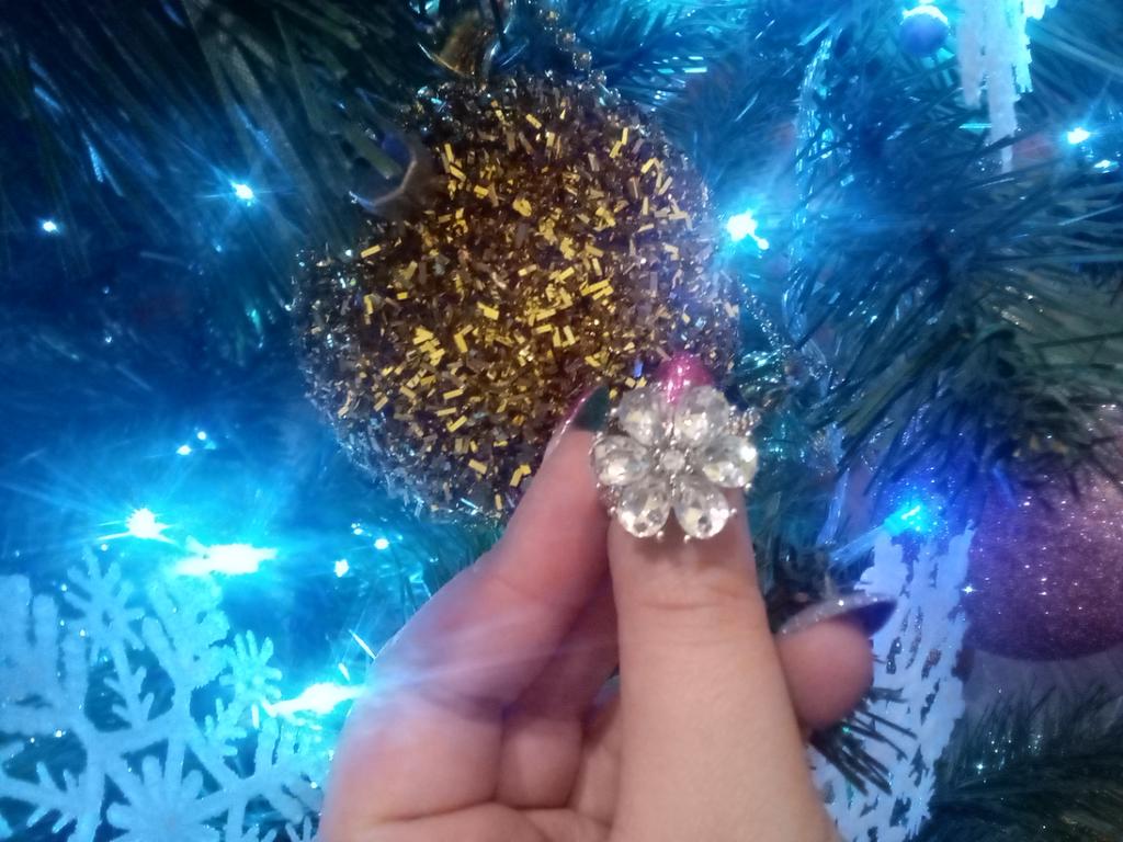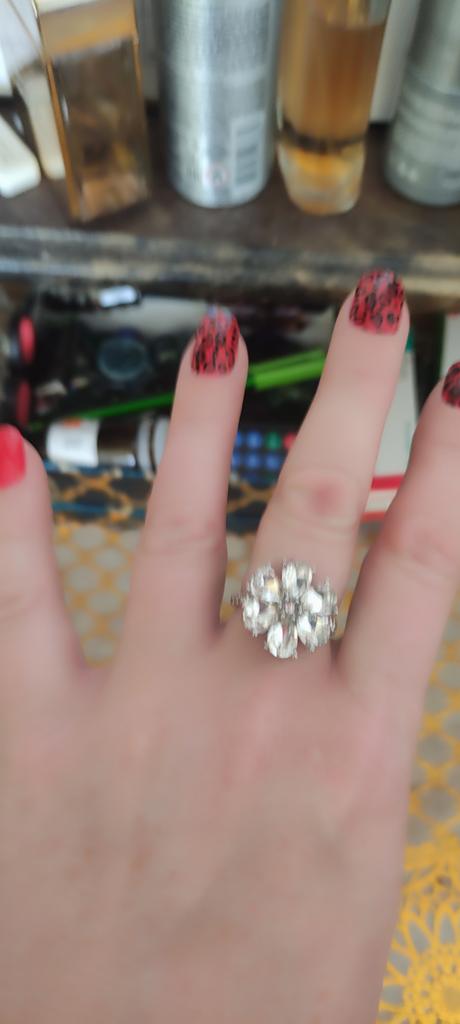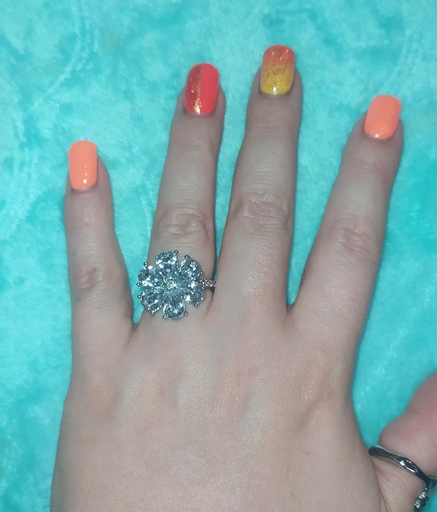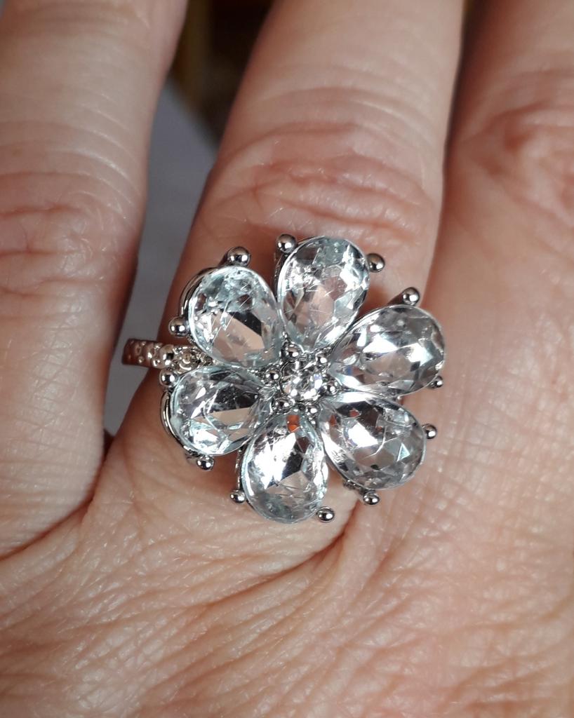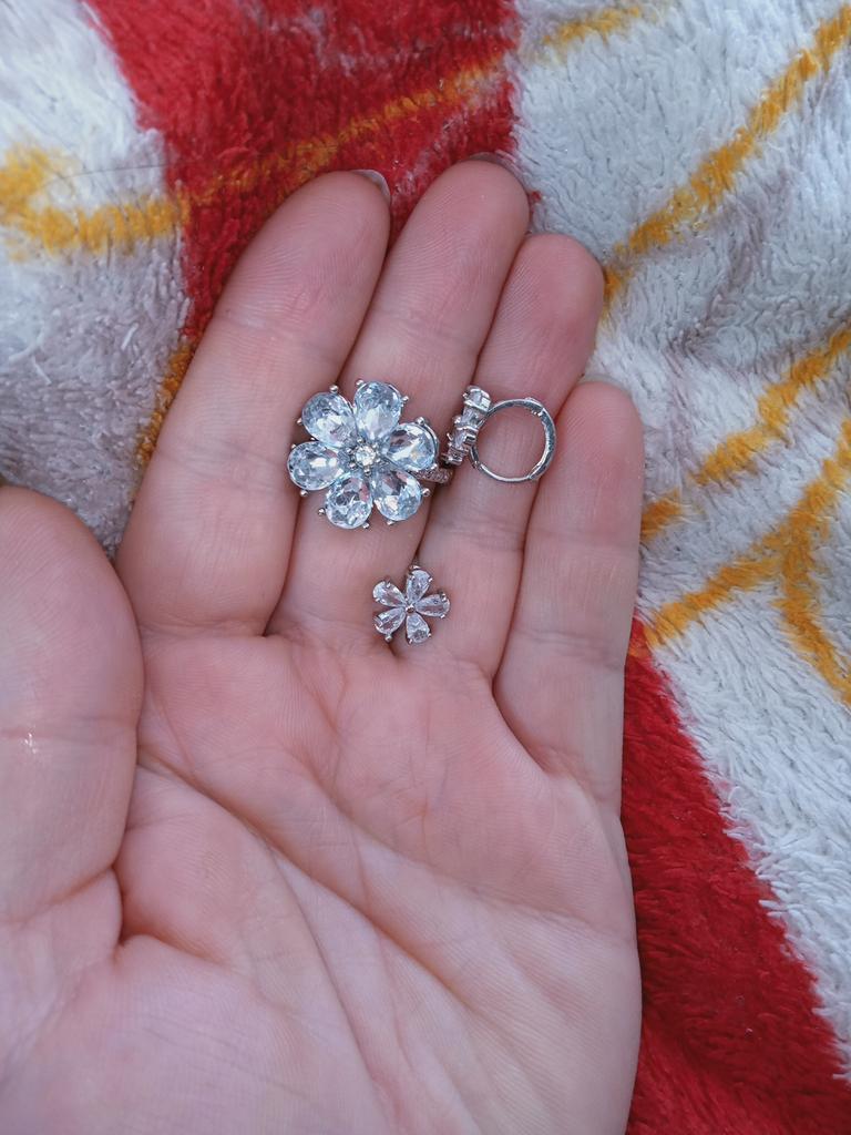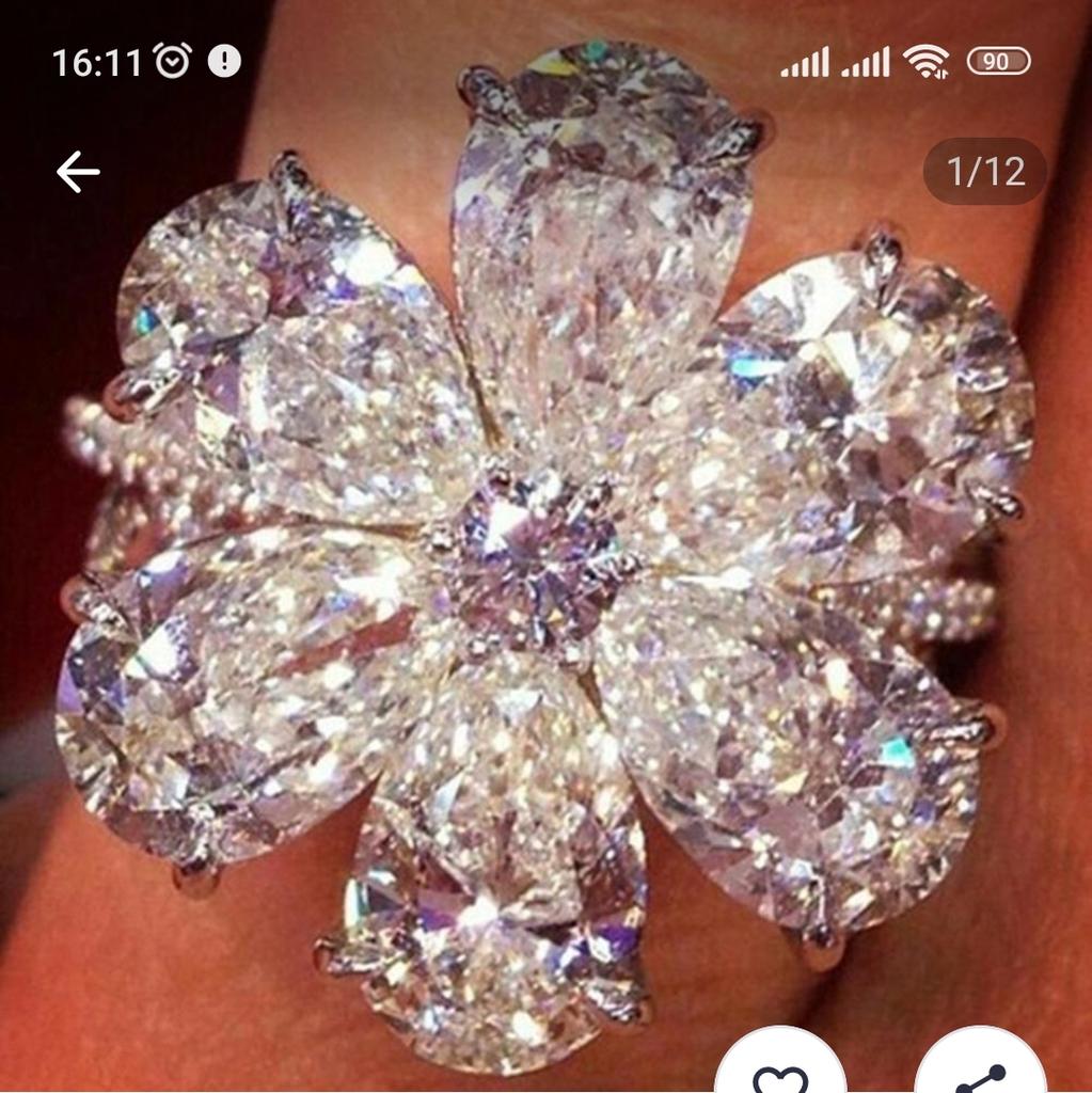 The ring is beautiful like a lotus flower with six petals. Transparent. Size 8 fit. I recommend.