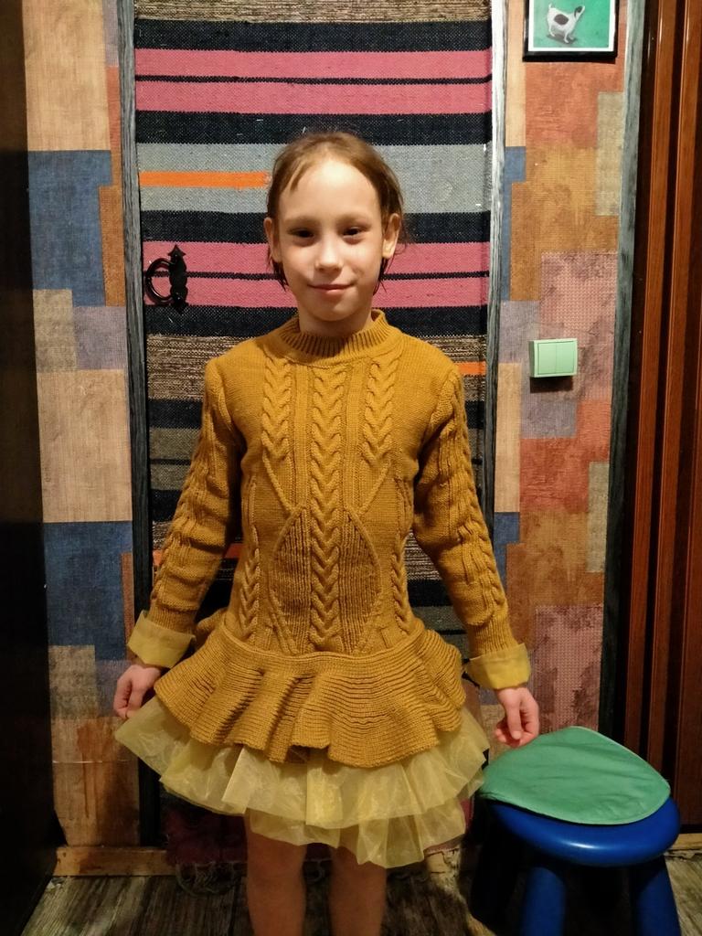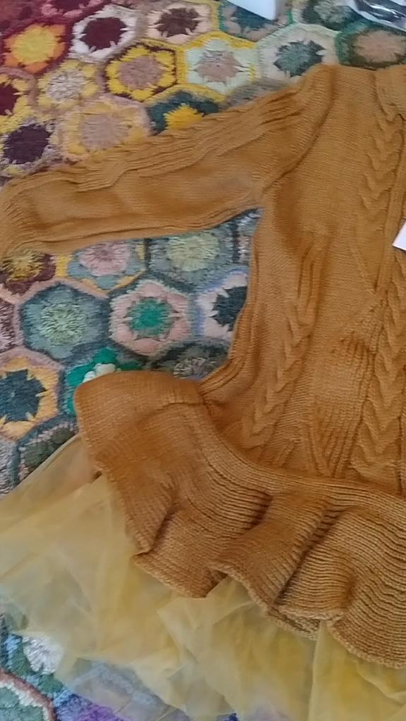 Very pretty sweater dress, very warm, with tights and thigh-high boots, a perfect look for parties