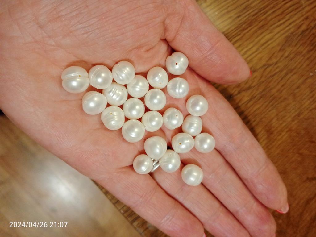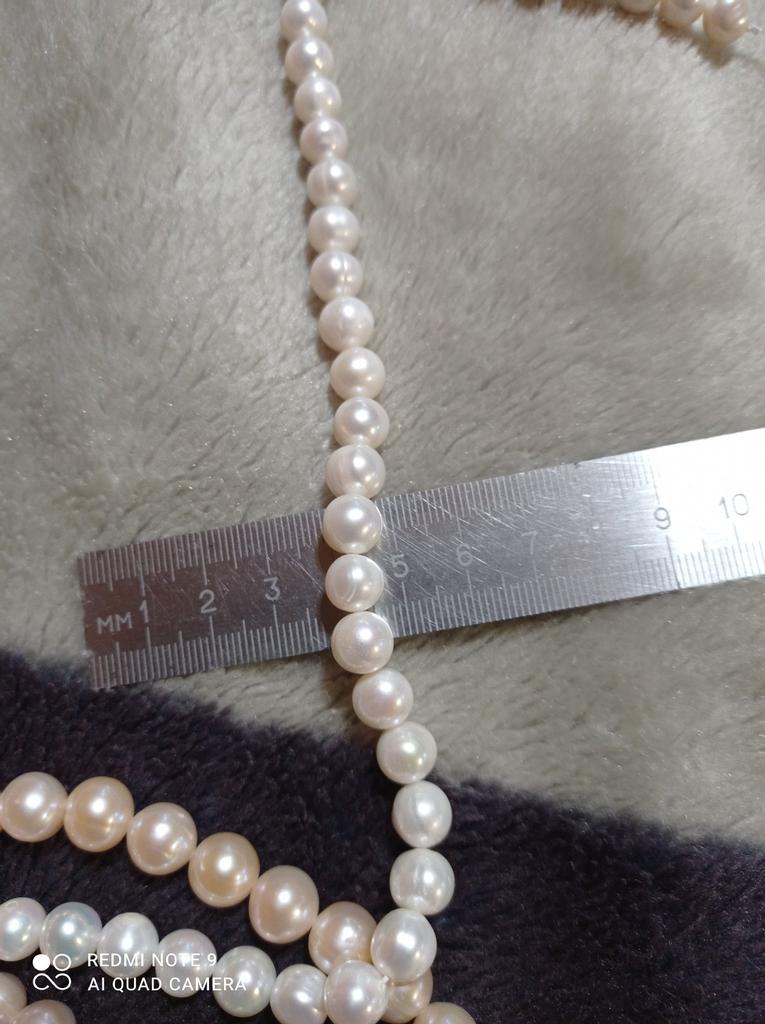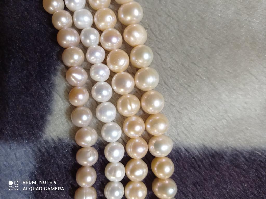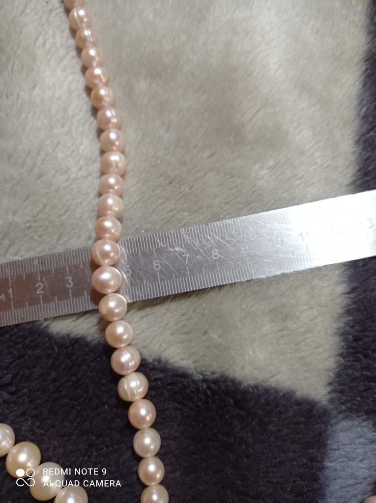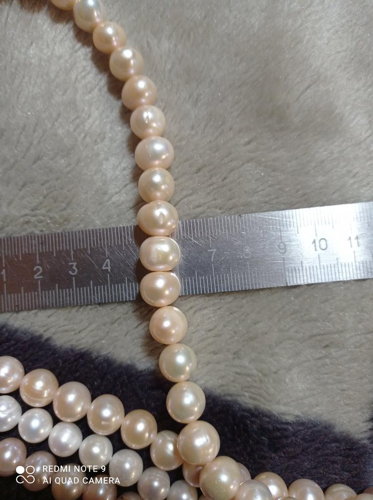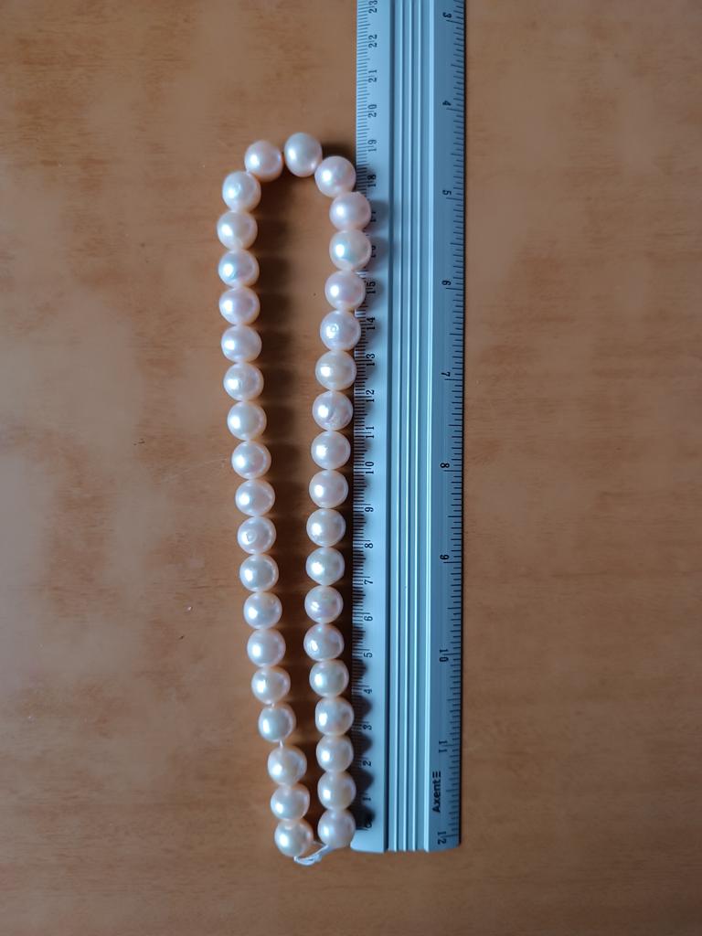 The pearls are a good size but are elips shaped. Unfortunately, since all beads have cracks. In the center are bigger ones up to 11mm and at the end 9-8mm. Does it look purple? This is a little pink mother of pearl. 38cm long. You can craft something. But I don't like it. I photographed this and looked thoroughly. There is no piece like a real pearl. I don't want to wear it because I don't even want to see it. They are not at all beautiful, like in Massimo's photo. 🤔
