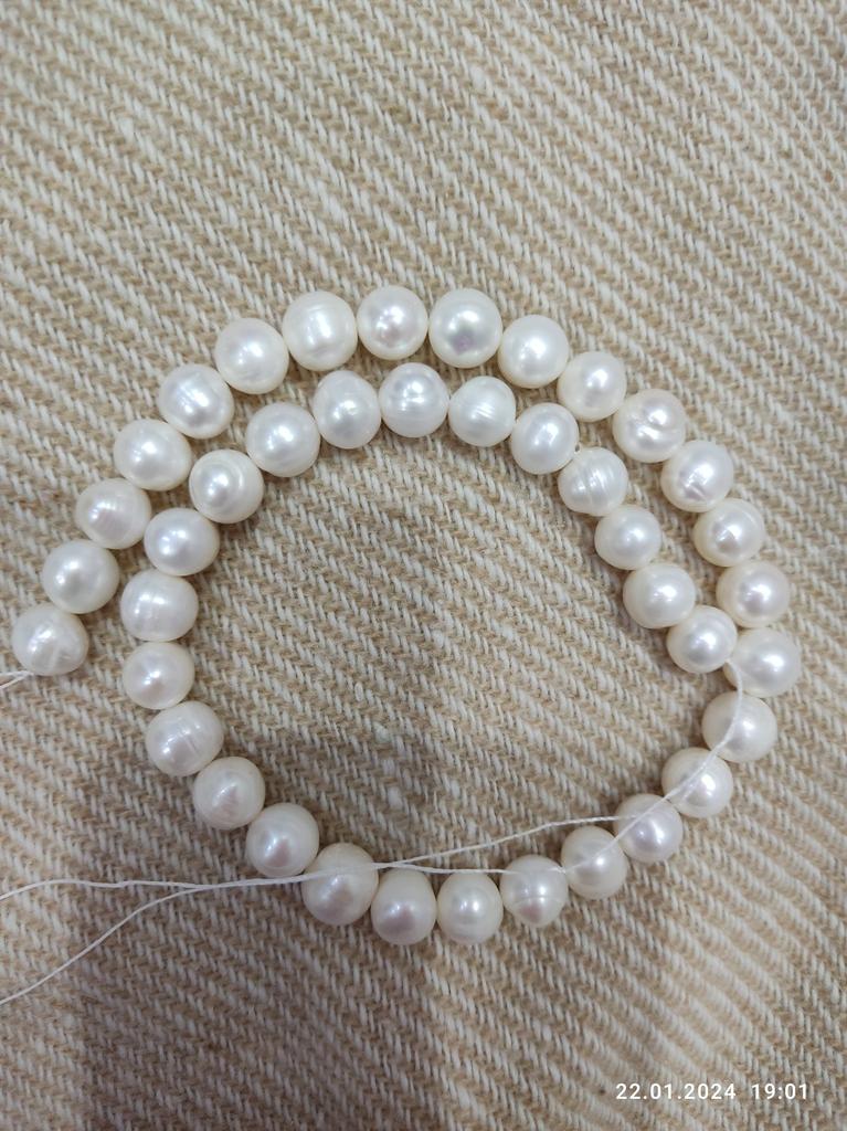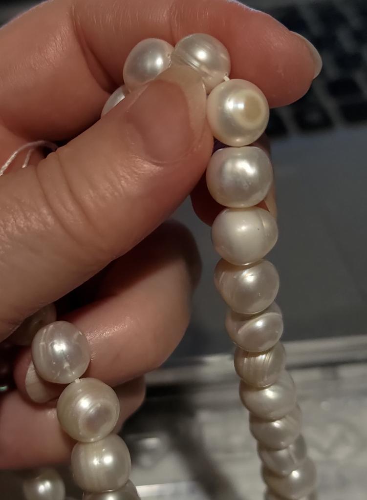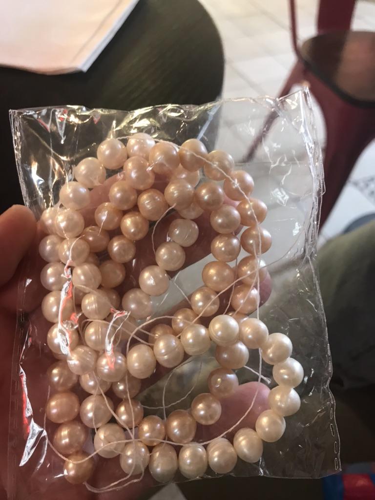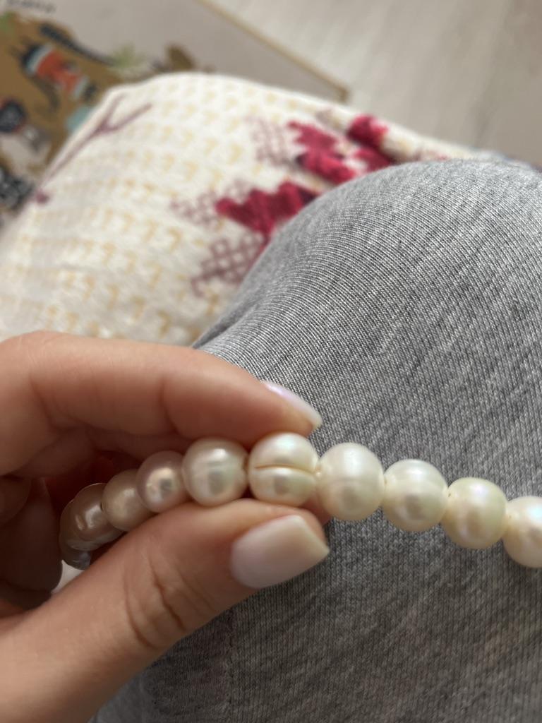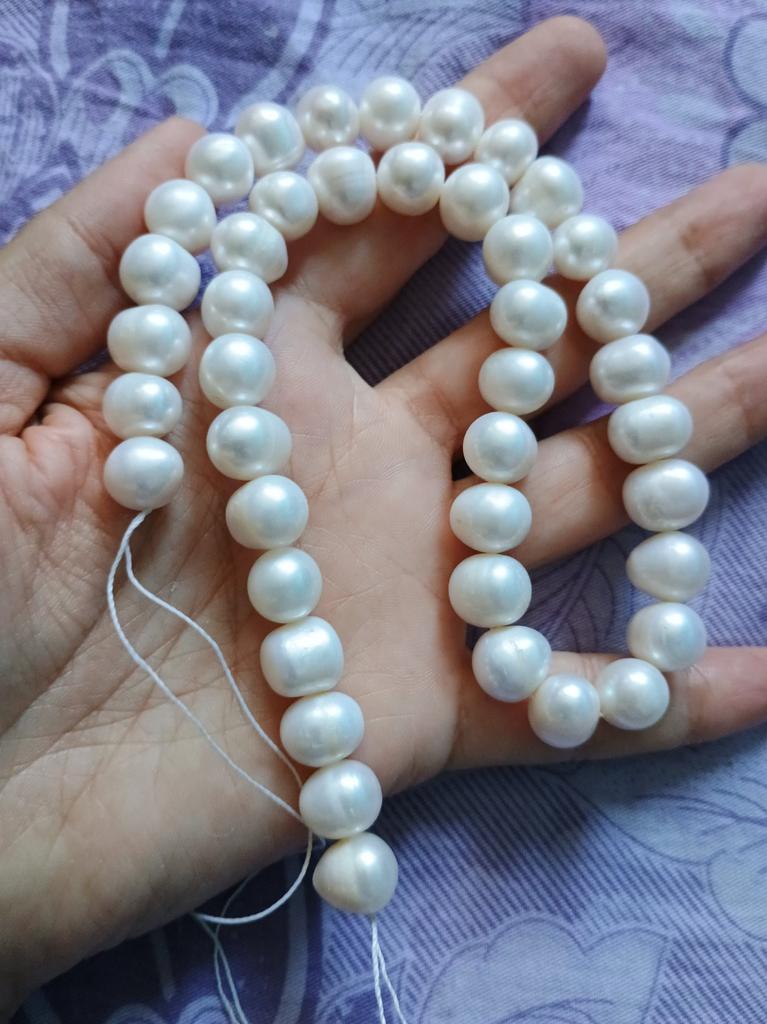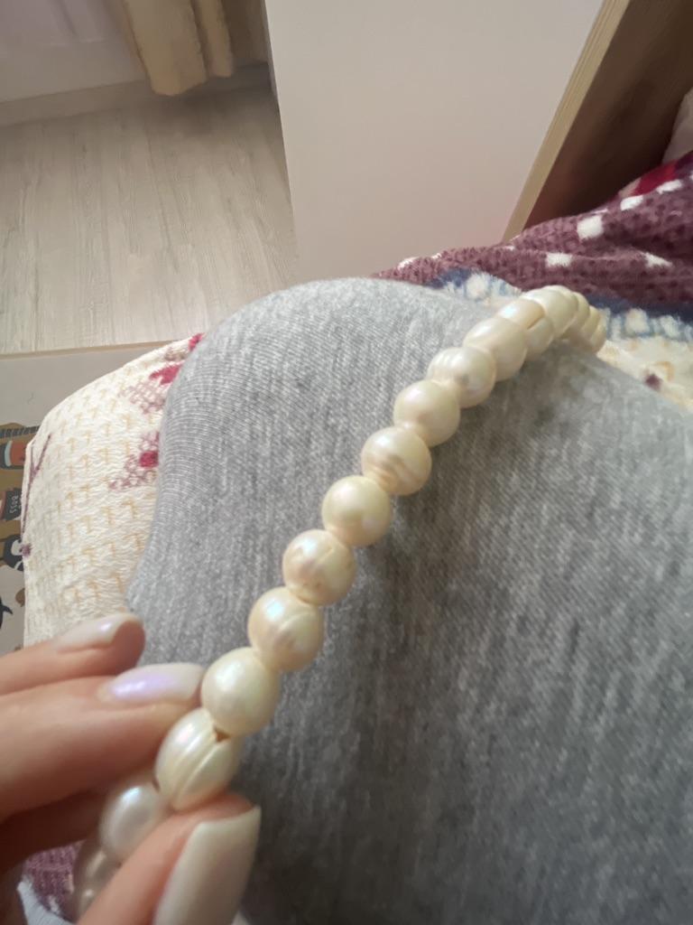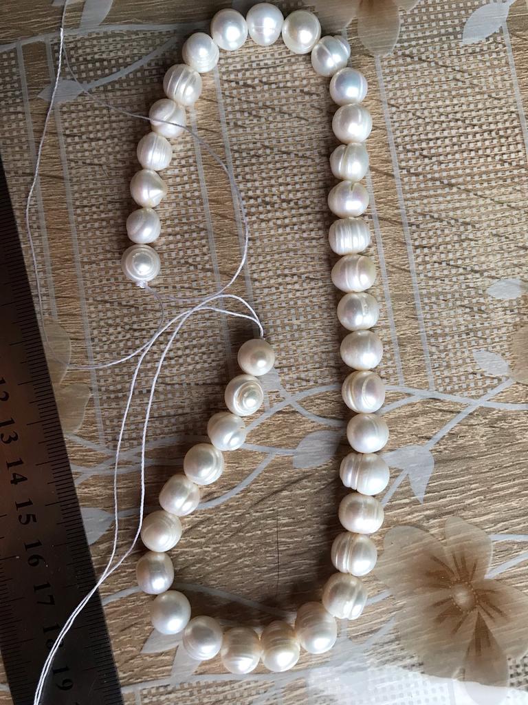The pearls are a good size but are elips shaped. Unfortunately, since all beads have cracks. In the center are bigger ones up to 11mm and at the end 9-8mm. Does it look purple? This is a little pink mother of pearl. 38cm long. You can craft something. But I don't like it. I photographed this and looked thoroughly. There is no piece like a real pearl. I don't want to wear it because I don't even want to see it. They are not at all beautiful, like in Massimo's photo. 🤔