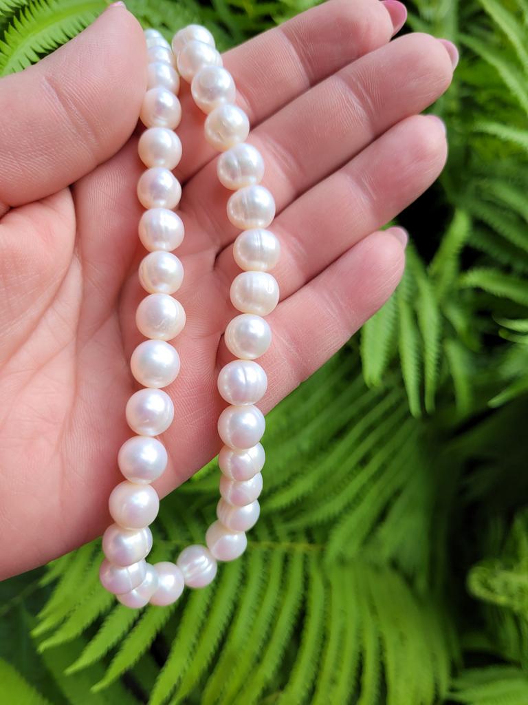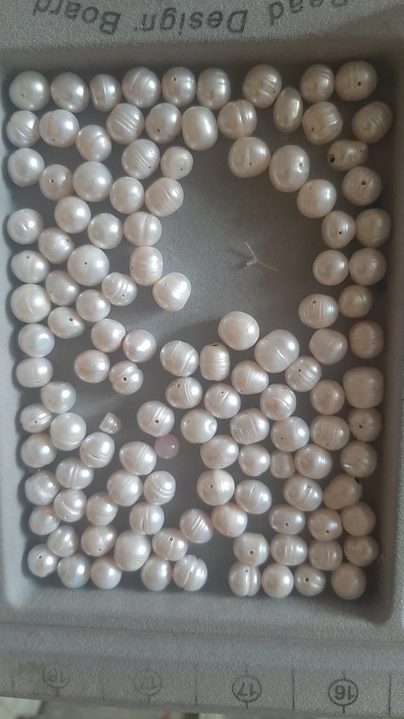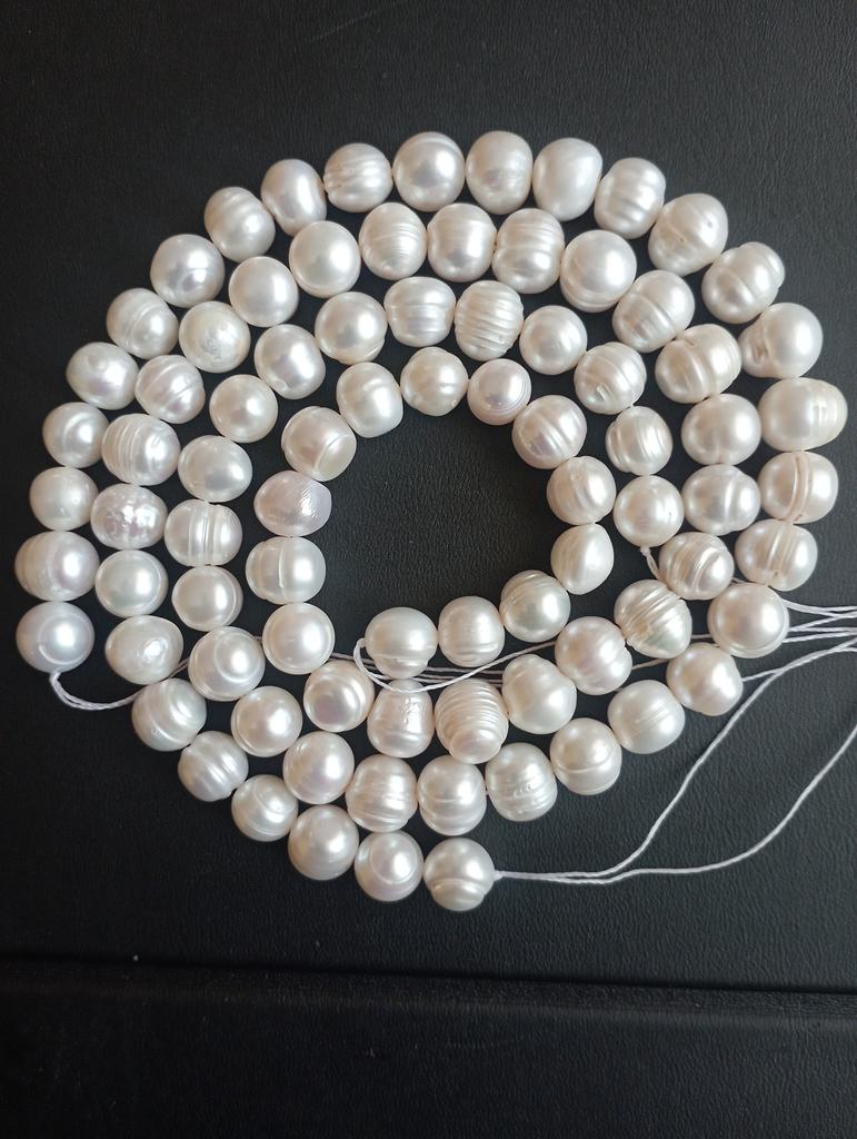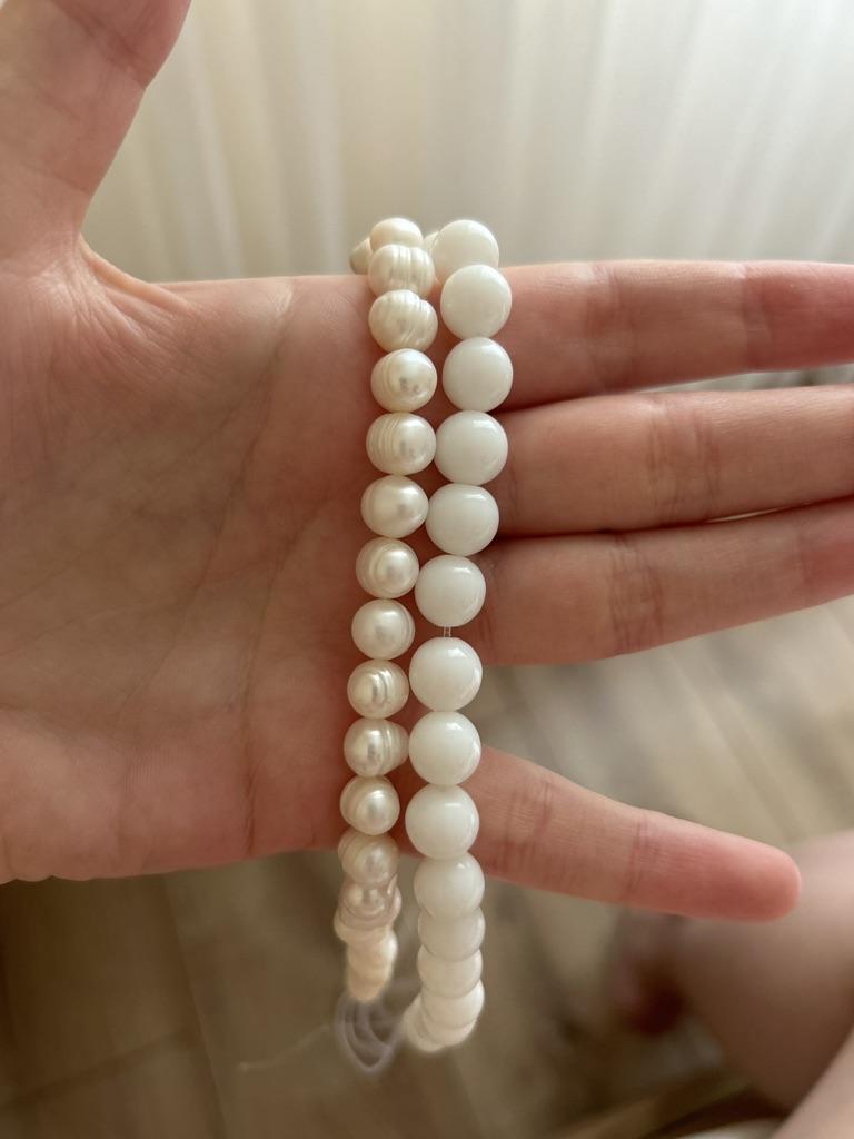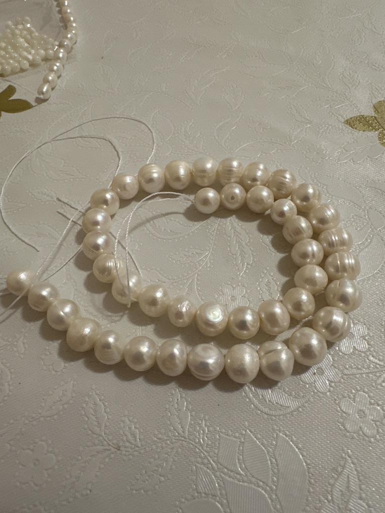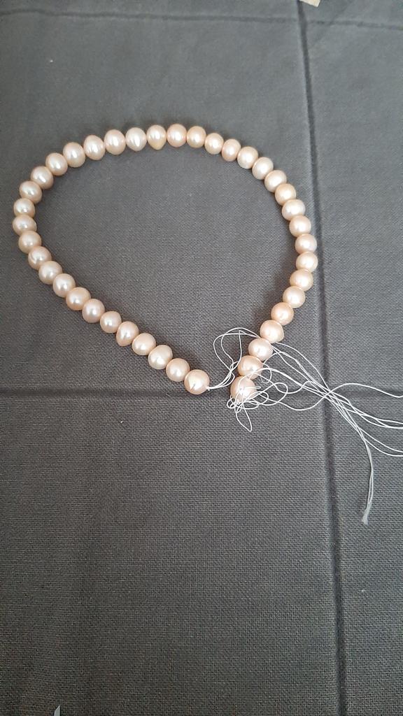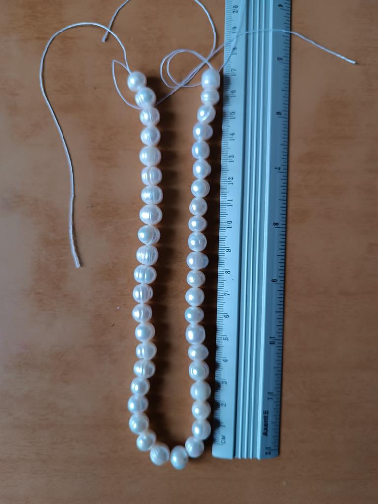 The pearls are a good size but are elips shaped. Unfortunately, since all beads have cracks. In the center are bigger ones up to 11mm and at the end 9-8mm. Does it look purple? This is a little pink mother of pearl. 38cm long. You can craft something. But I don't like it. I photographed this and looked thoroughly. There is no piece like a real pearl. I don't want to wear it because I don't even want to see it. They are not at all beautiful, like in Massimo's photo. 🤔