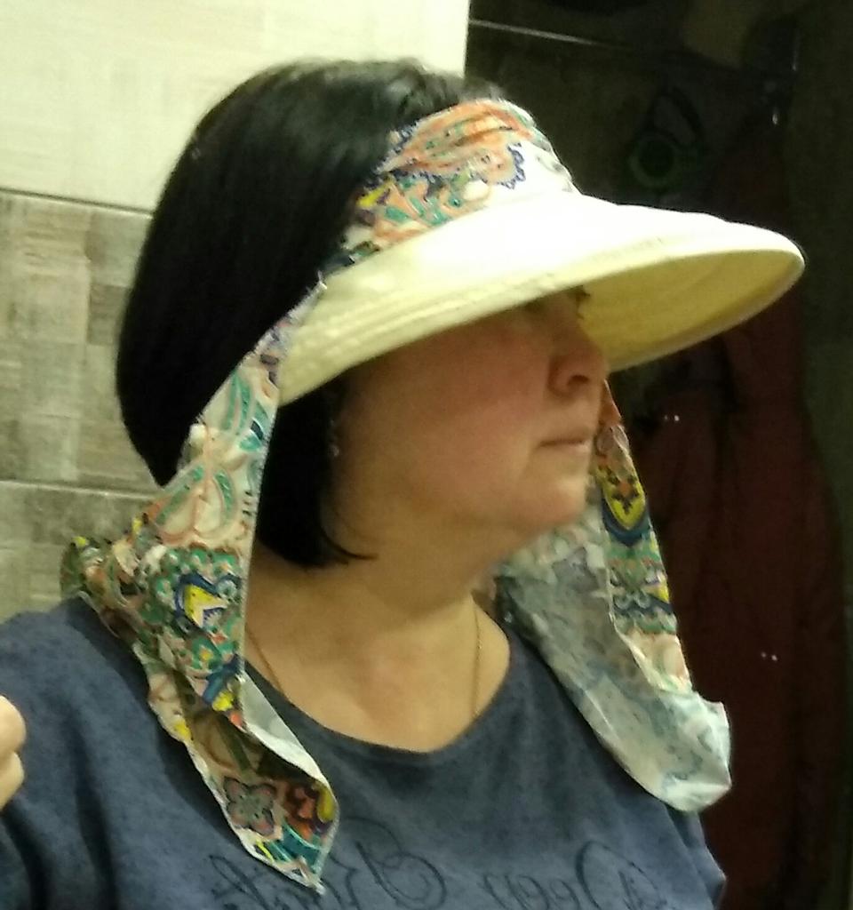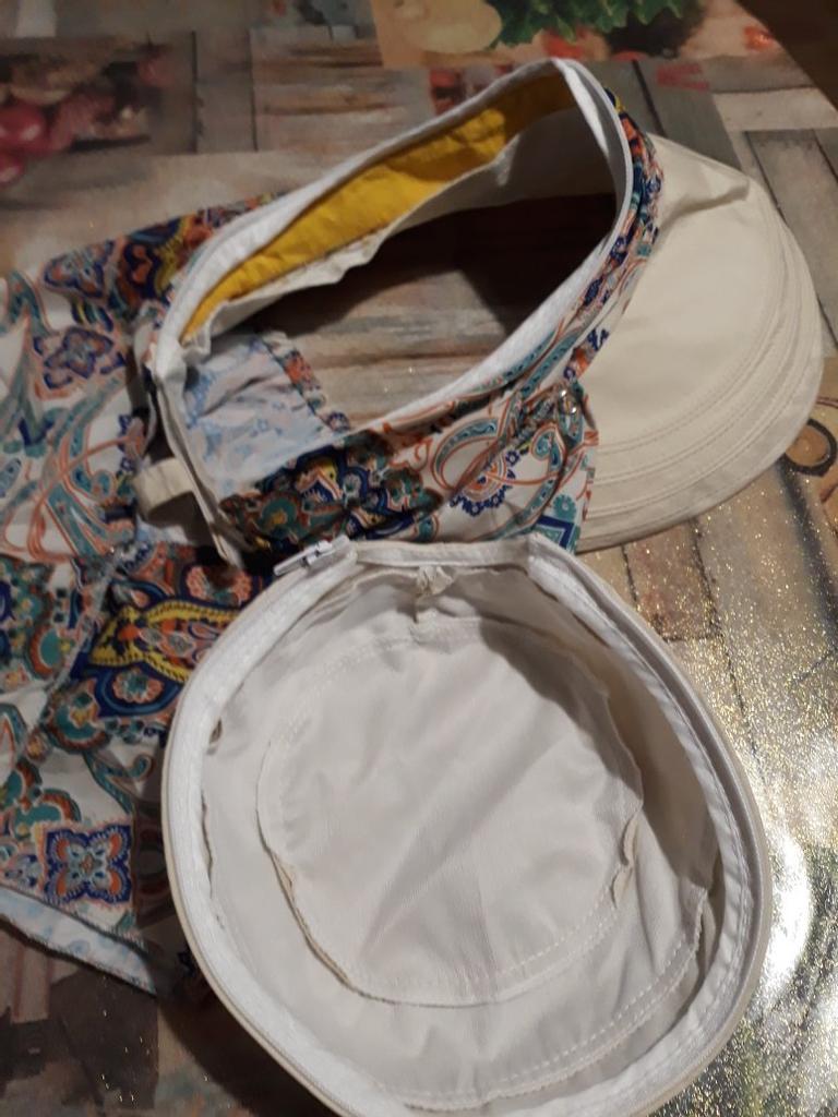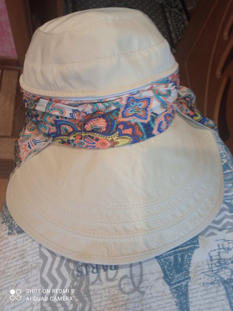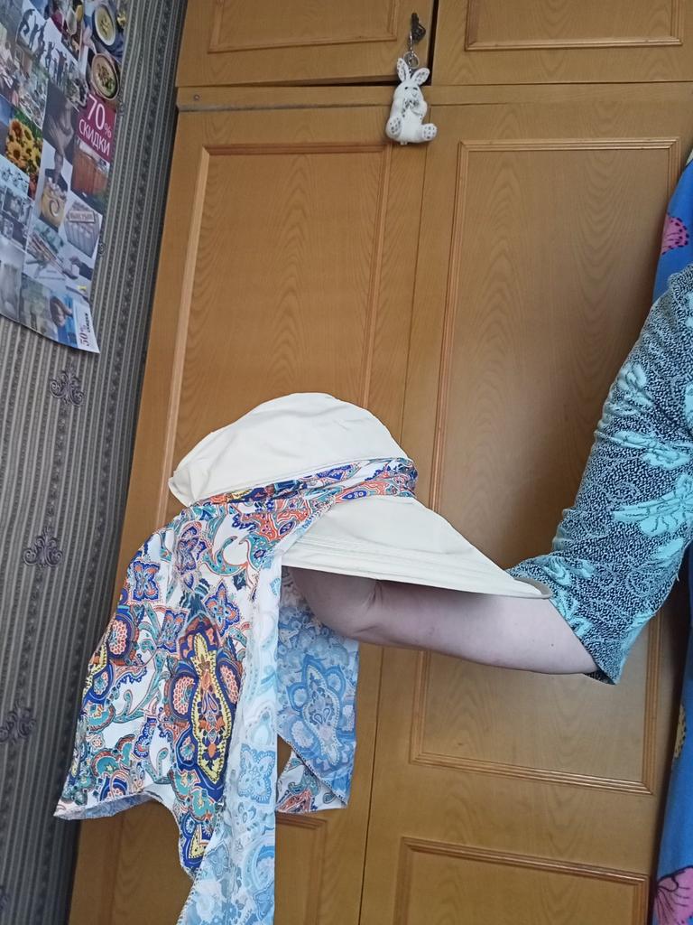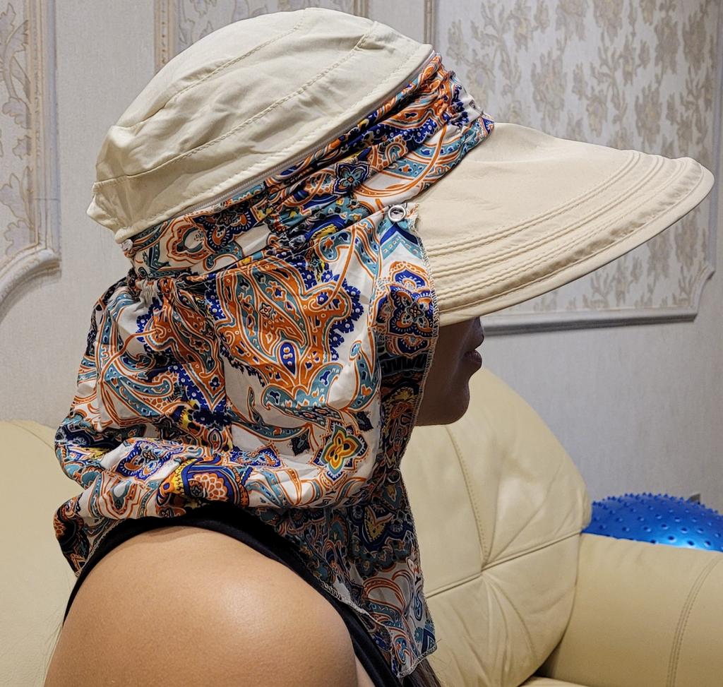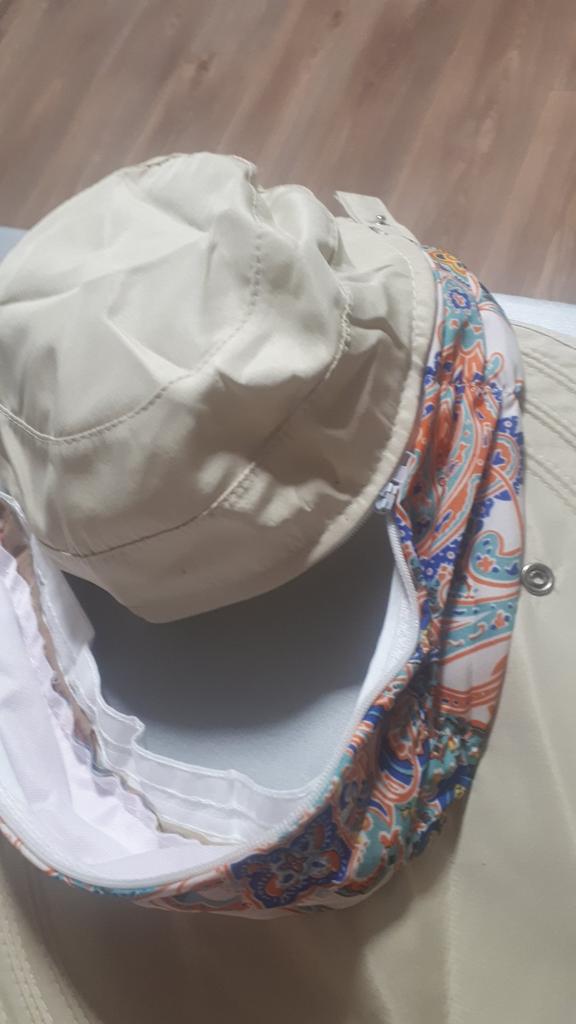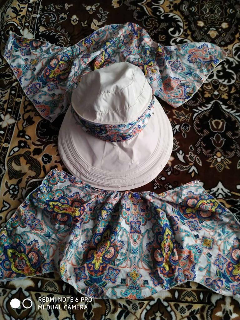 Color bright saturated Two in one - a visor with a zipper and can be unfastened to wear in different ways and a scarf is fastened so that the shoulders do not burn Sewing neat on counting three threads