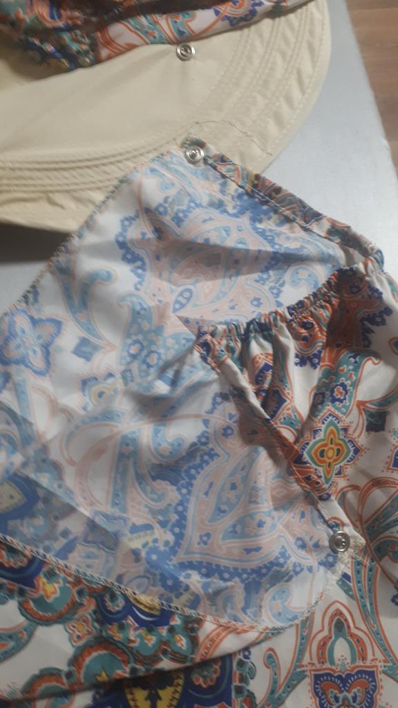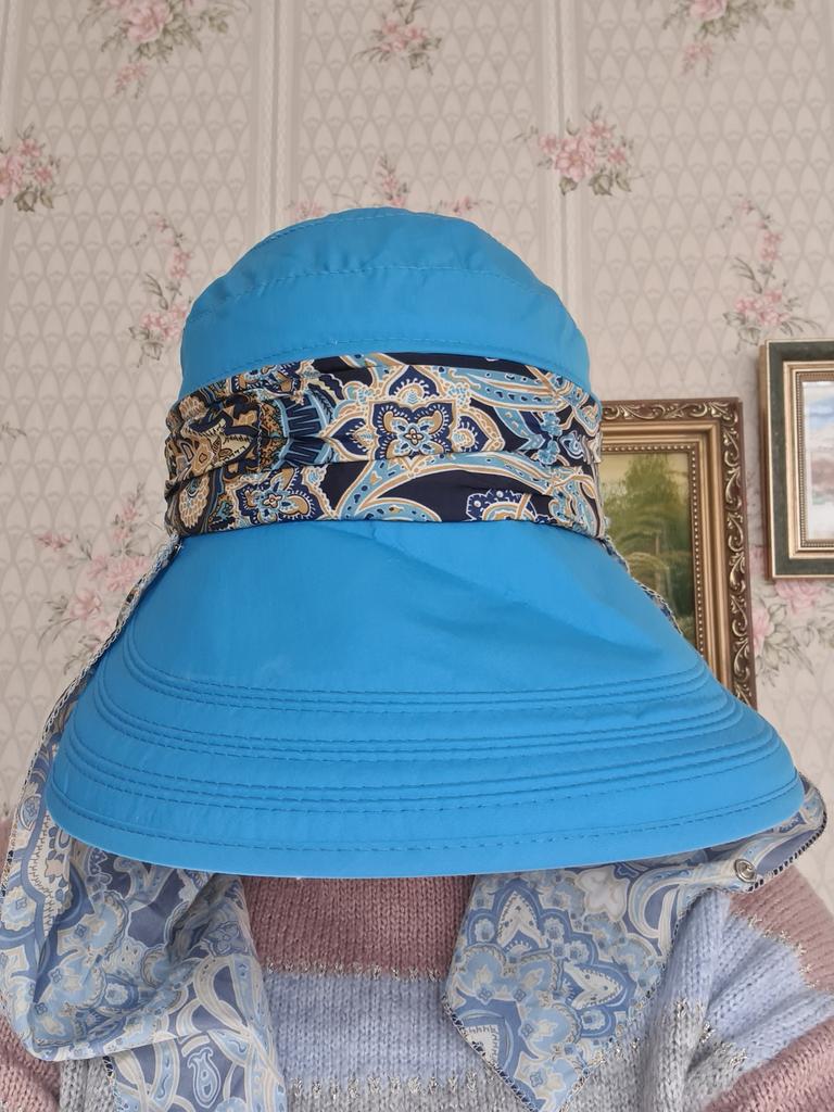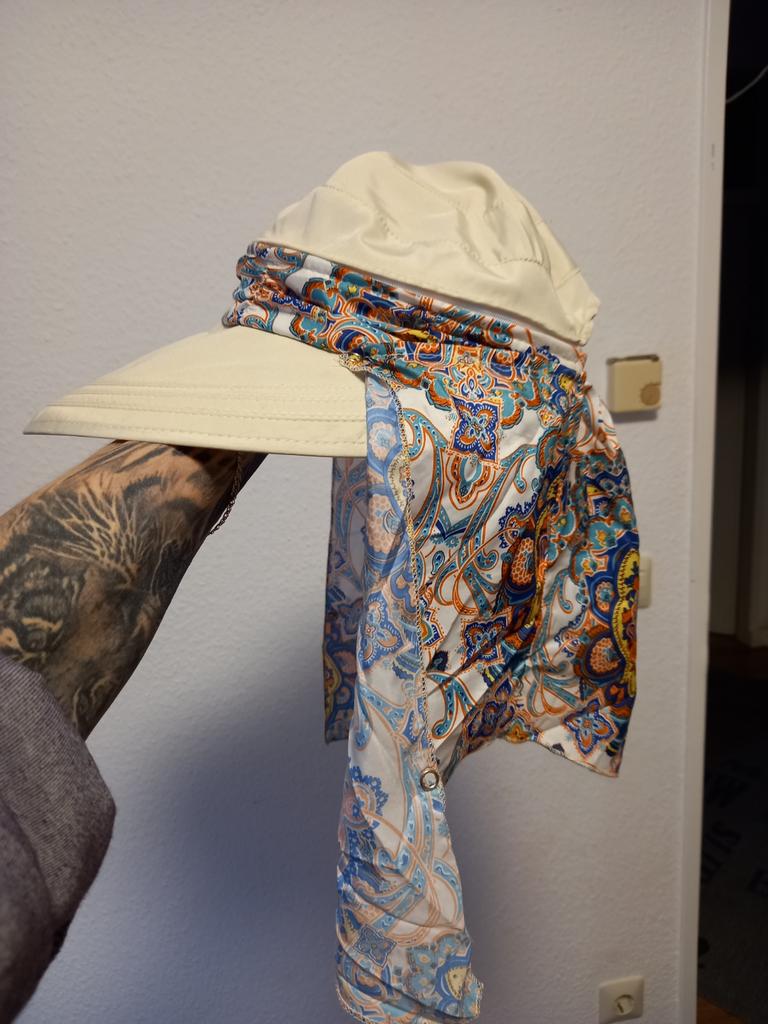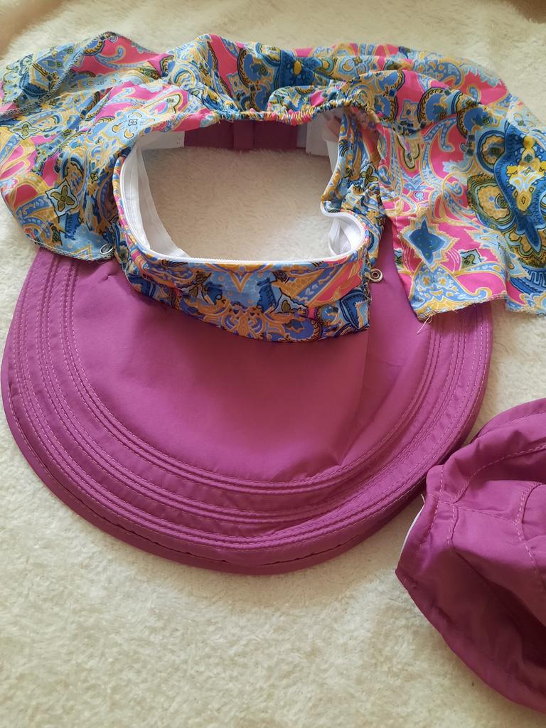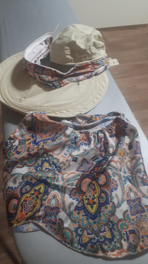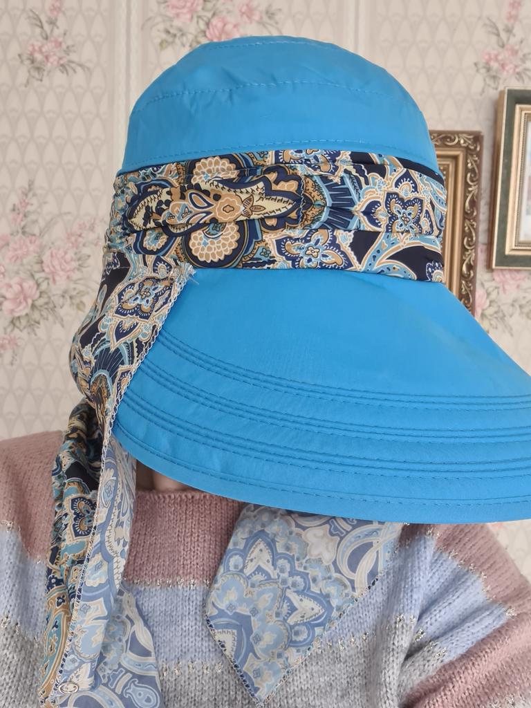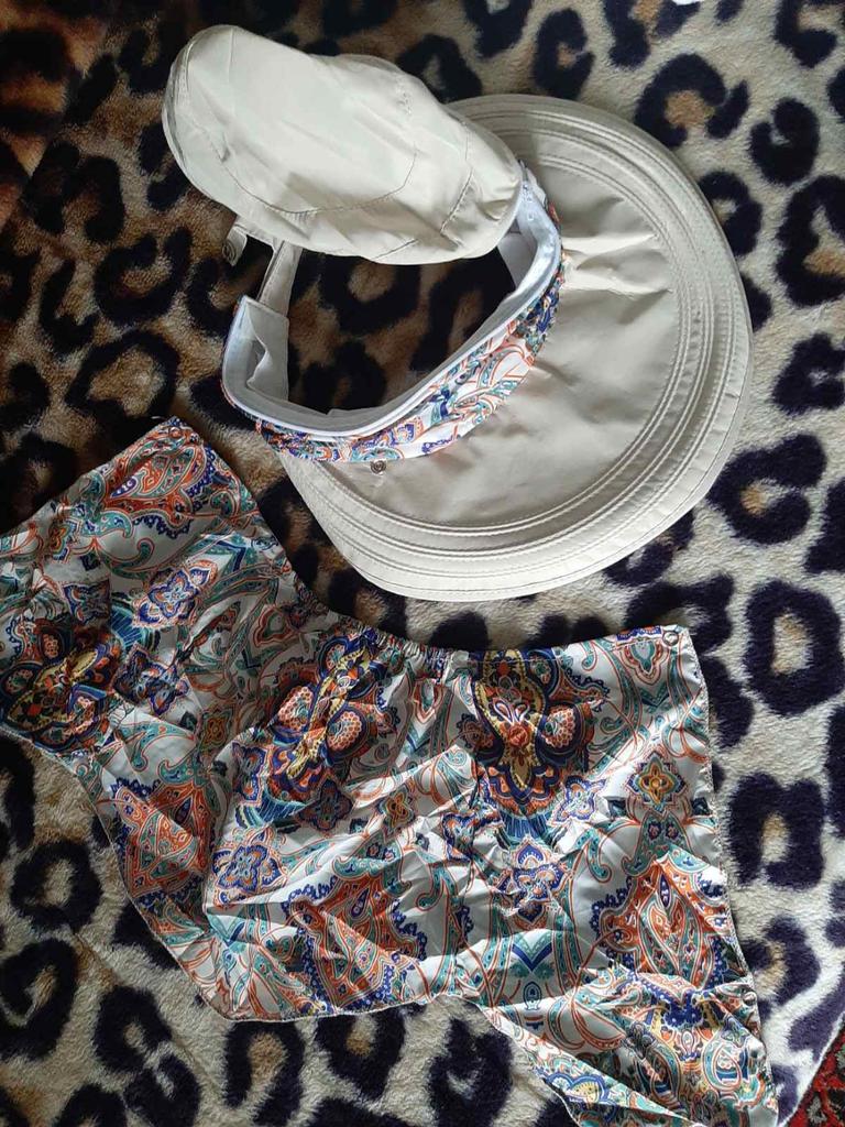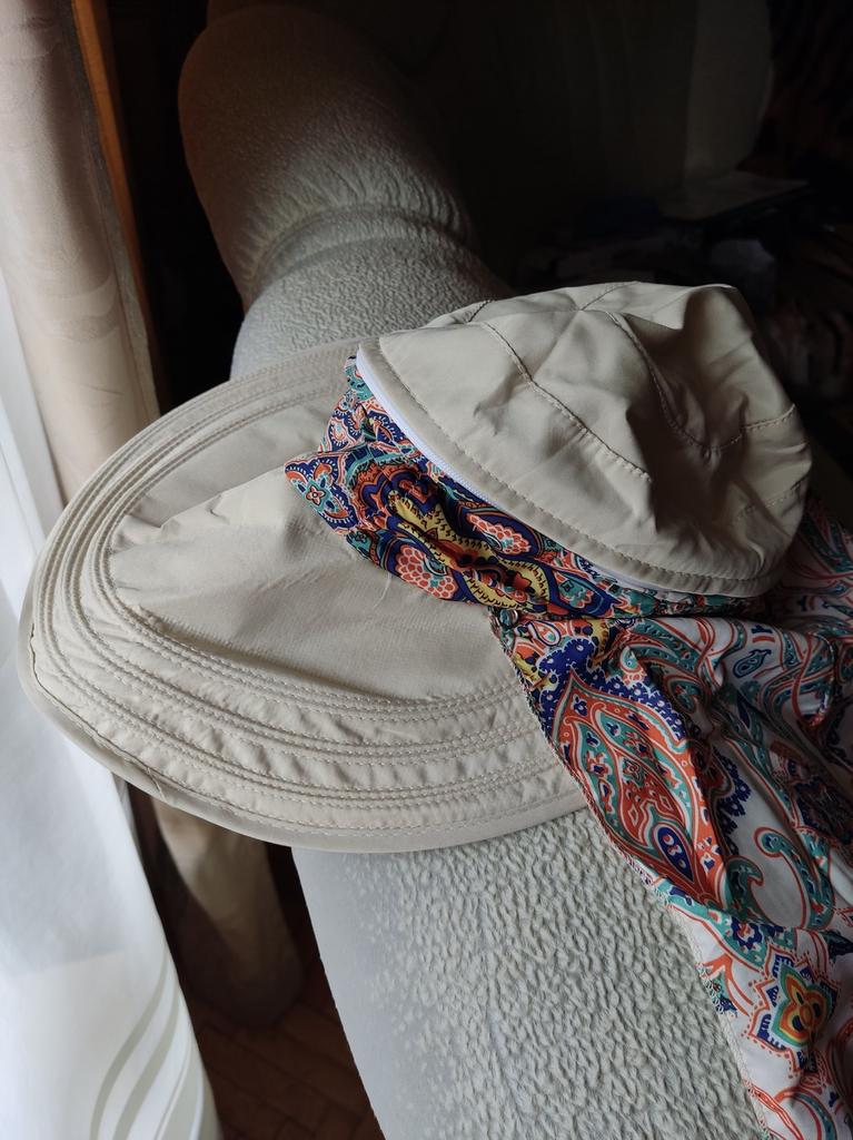 Color bright saturated Two in one - a visor with a zipper and can be unfastened to wear in different ways and a scarf is fastened so that the shoulders do not burn Sewing neat on counting three threads