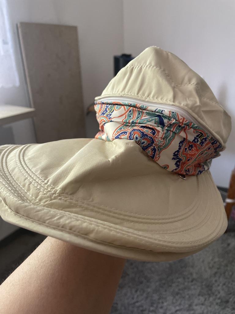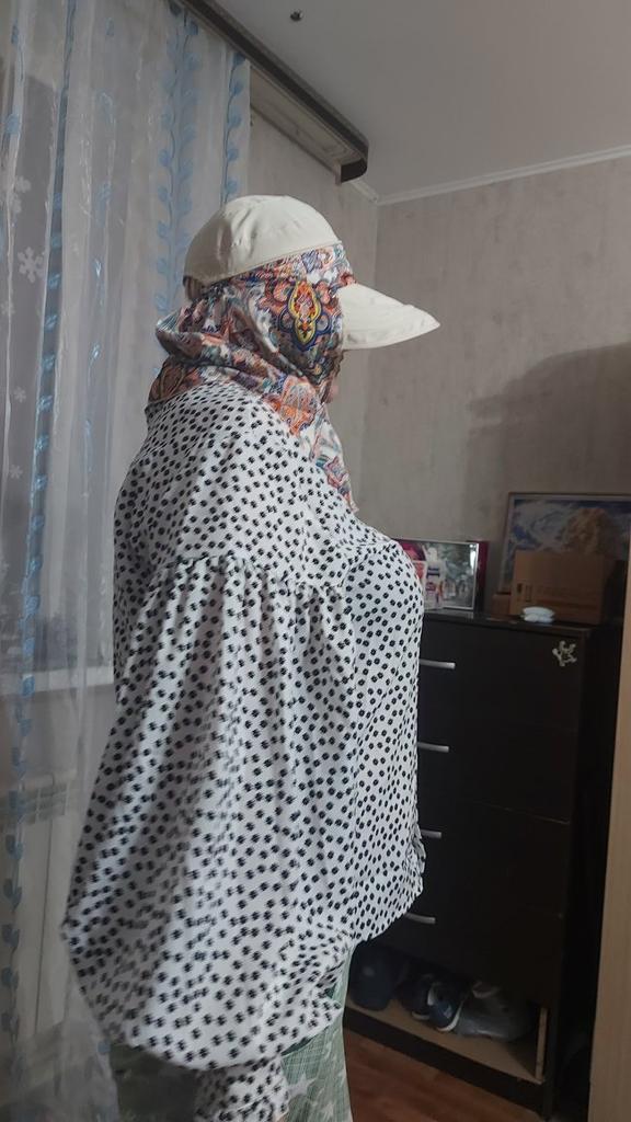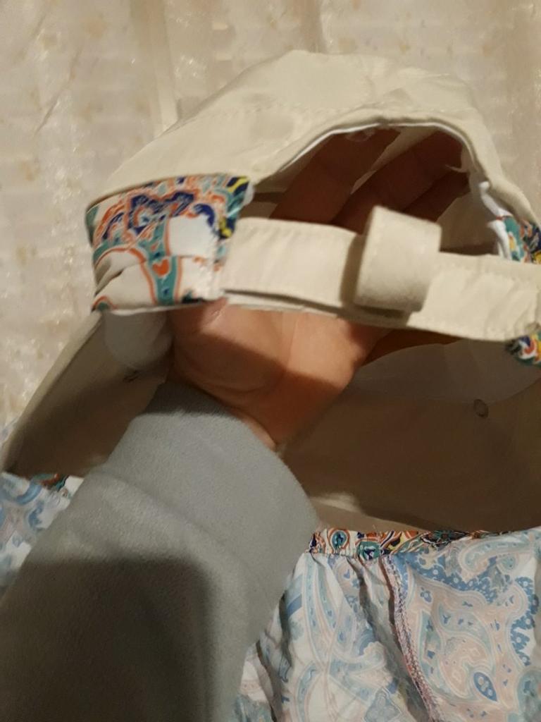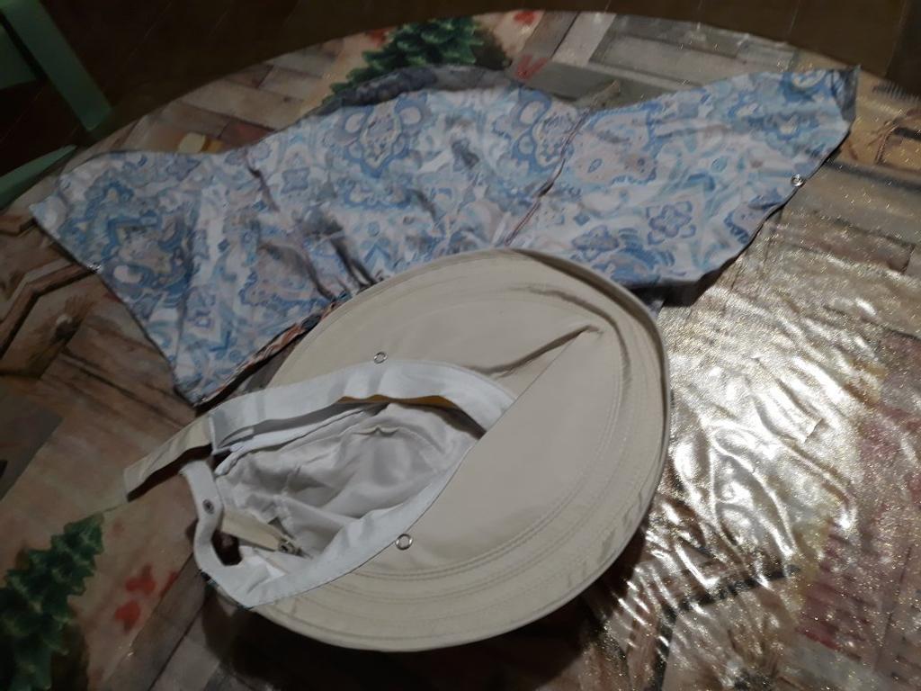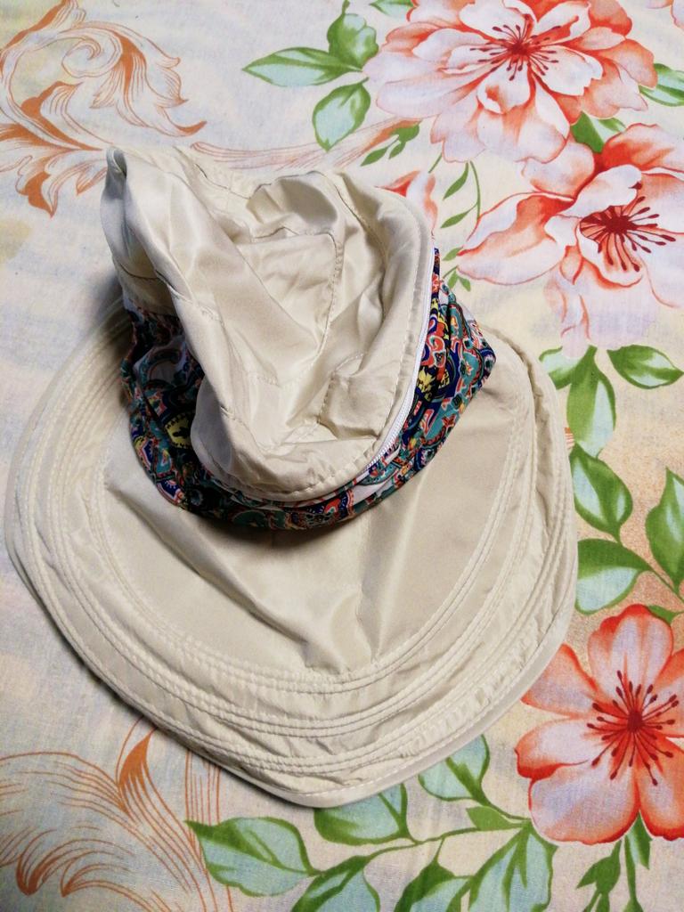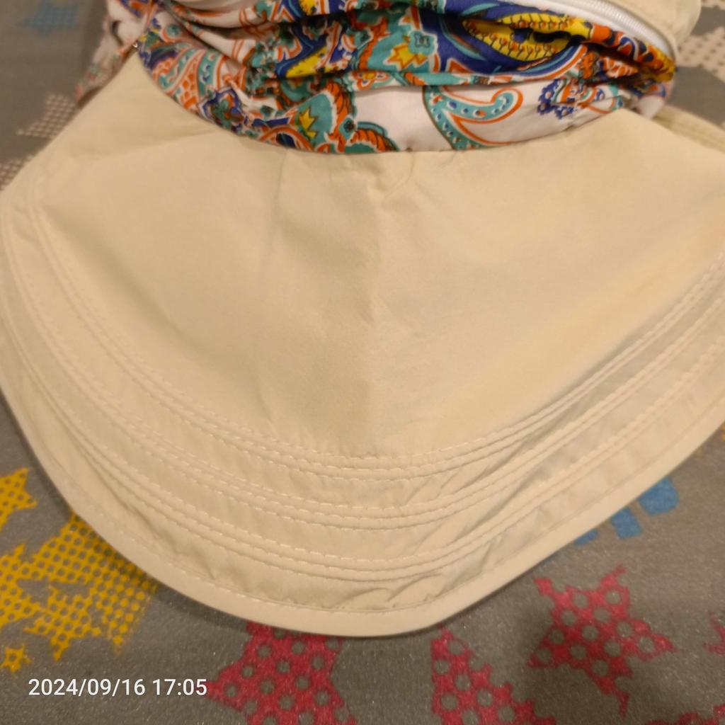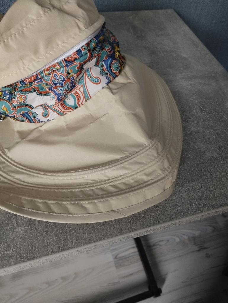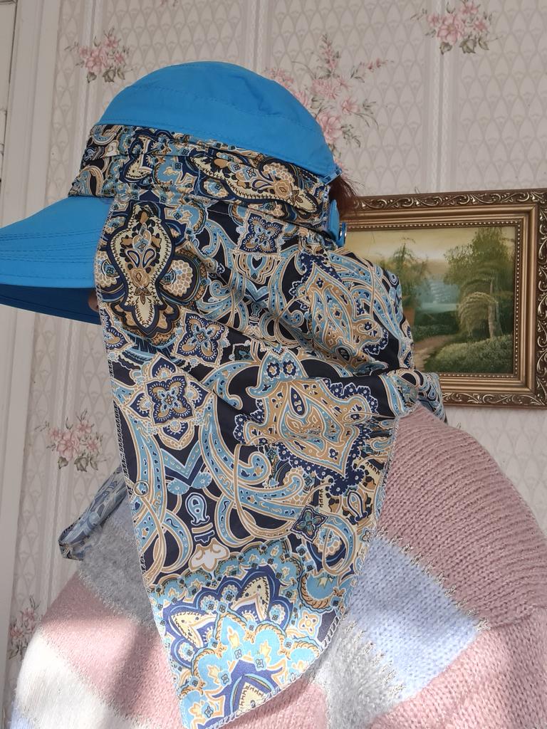 Color bright saturated Two in one - a visor with a zipper and can be unfastened to wear in different ways and a scarf is fastened so that the shoulders do not burn Sewing neat on counting three threads