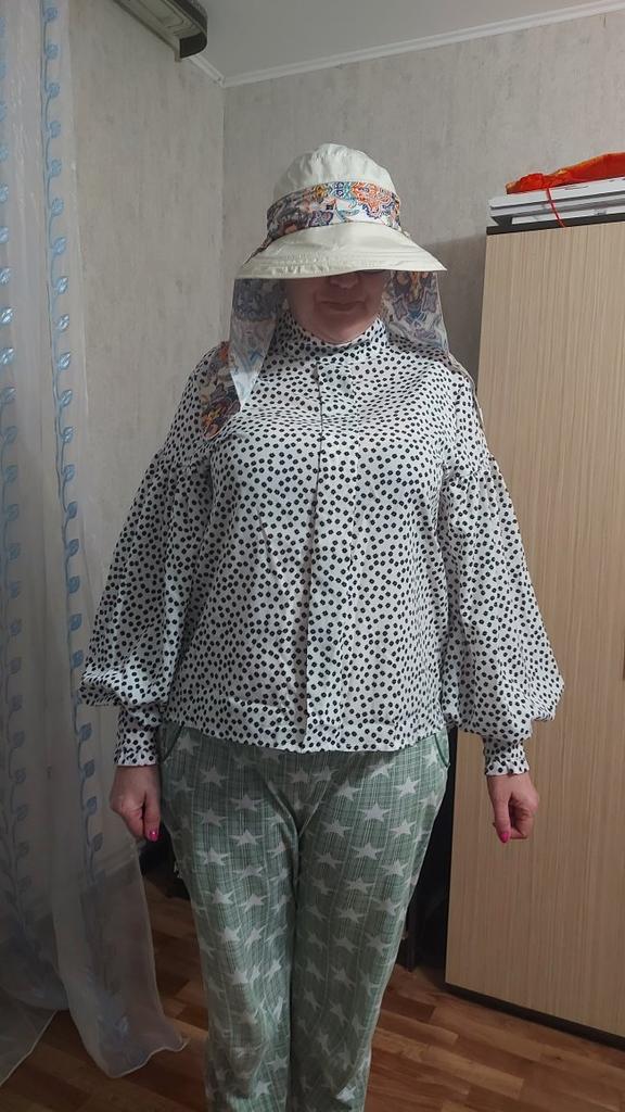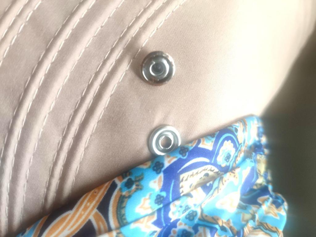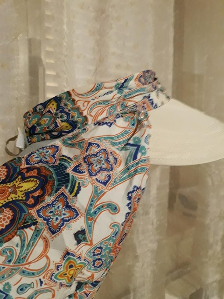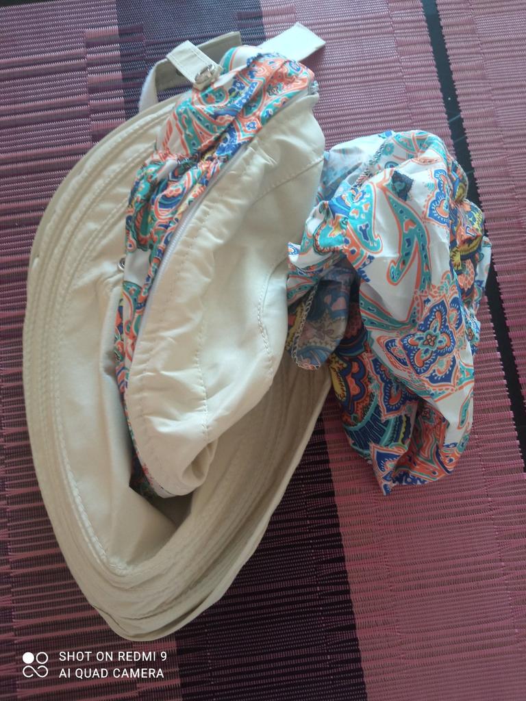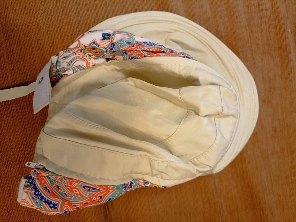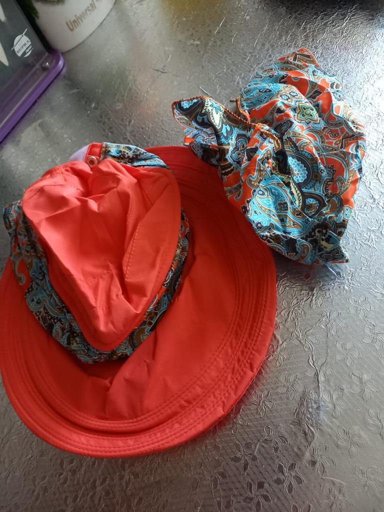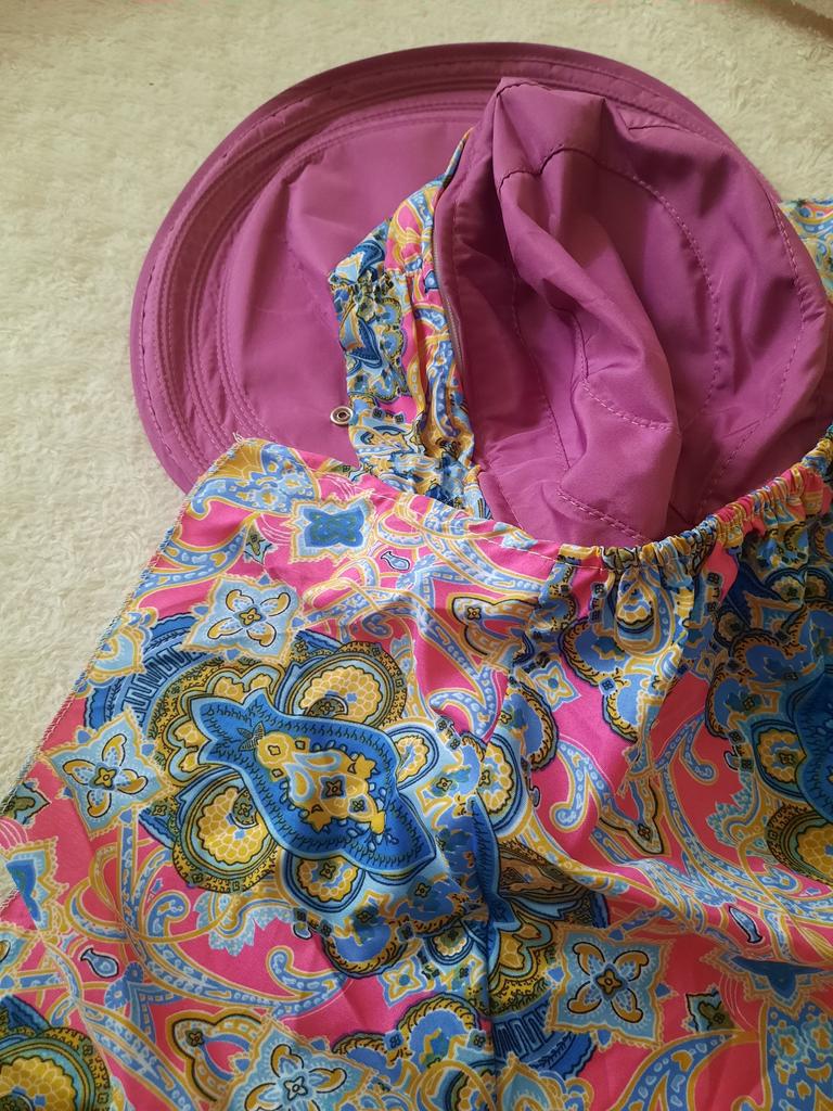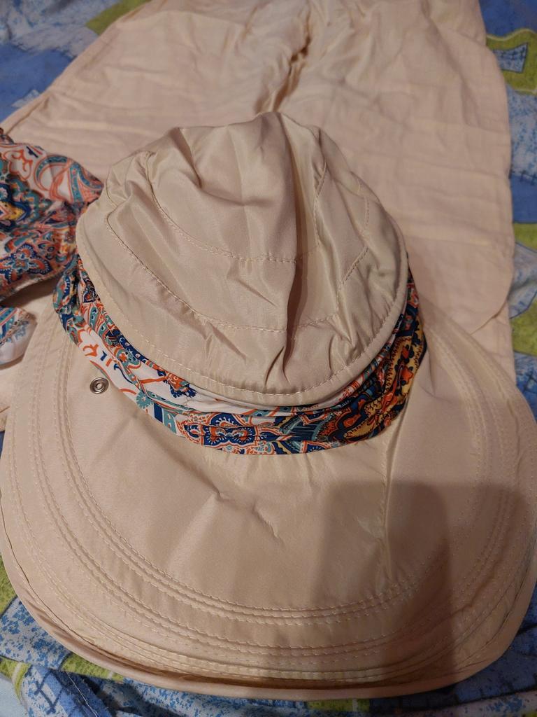 Color bright saturated Two in one - a visor with a zipper and can be unfastened to wear in different ways and a scarf is fastened so that the shoulders do not burn Sewing neat on counting three threads