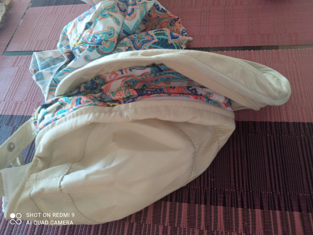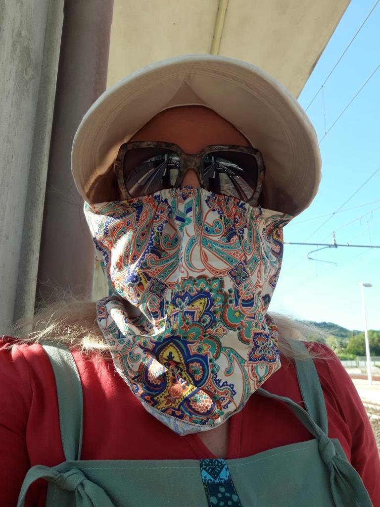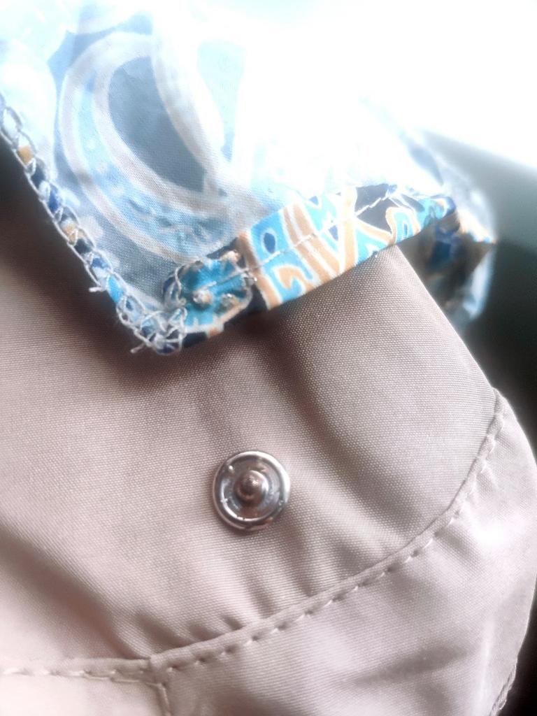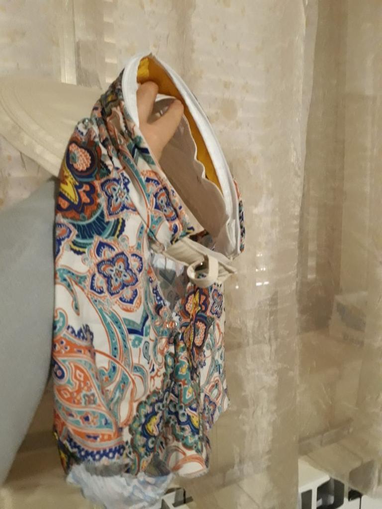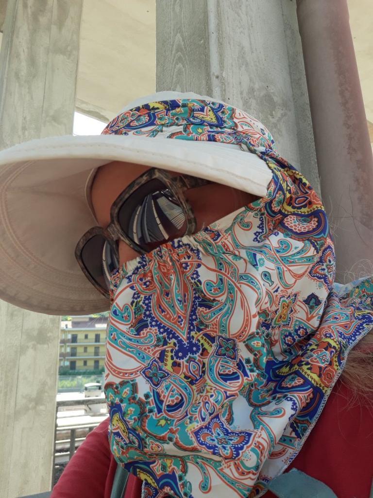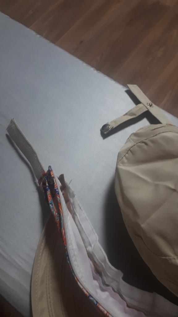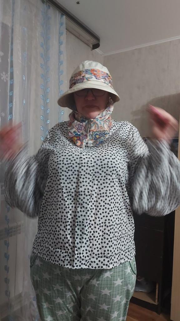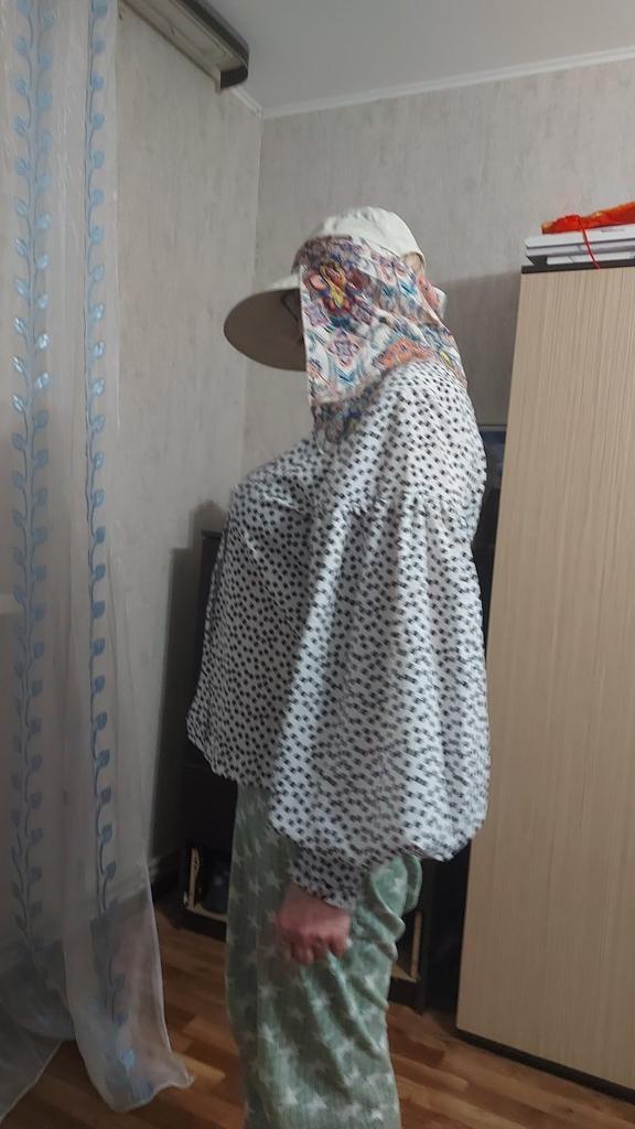 Color bright saturated Two in one - a visor with a zipper and can be unfastened to wear in different ways and a scarf is fastened so that the shoulders do not burn Sewing neat on counting three threads