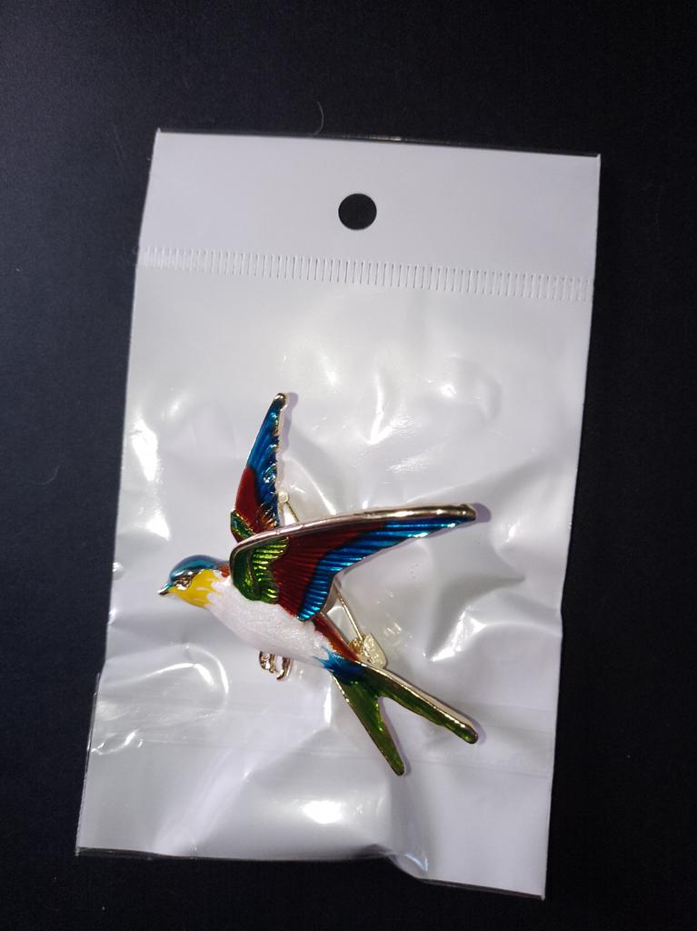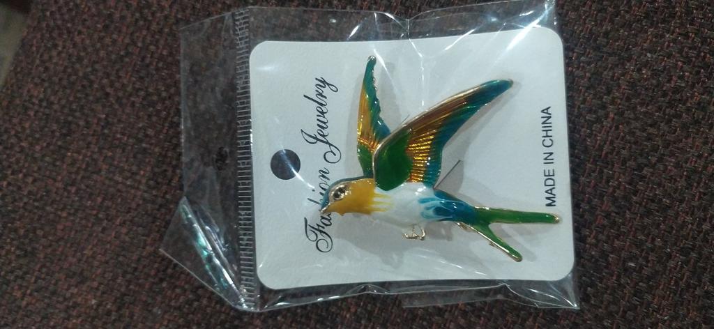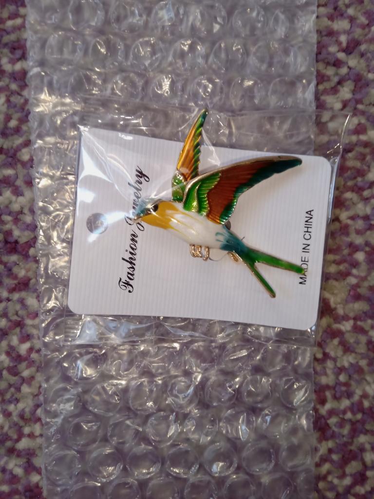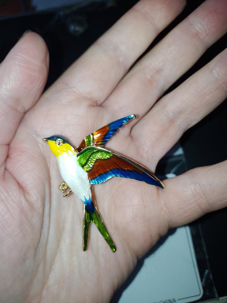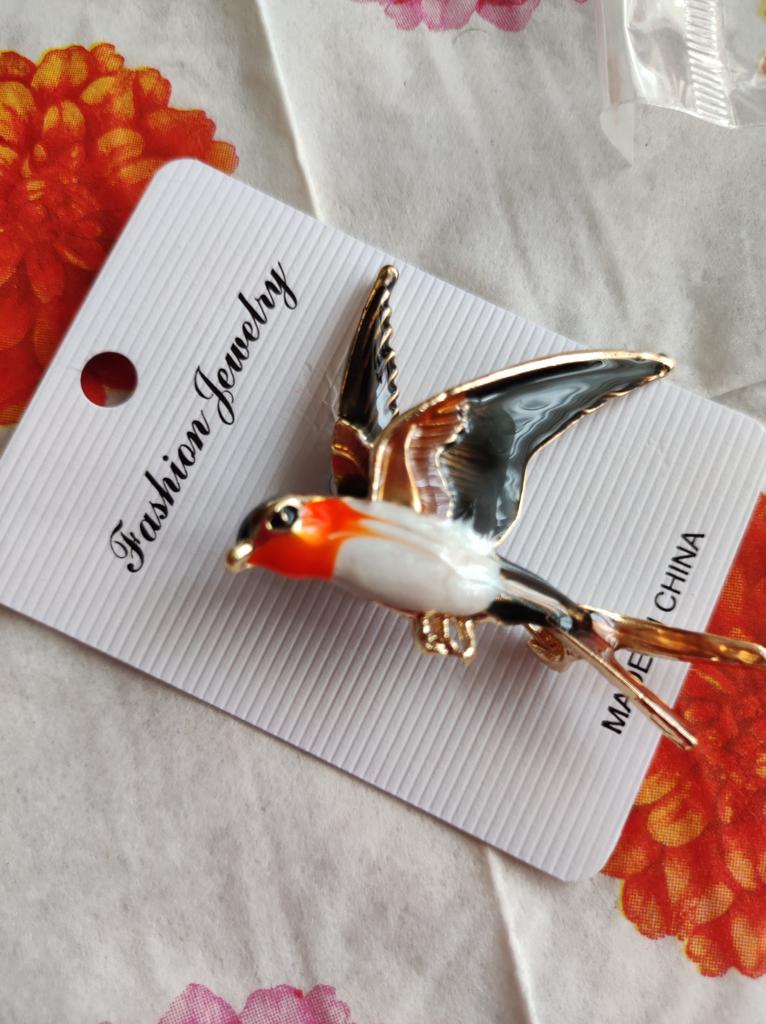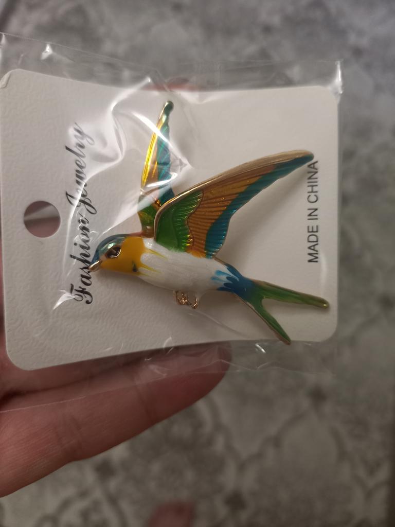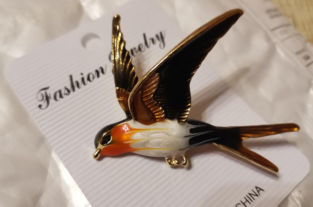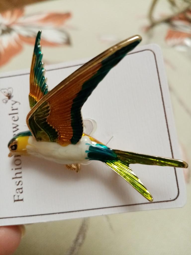 I received the parcel in a month. 🐢 The arrival at the point of issue was announced by sms 📲 Packing for 5 + .👍🌷 In addition to the fact that the envelope was made of air-bubble film, the seller additionally wrapped the jewelry in the same protective film.🌷👍 The brooch in the form of a swallow 🕊 looks very attractive. It will be a good addition to a coat, jacket or blazer.👗. For thinner and more delicate fabrics, the brooch will be heavy The decoration is well made, only in one place there is an uneven application of enamel, but it is visible only on close inspection. When she attached the jewelry to her clothes, the swallow looked perfect I definitely liked the decoration I recommend both the product and the seller. 💯 If the comment was helpful, please 💙