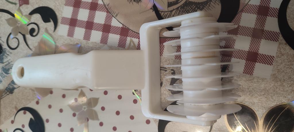 It arrived intact, odorless, of normal size and made of high-quality plastic (I was afraid that it would come, so to speak, "toy"). After using the supplement. I will add: it does not cut through the dough well, there are many uncut areas. It is necessary to press hard, but it will not work on small pieces. A good net came out the second time