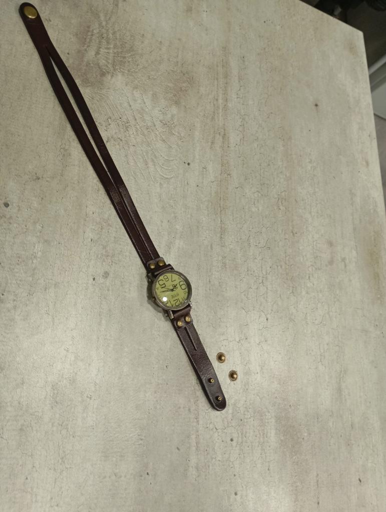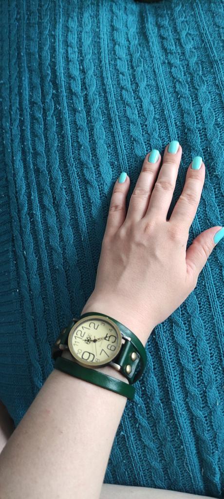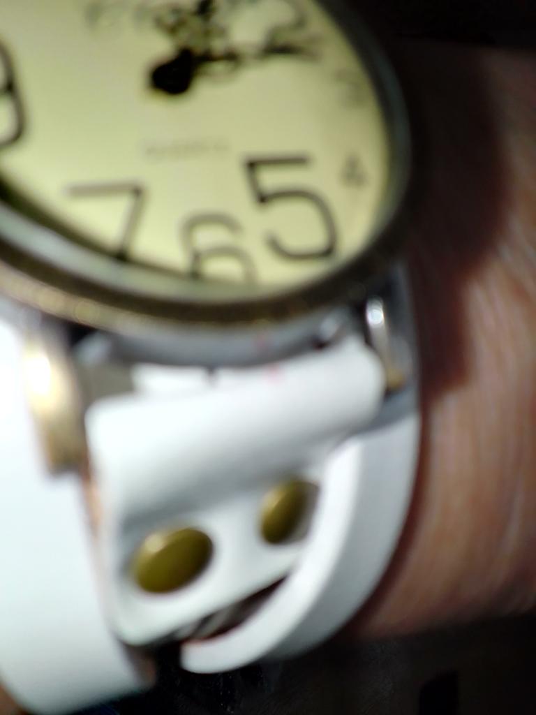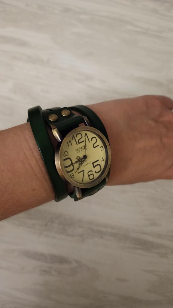 Disappointment. The dial color is light green, not yellow. This is fundamental. The strap is stiff, maybe it will soften. The first button doesn't hold, and the watch sits differently on it.