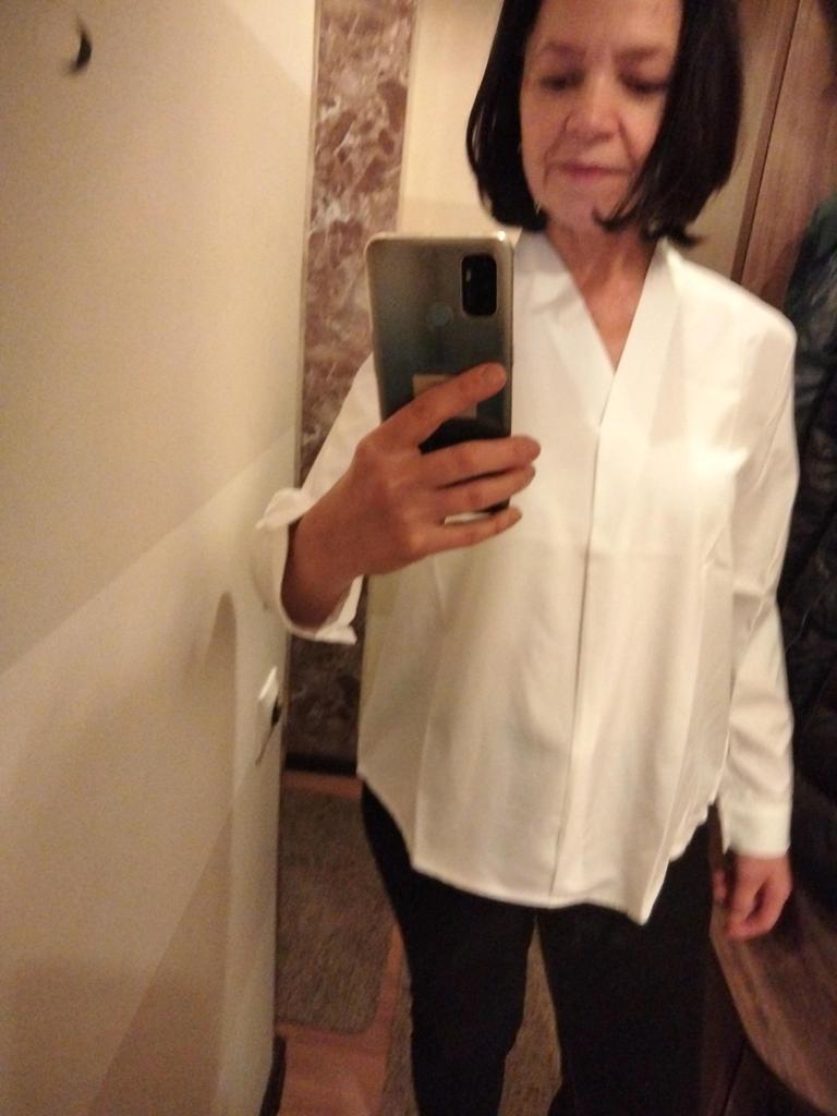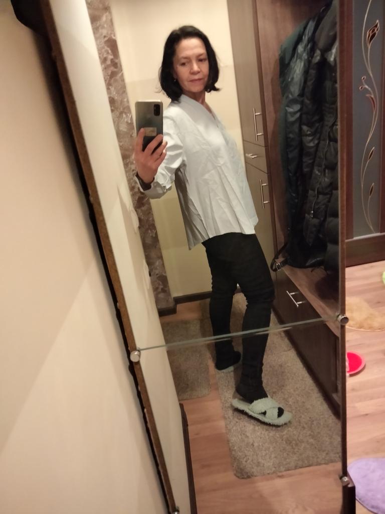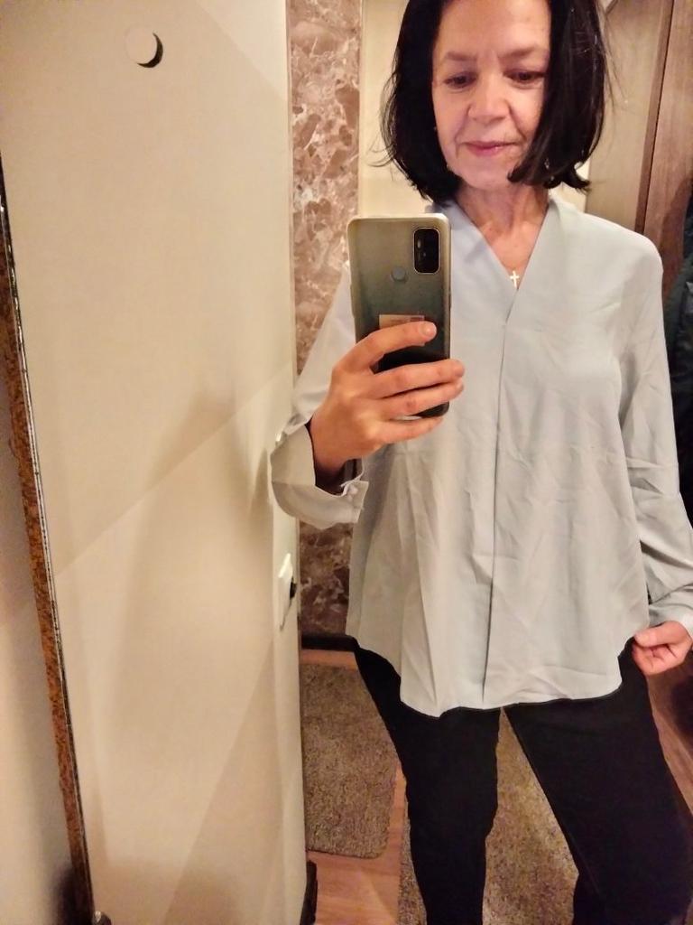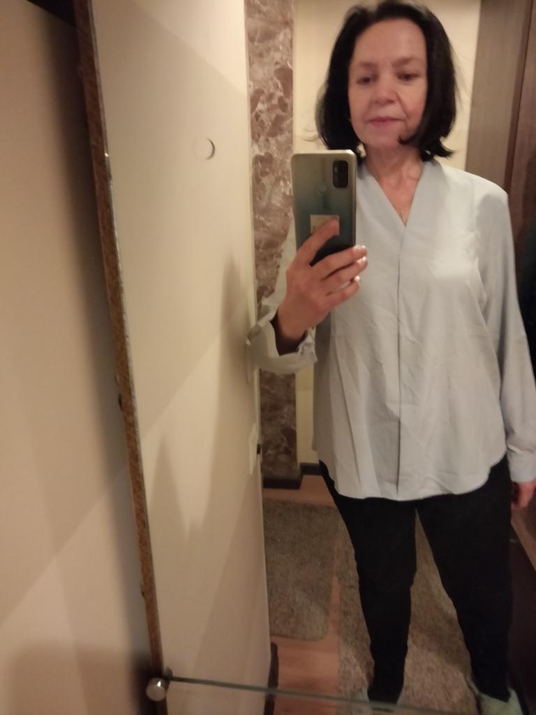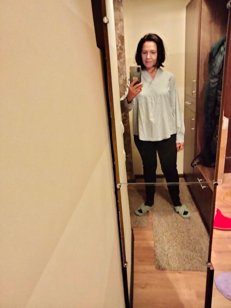 I really liked the blouse. Elegant, stylish. I really like this style - the main thing is to guess the size. I succeeded. Ordered XL for parameters - shoulders 39 cm, chest 88 cm, waist 74 cm, hips 96 cm, arms 58 cm. The quality of the product is good, polyester, although electrified, but soft and pleasant to the body. The color is pastel gray, very gentle. Satisfied with the blouse. Very. Thanks to the seller and thanks to Joom.