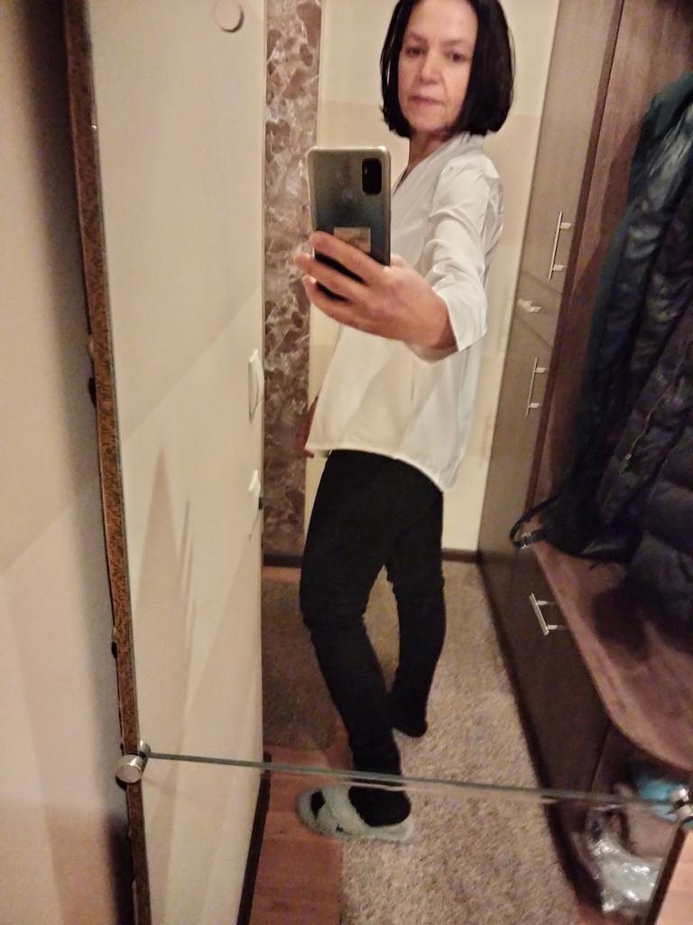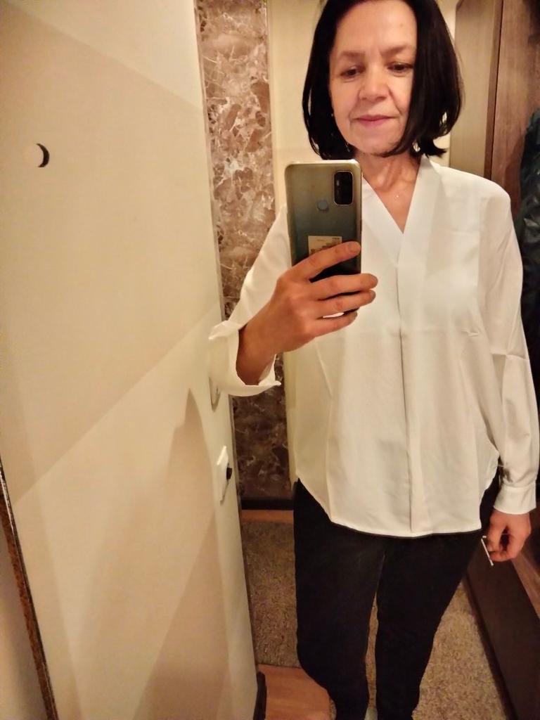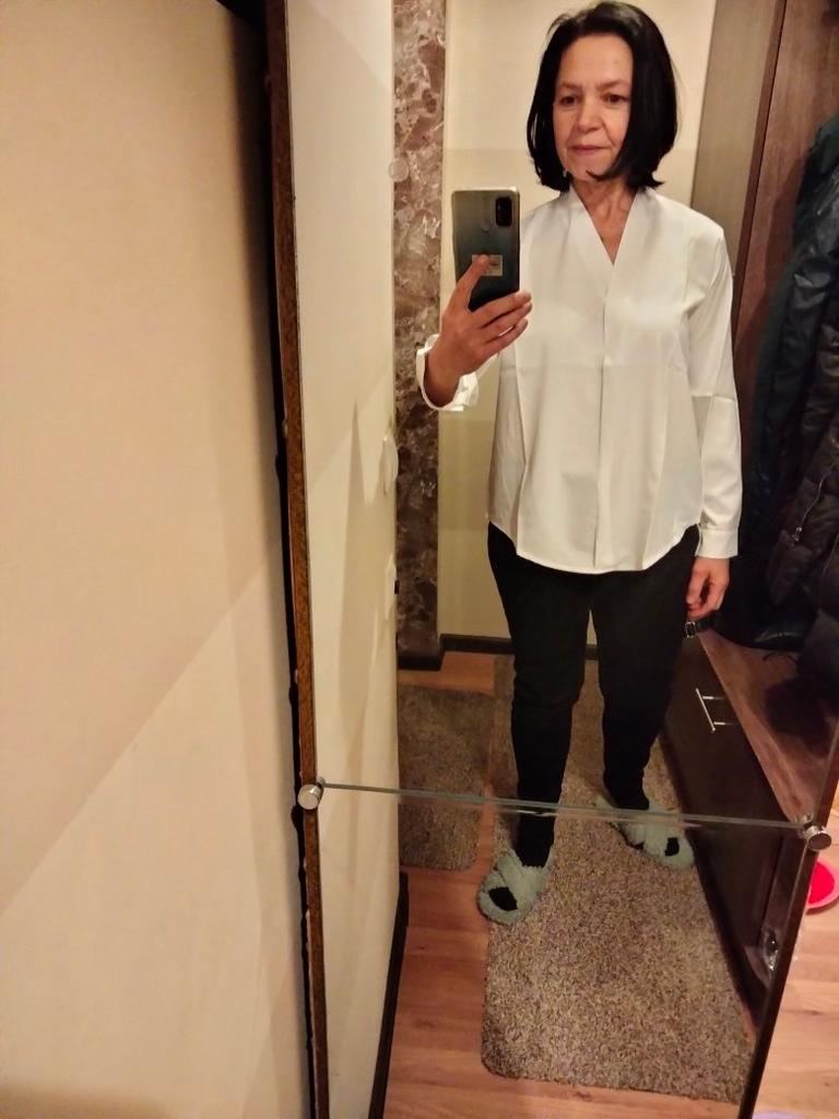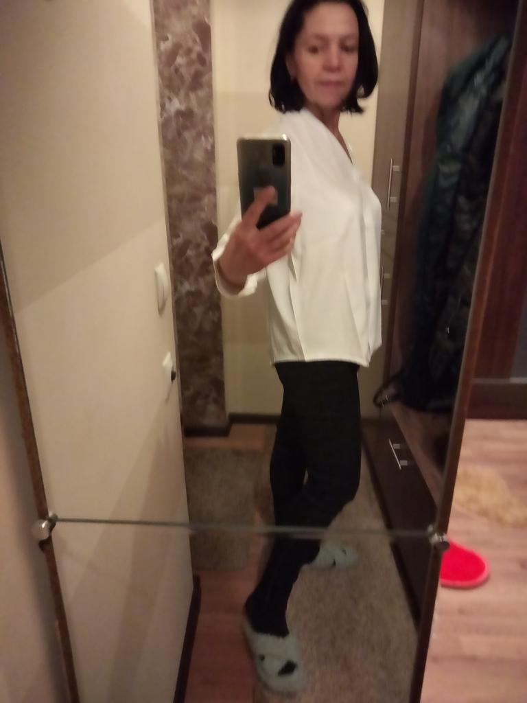 I liked the blouse. The sewing quality and the fabric are good. It is polyester and electrified (requires antistatic), but the fabric is not tin, but soft, pleasant to the body. Size XL is suitable. My parameters are 39 cm shoulders, chest 88 cm, waist 74 cm, hips 96 cm, arm 58 cm. . Very satisfied. Thanks to the seller and thanks to Joom.