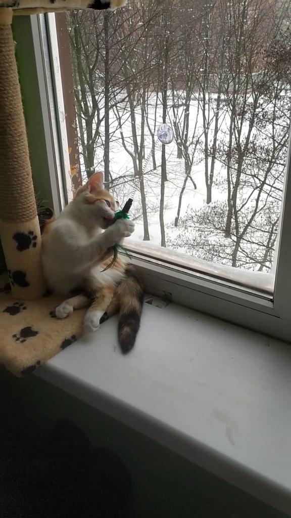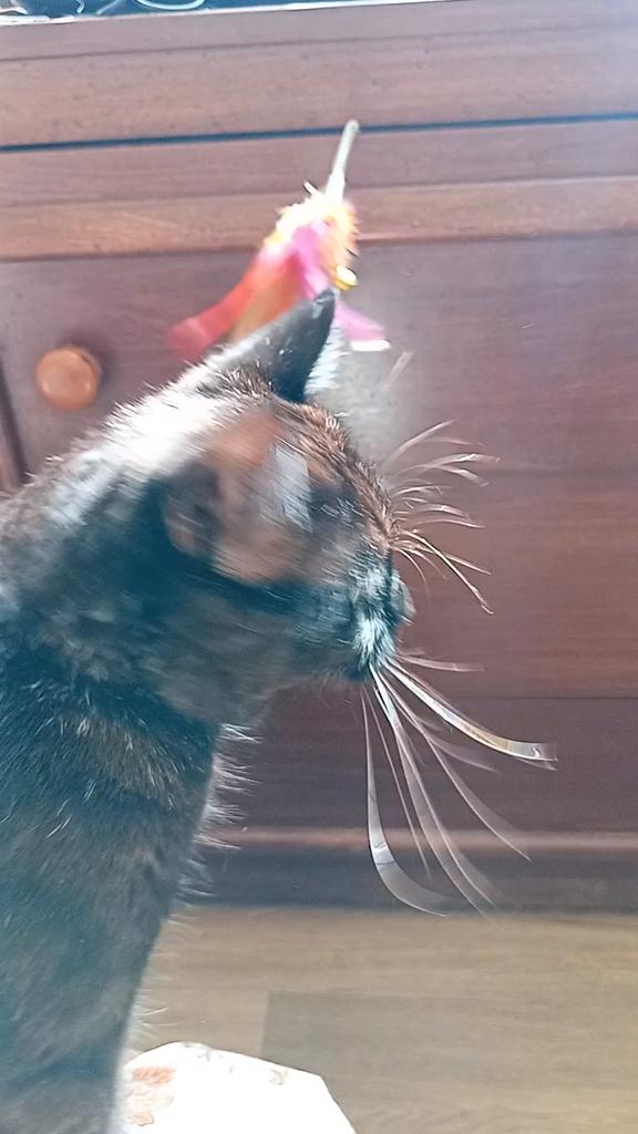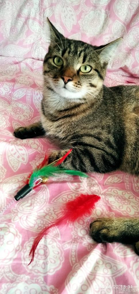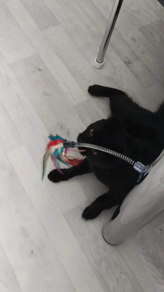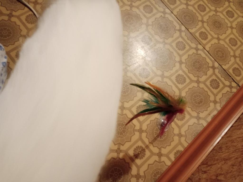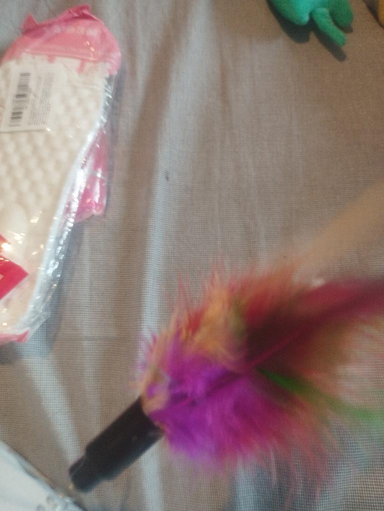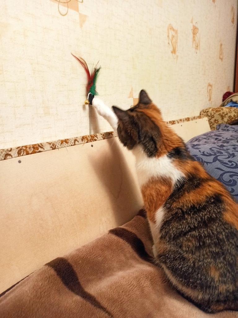 The cat is delighted, it sticks normally, the feathers flew out a little during the game ๐