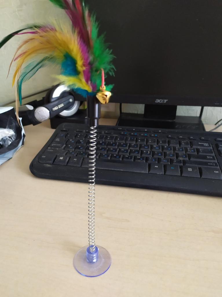 The spring does not stay in the suction cup at all, and the feathers do not stay in the holder. Cat for five minutes