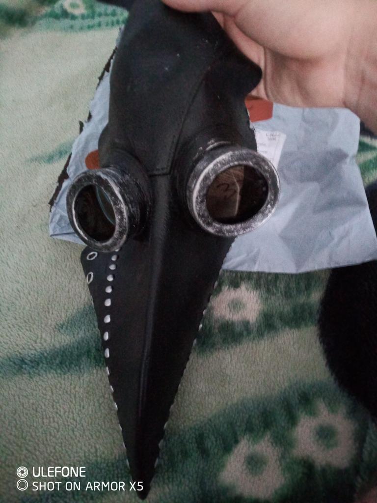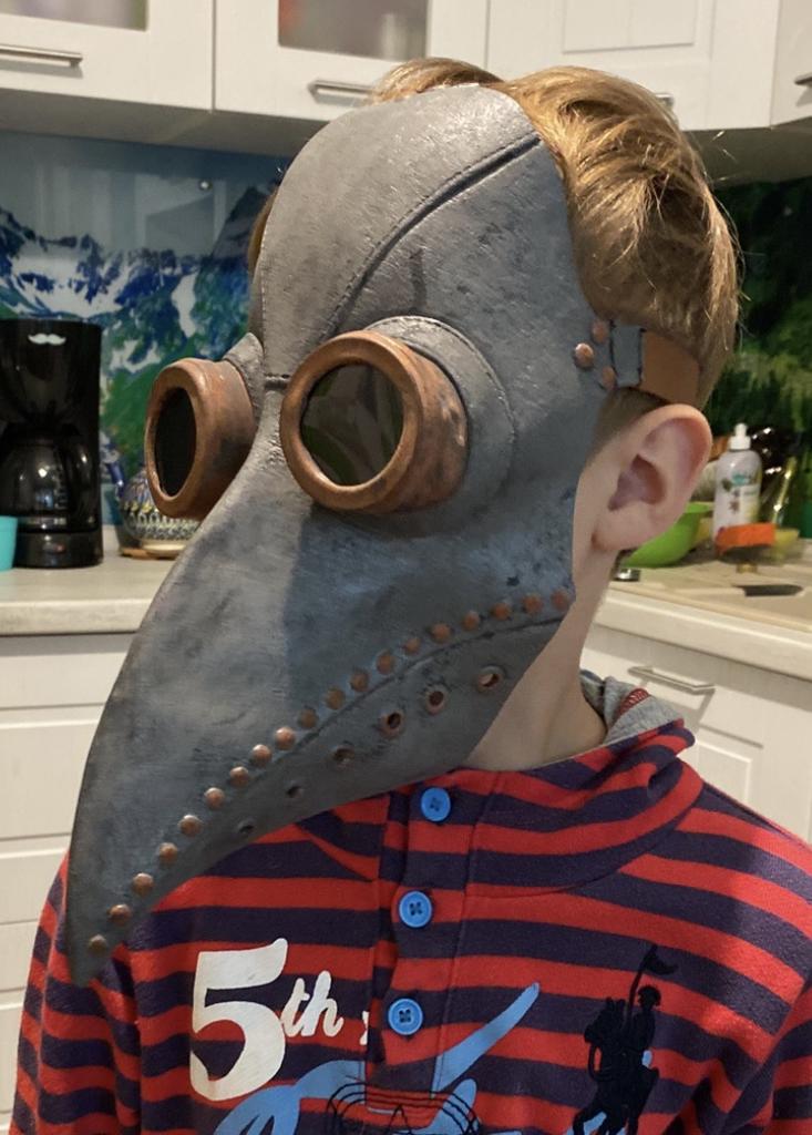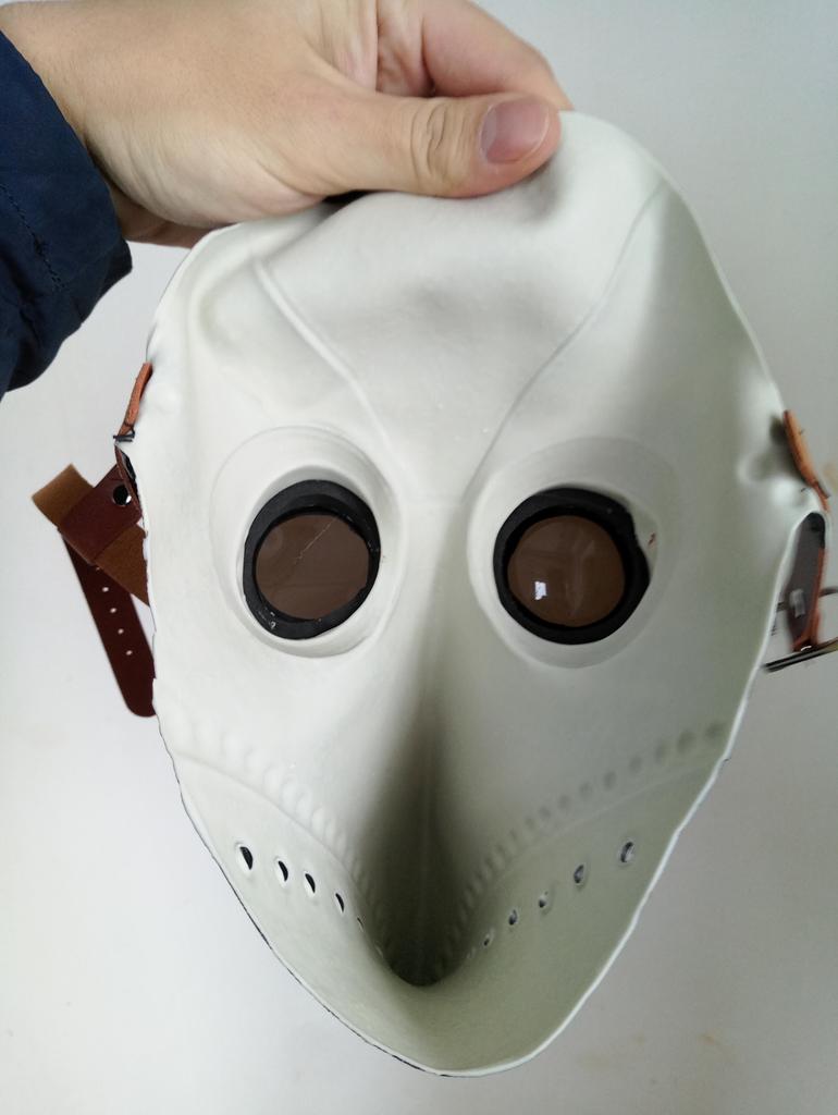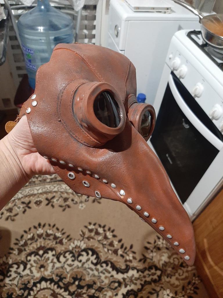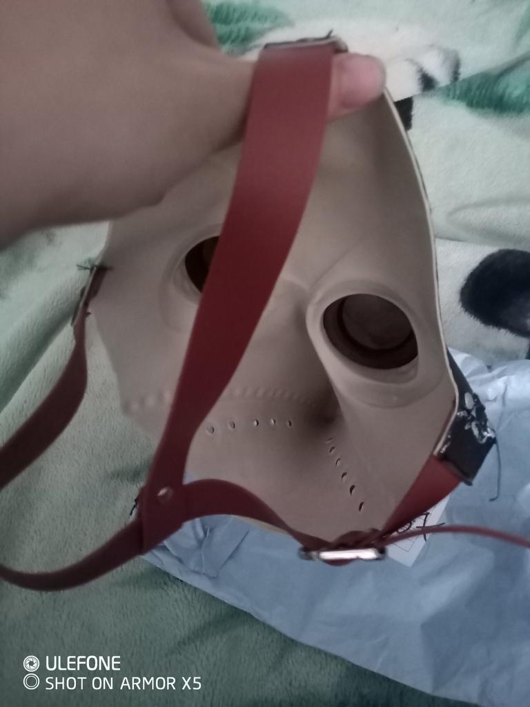 The mask is made of rubber and smells like rubber, it is painted with high quality and looks like it is made of leather with metal. It is attached to the belt at the back. Quite high-quality. The child is delighted, although the mask is designed for an adult.