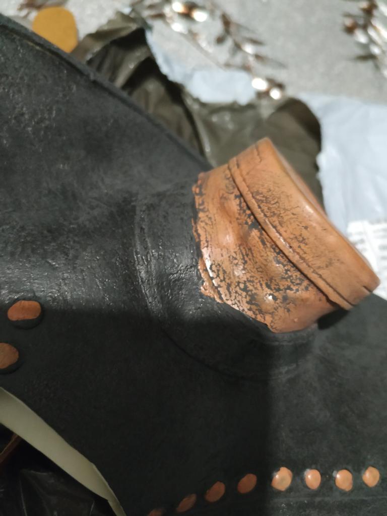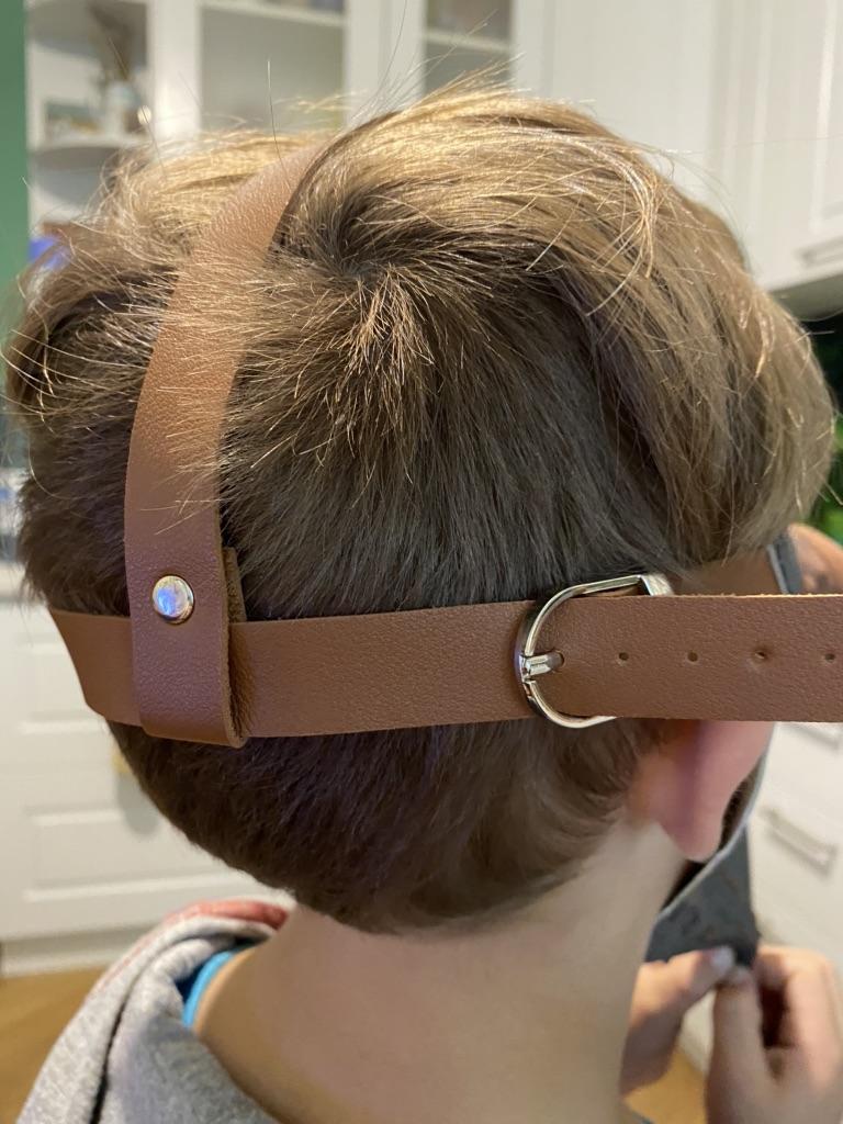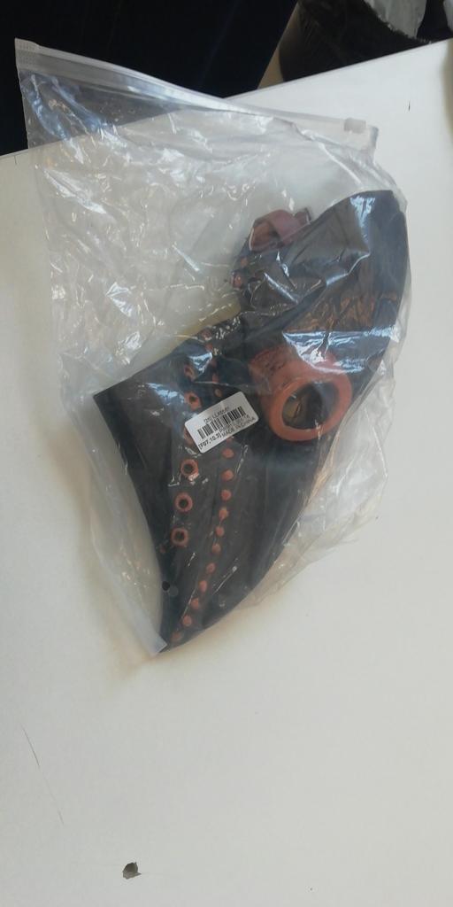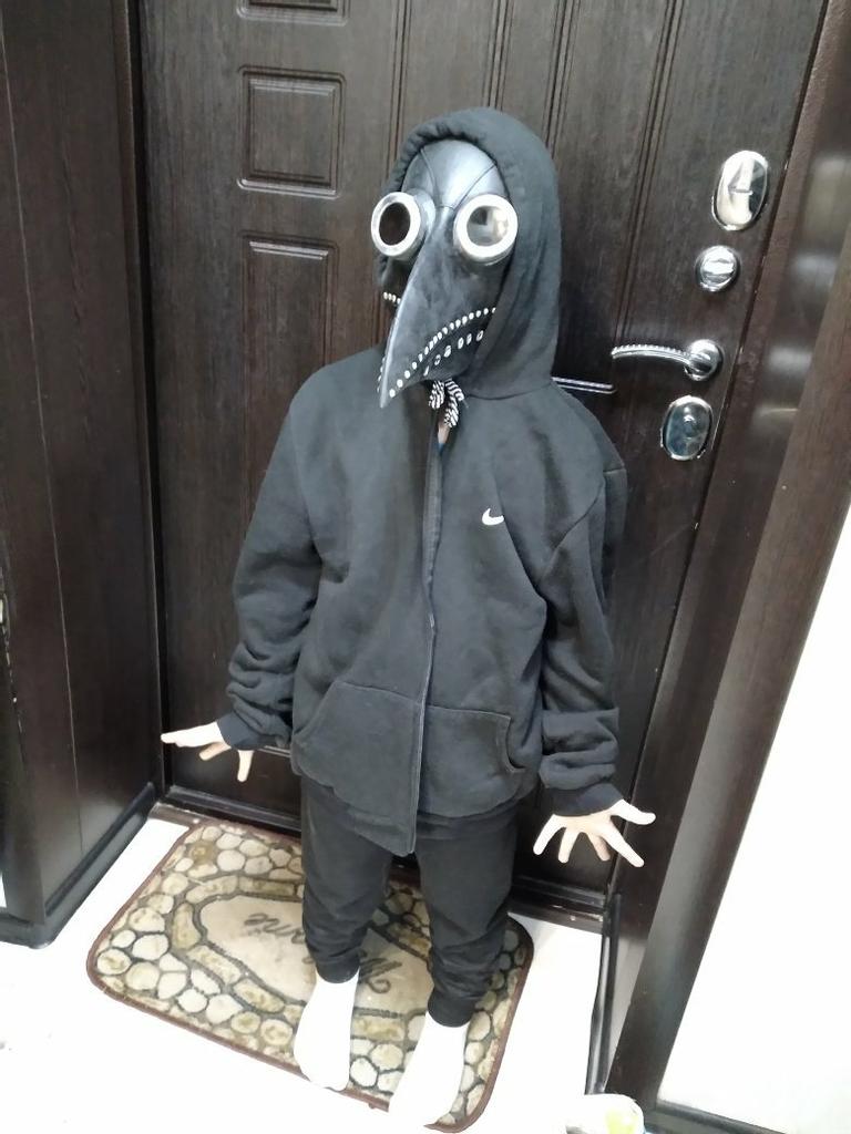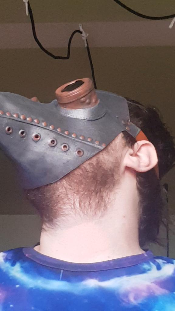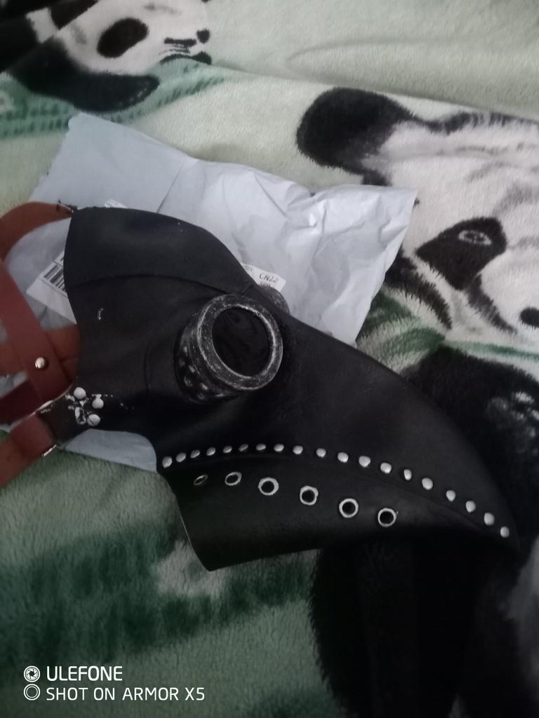 The mask is made of rubber and smells like rubber, it is painted with high quality and looks like it is made of leather with metal. It is attached to the belt at the back. Quite high-quality. The child is delighted, although the mask is designed for an adult.