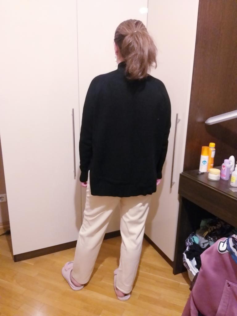 The material is soft, doesn't smell, I haven't washed it yet. Unfortunately, it doesn't sit as loosely on my body as it does in the picture. Hopefully it doesn't get any smaller with washing. I prefer a bigger winter jumper, there was only one size here, too bad.