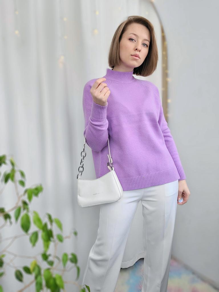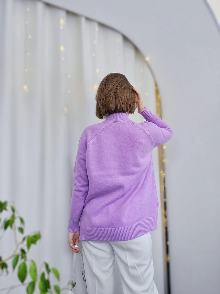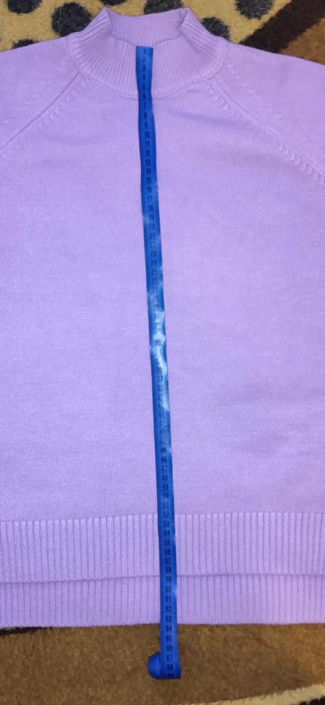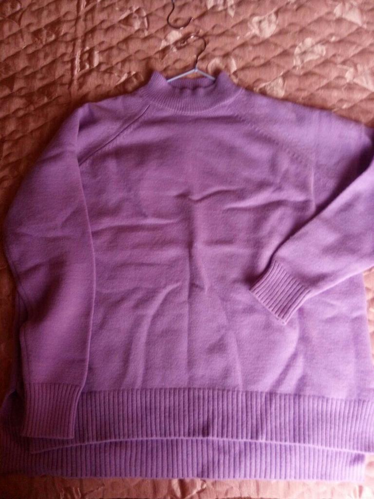 Nice warm sweater. The sleeves are a little narrow, otherwise loose, beautiful. The color is more lilac than purple.