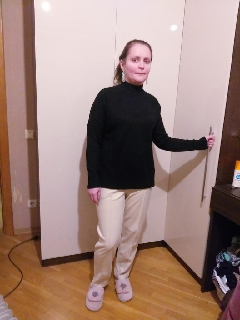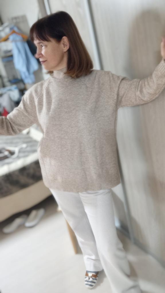 Good sweater, warm) the quality is good for size 44 is excellent! At 48, it fits a little and the collar squeezes the neck, not very comfortable. I took my daughter in size 44, my daughter is happy)