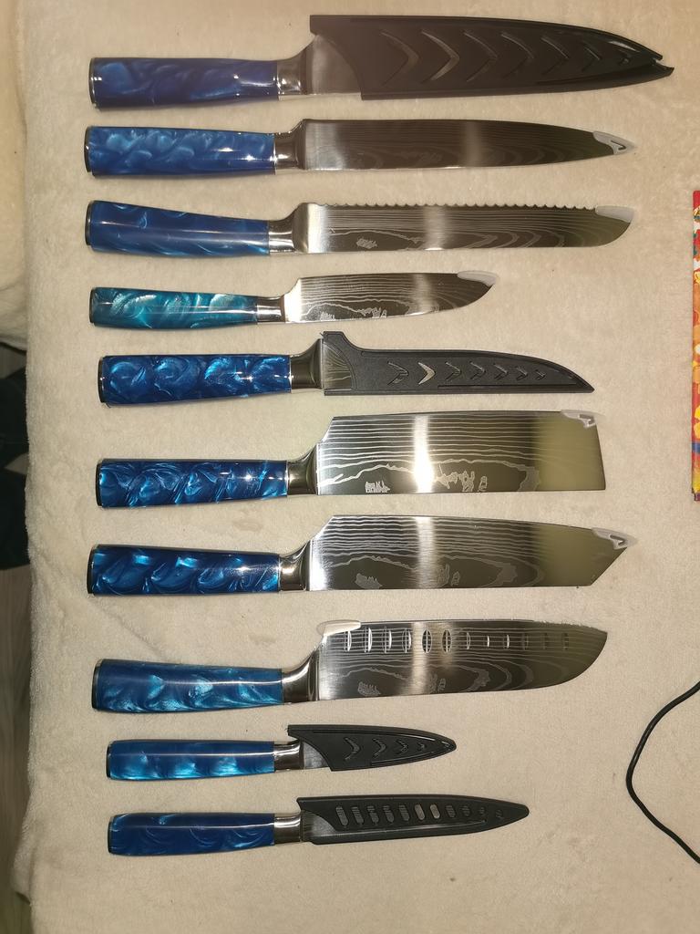 Stainless Steel Knives 10 Pcs Set Imitation Damascus Pattern Santoku Kitchen Knives Cleaver Slicing Knives with Knife Covers