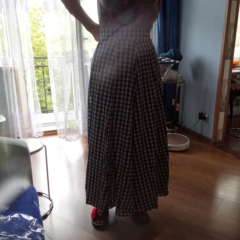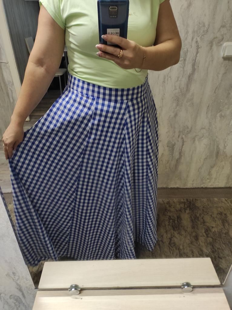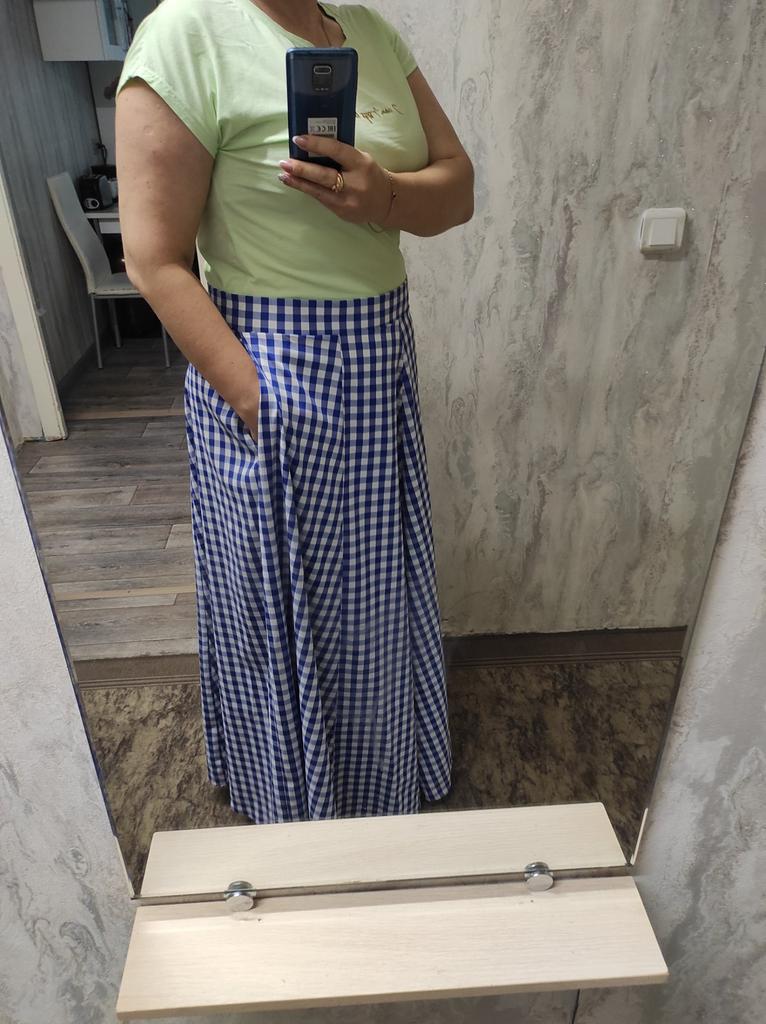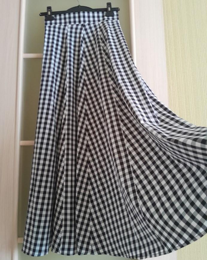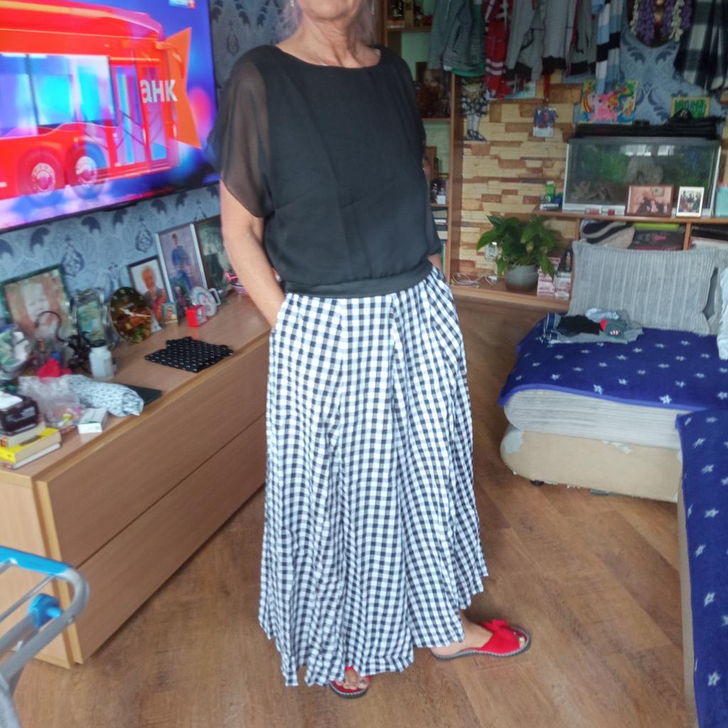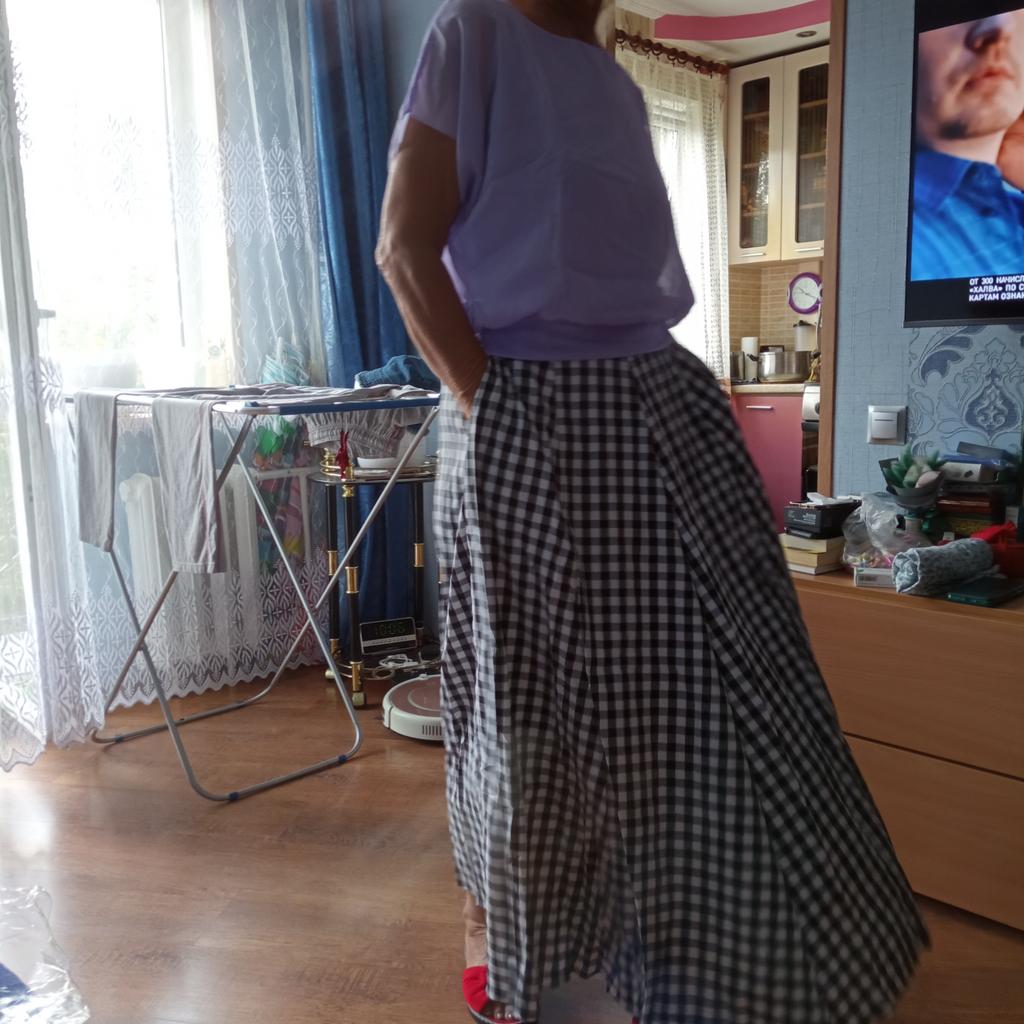 Beautiful wide four-piece skirt. Looks beautiful. Very long, needs to be hemmed by 2-3 cm.