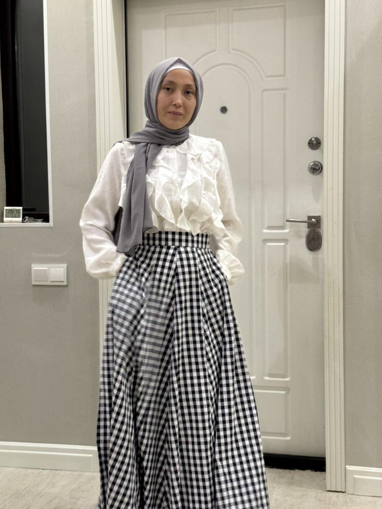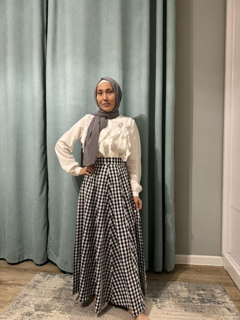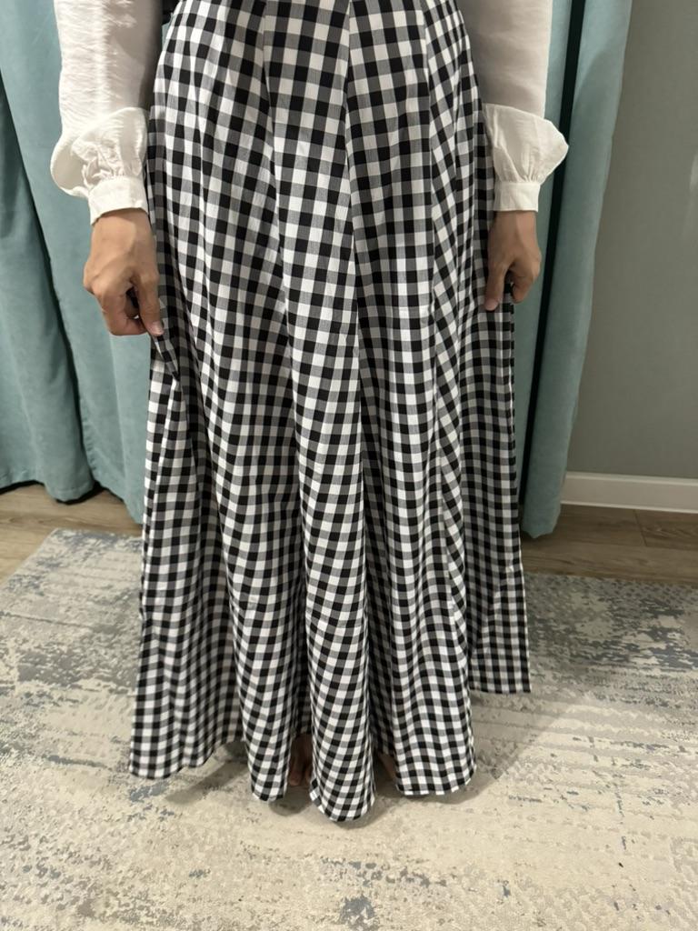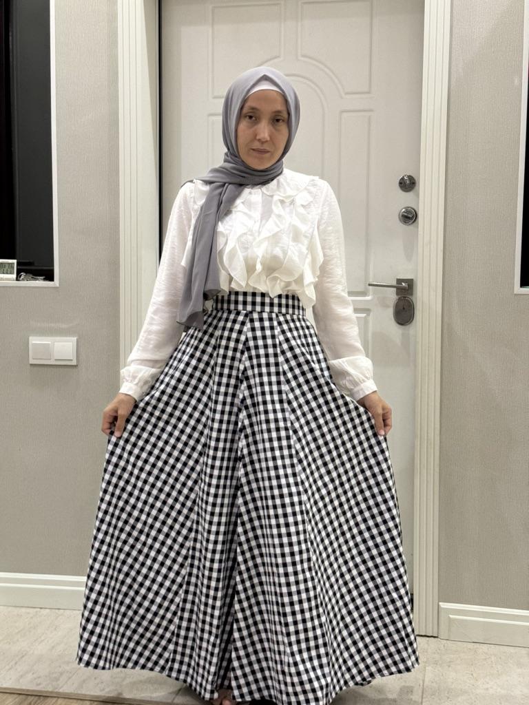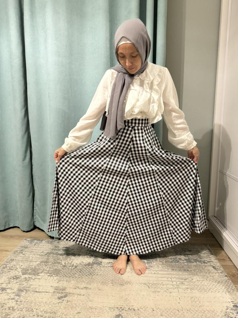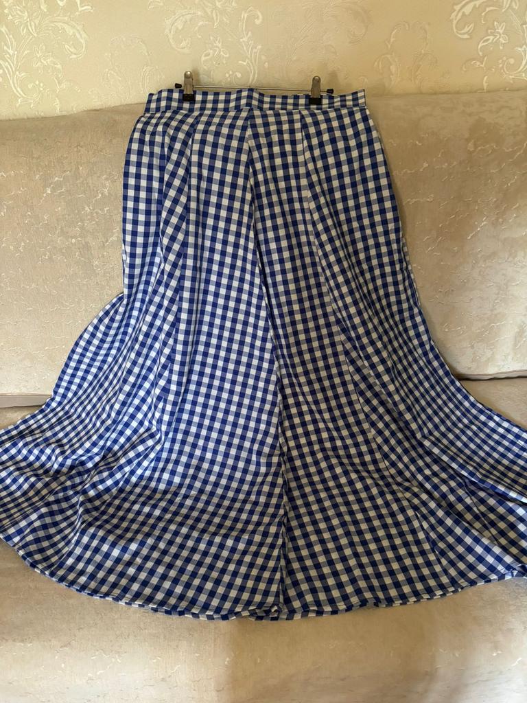 Beautiful wide four-piece skirt. Looks beautiful. Very long, needs to be hemmed by 2-3 cm.