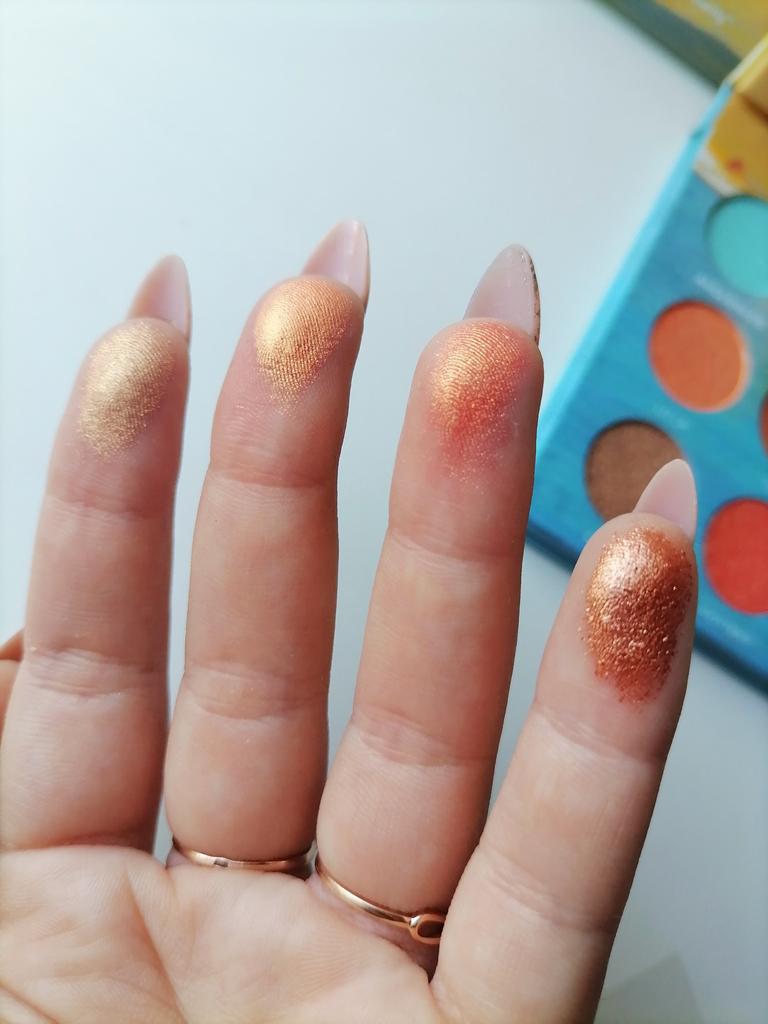 The colors in this eyeshadow palette are absolutely beautiful! π₯° The shades are also very smooth and super easy to apply and blend. The blue is definitely my favorite π€© It's the perfect daytime blue with lots of pigmentation but not tacky. There is also little to no fall out on most of the shades. This is definitely a great everyday palette :) It was delivered to me in about six days.