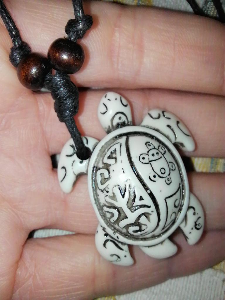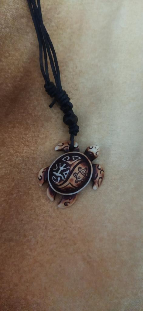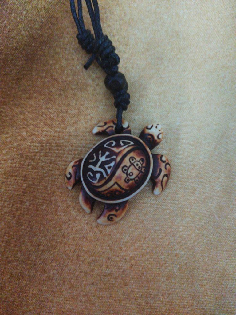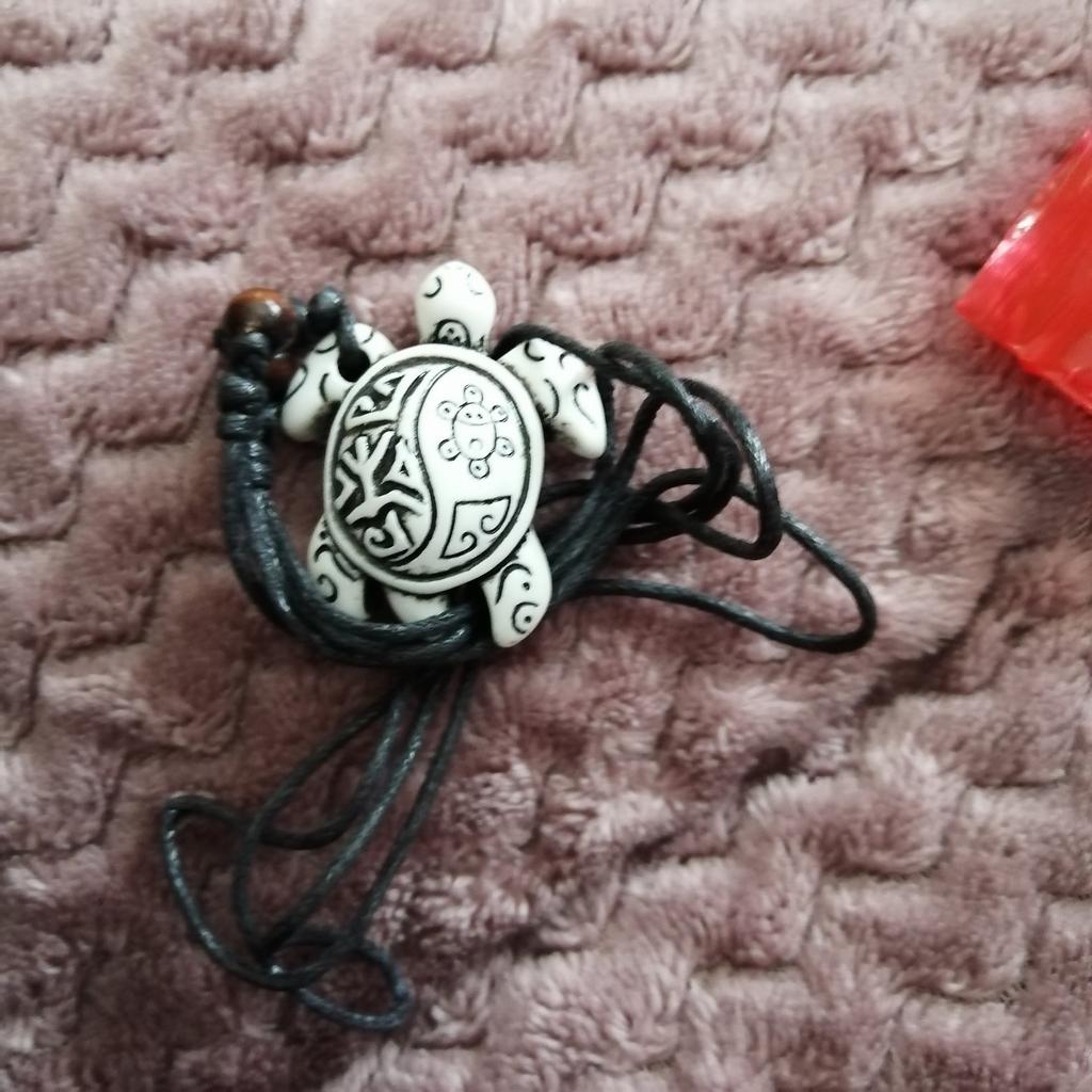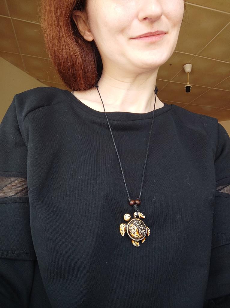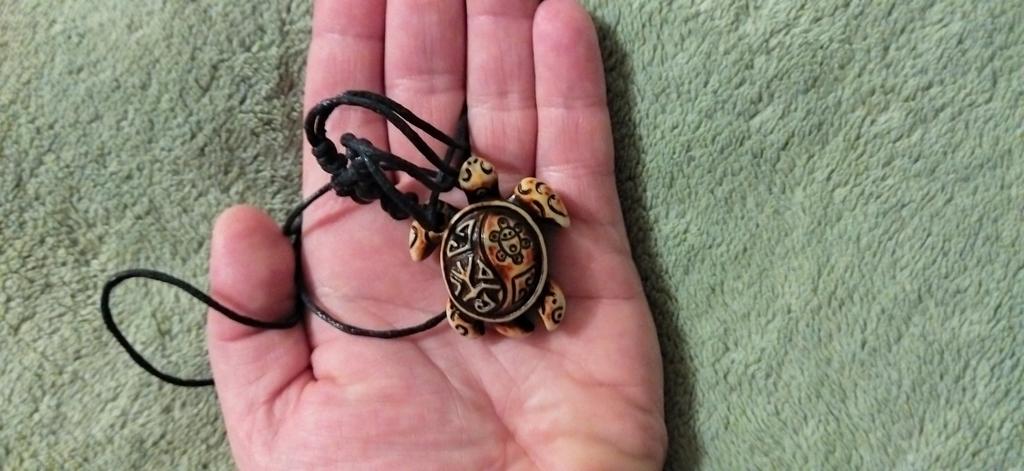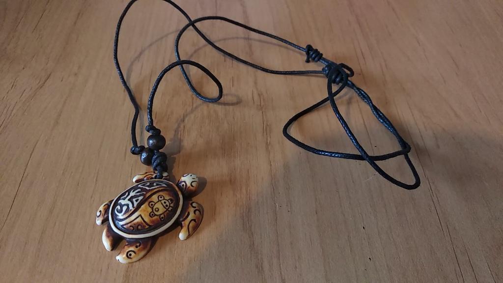 Turtle pendant on an adjustable strap. The decoration is symbolic, made of plastic, light, the strap is certainly not made of leather (as indicated in the description). The pendant looks original, attracts attention. The purchase is satisfied. Thank you!