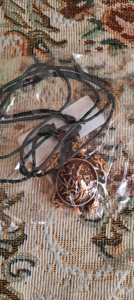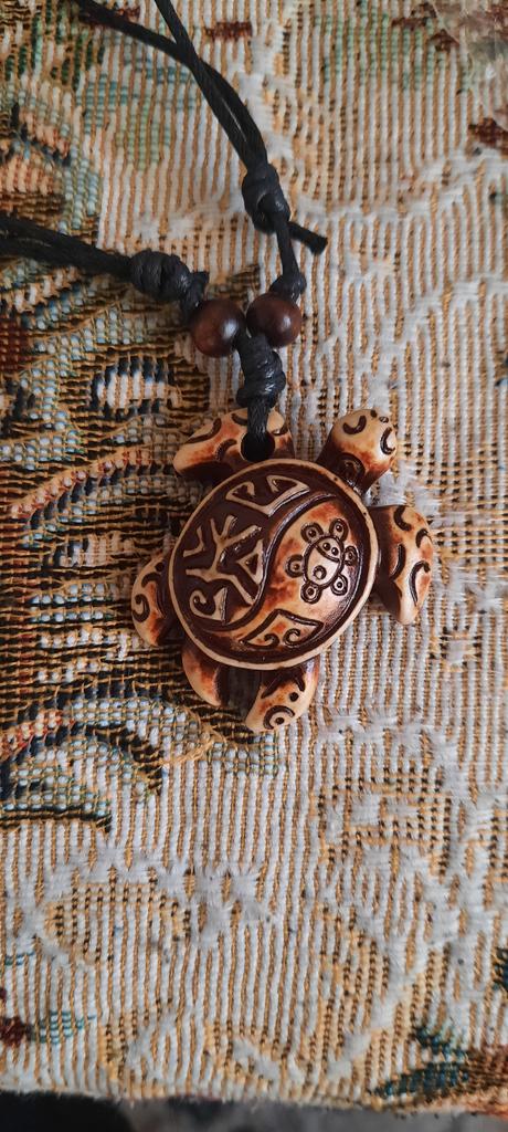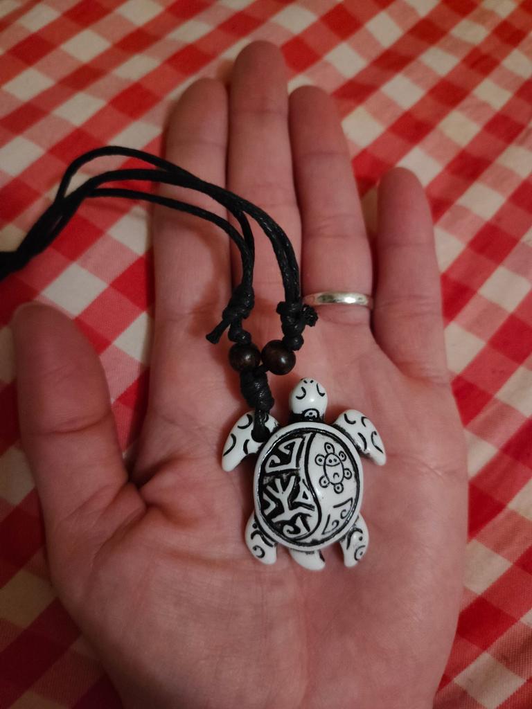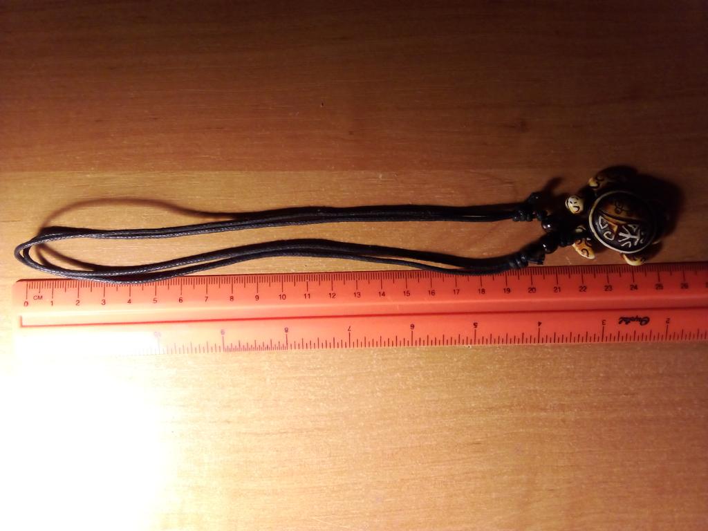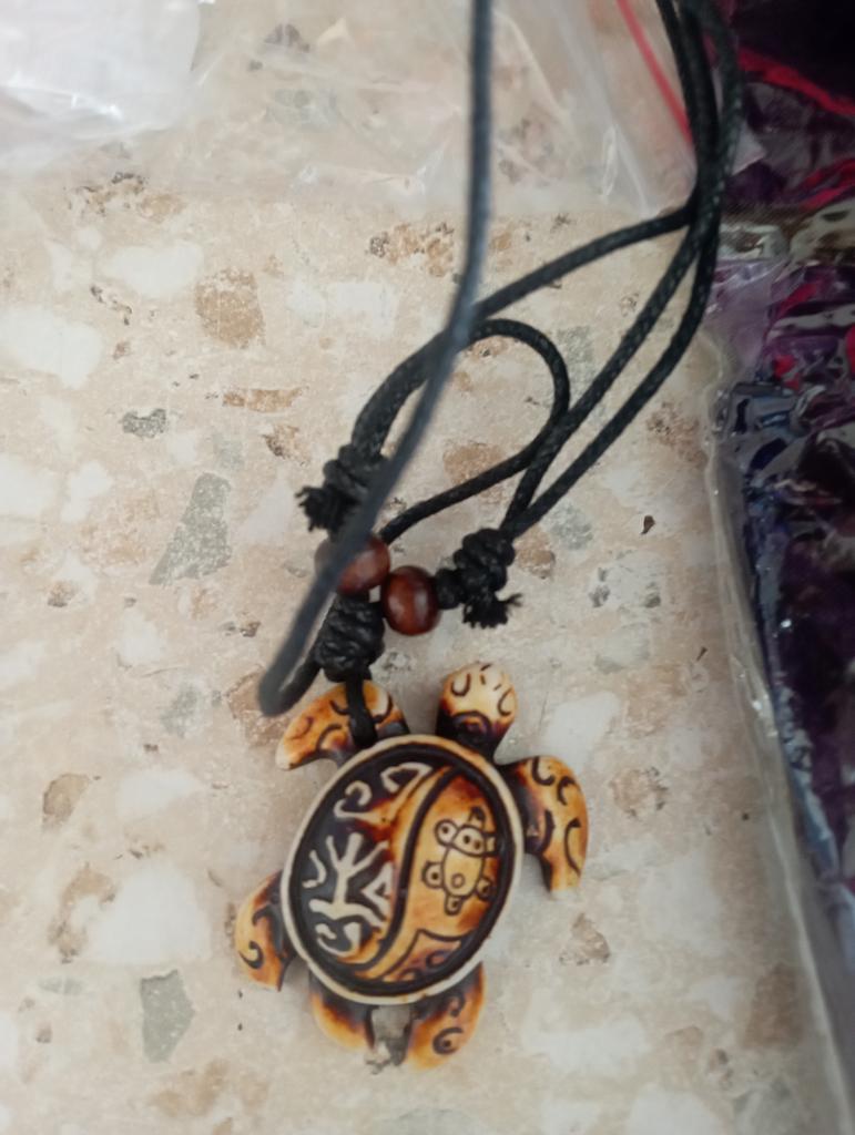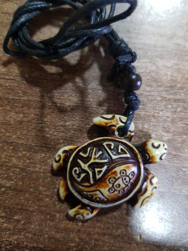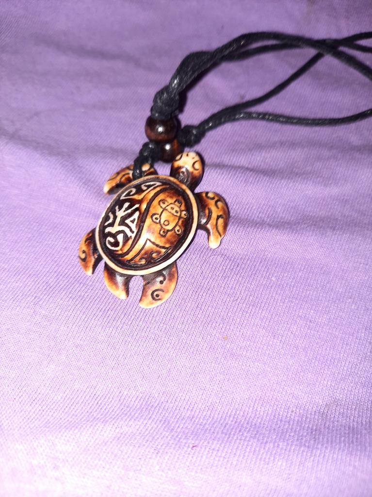 Turtle pendant on an adjustable strap. The decoration is symbolic, made of plastic, light, the strap is certainly not made of leather (as indicated in the description). The pendant looks original, attracts attention. The purchase is satisfied. Thank you!