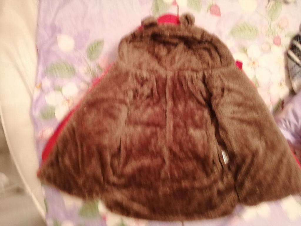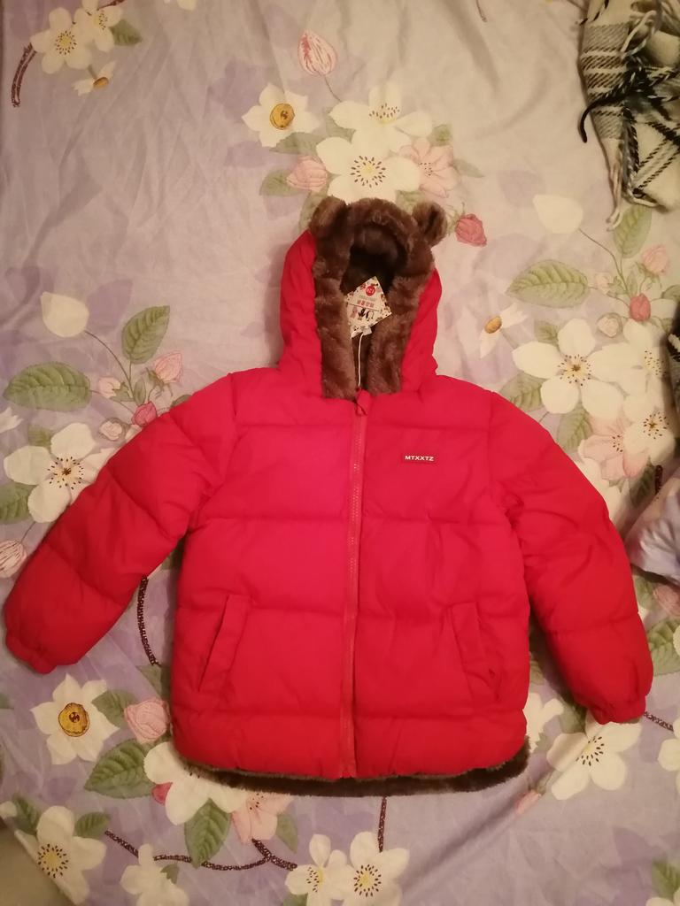 The jacket is great. Soft, warm, beautiful color. For 2 years they ordered 110 cm and it just covers the butt. High quality stitching, no smell. I recommend