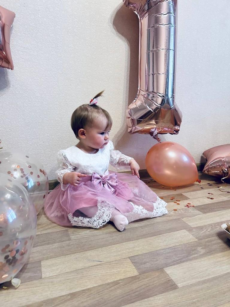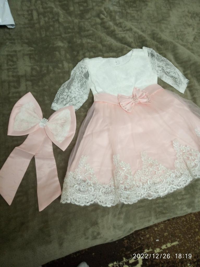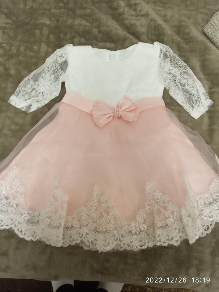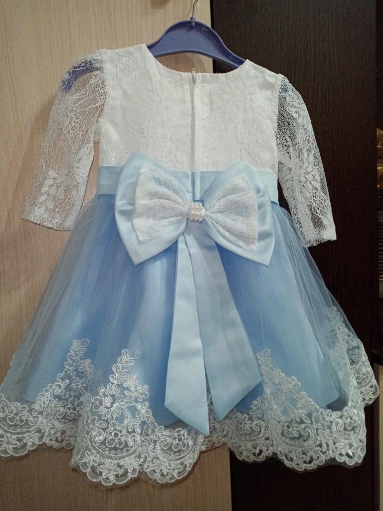 A chic dress, a little big for 9 months, I took it with extra for my birthday, I think it will be just right. The size is correct, the back bow with 2 buttons is attached to the dress. Very satisfied, worth the money. I expected the color to be lighter, but itโs still very beautiful