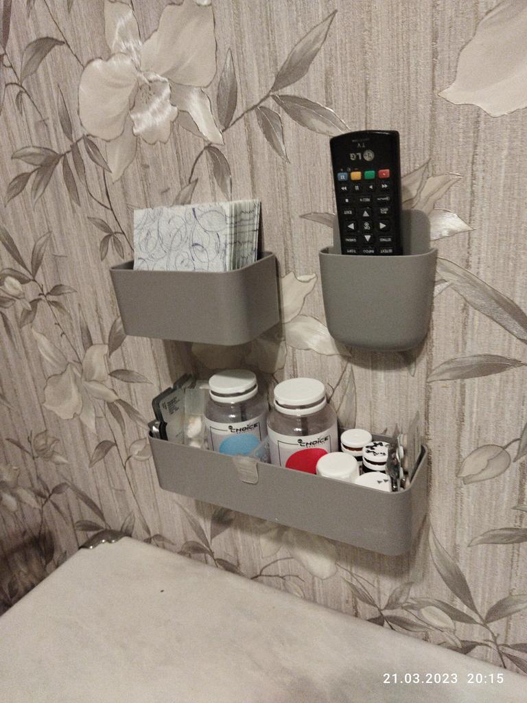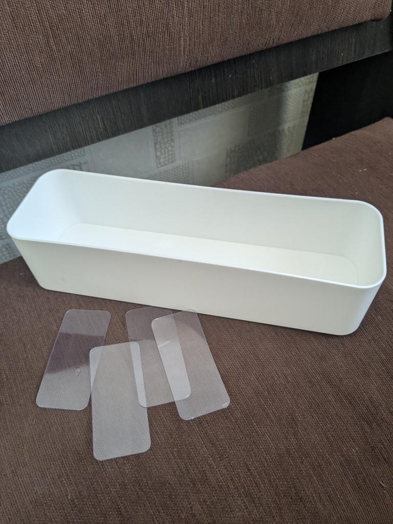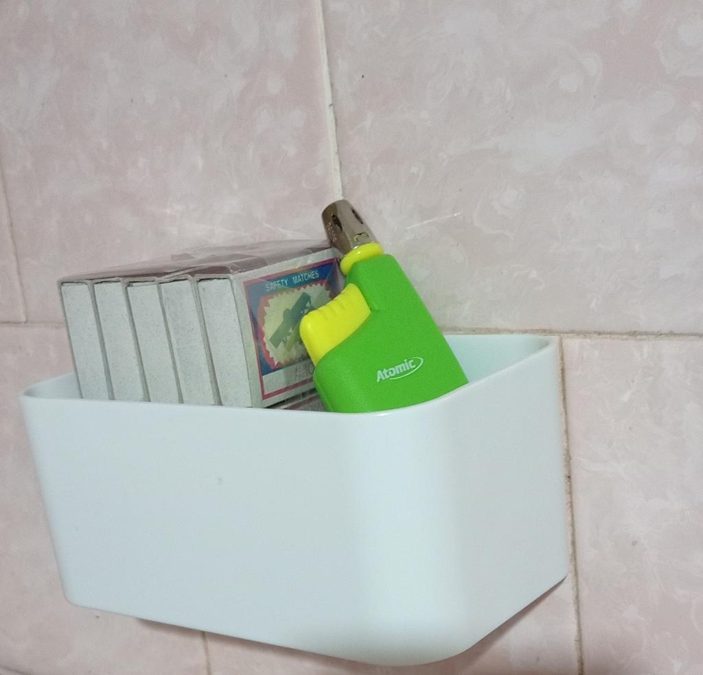 A very convenient wall organizer. Attaches with double-sided tape, which is also included. Holds tight. I took it specifically for stove lighters and matches.