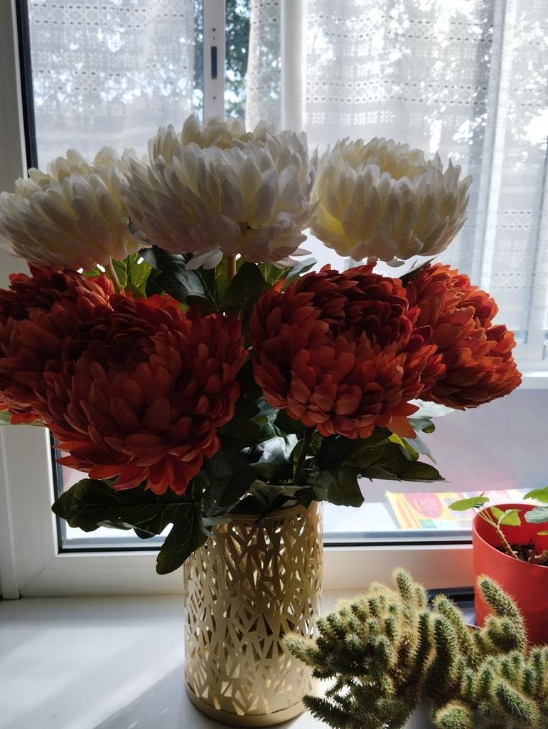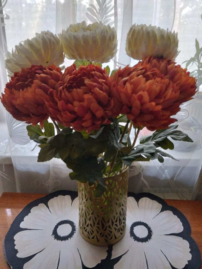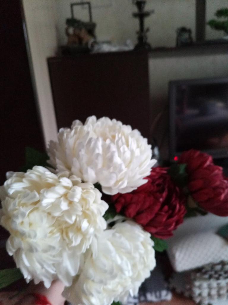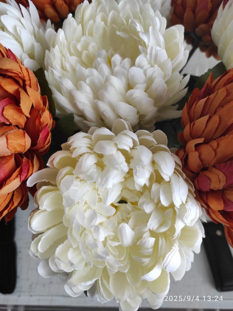 These chrysanthemums look very beautiful when you straighten them out. The quality is good π, but the presentation says they are made of silk, I can't confirm that. But I'm still very happy that I ordered them, because they are in no way inferior to the original (compared to real flowers). I don't take a photo because they correspond exactly to the picture when I ordered.