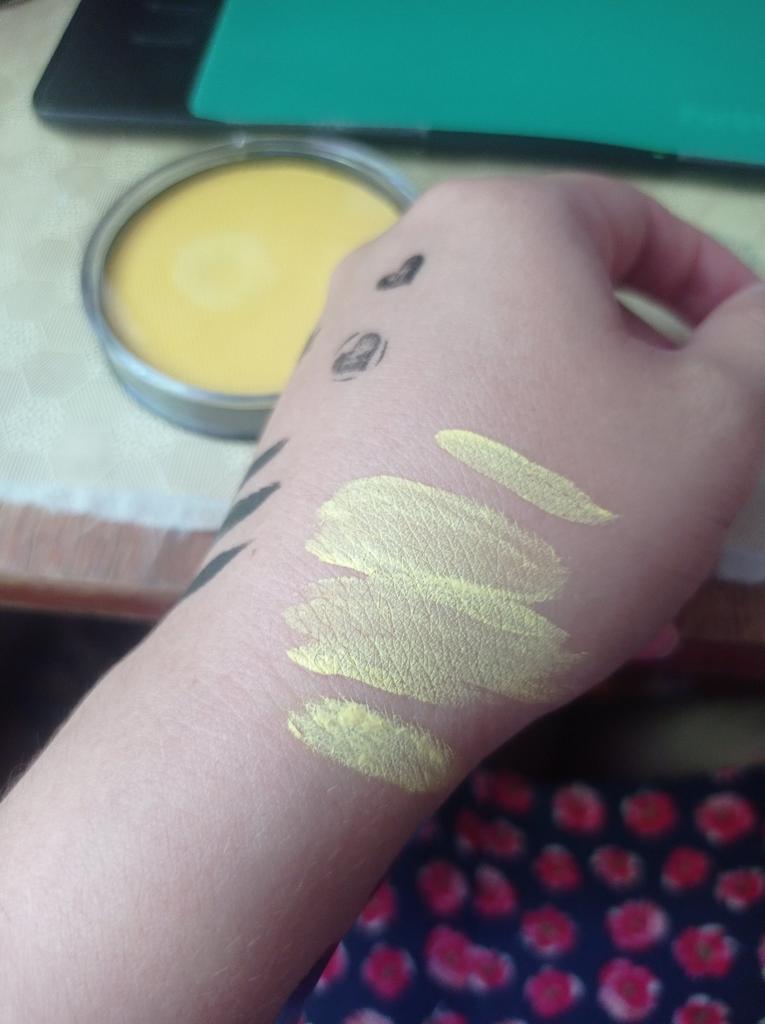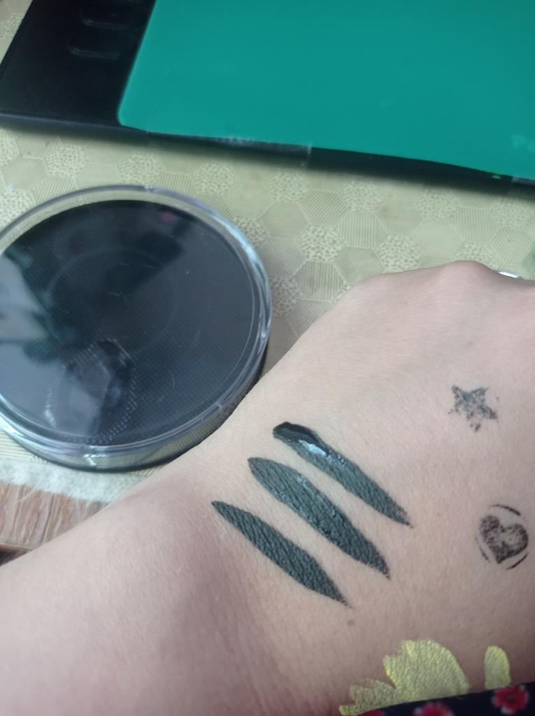 The product is good, it applies quite evenly. The main thing is not to overdo it with water and not to add too little. If it is diluted too much with water, it will be too transparent, and a dry application will leave streaks. It holds well after it is completely dry. It does not transfer onto clothing, if you touch it with dry hands nothing will happen. But it is better to check beforehand how it holds on the hand and whether there are any allergic reactions.