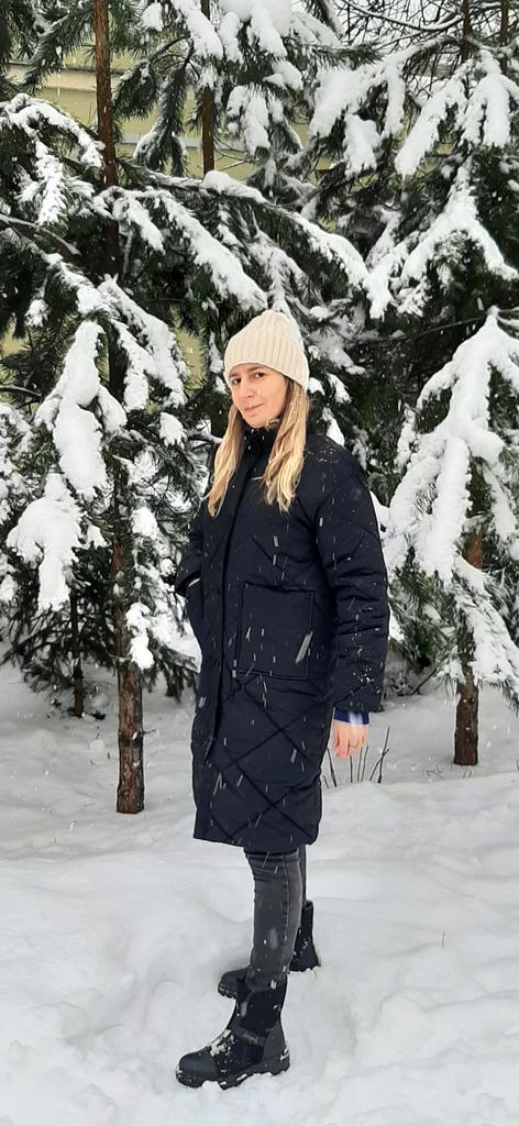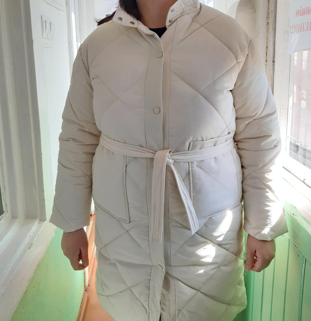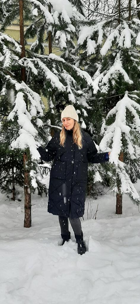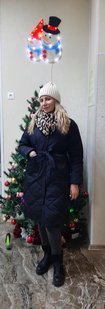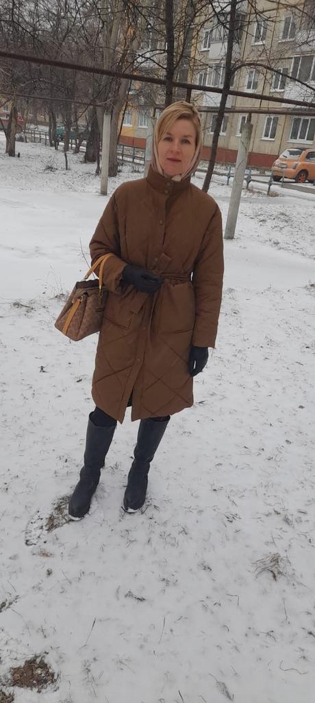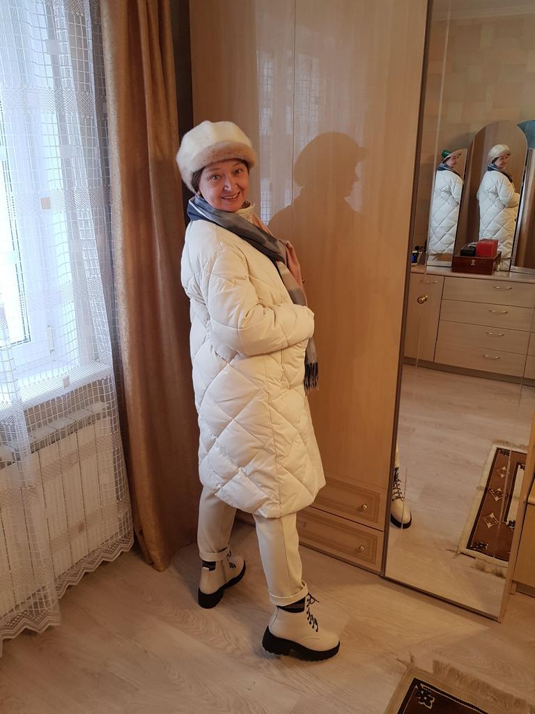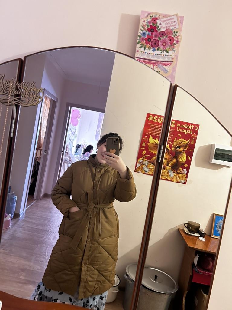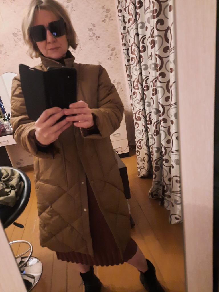 The size is right, the coat came quite quickly, thanks to the seller! Cons: the pockets are not sewn at the same level, but this is not very noticeable when you wear them; I would like the sleeves to be longer; the coat is designed for a warmer winter; the photo in the picture does not exactly correspond to the product that arrived, namely, there are no cuffs on the sleeves. Pros: price; quite high-quality material; there is no smell, as is usually the case; comes with a belt; looks stylish; a very practical and versatile coat